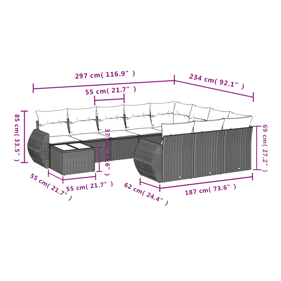 • Dimensions du coussin de dossier : 55 x 45 x 13 cm (L x l x é)