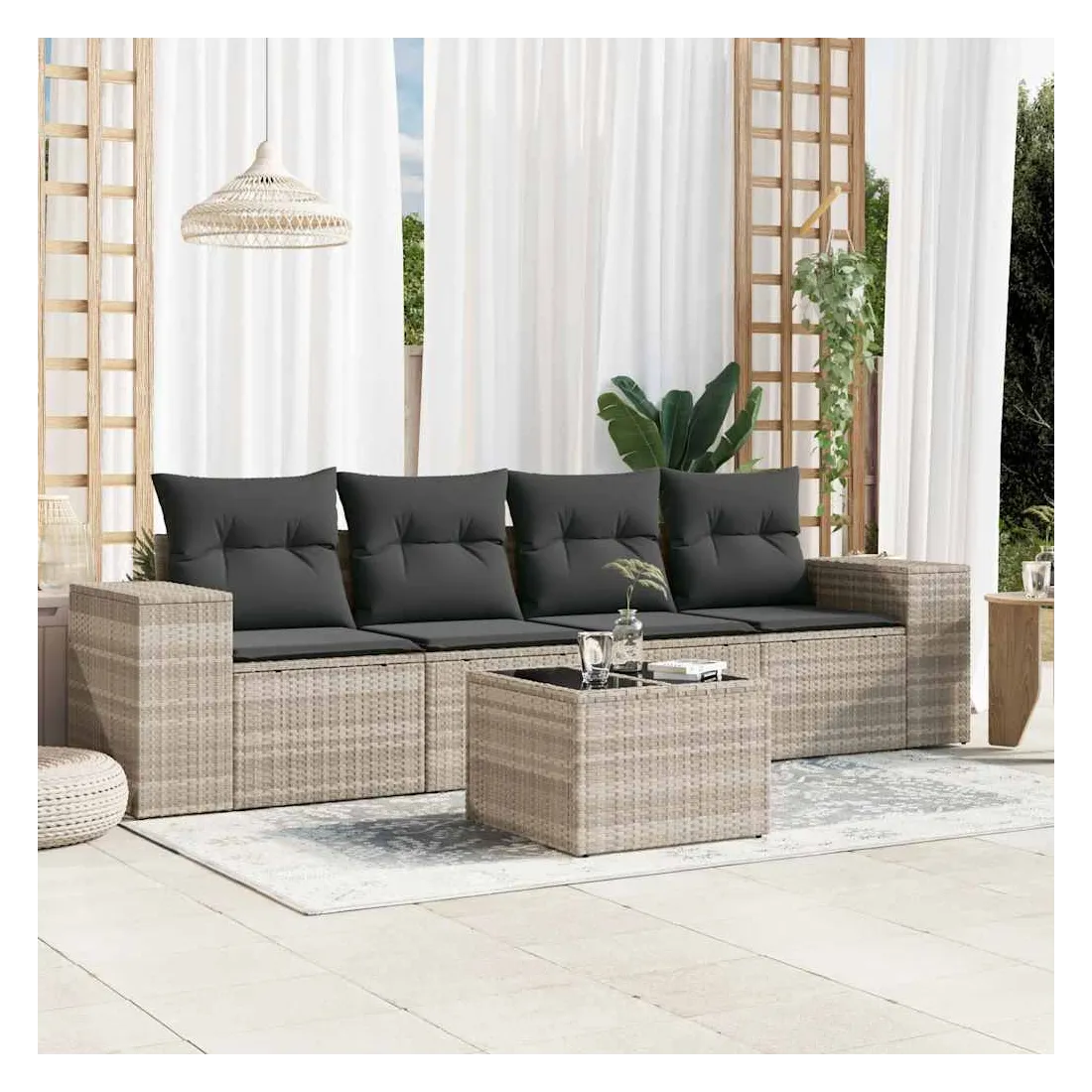 Cet ensemble de canapés de jardin est le complément parfait de votre arrière-cour, terrasse ou patio, offrant un espace confortable et accueillant pour discuter avec la famille et les amis ou simplement se détendre et profiter de l'extérieur. Matériau durable : la résine tressée, également connue sous le nom de poly rotin, est un matériau synthétique solide et nécessitant peu d'entretien qui ressemble au rotin naturel. Il est léger, facile à nettoyer et couramment utilisé pour les meubles d'extérieur en raison de sa durabilité et de ses propriétés de résistance aux intempéries.Dessus en verre : le dessus de la table d'extérieur est fabriqué en verre trempé solide et durable, ce qui le rend facile à nettoyer avec un chiffon humide et ajoute une touche d'élégance à votre espace extérieur.Expérience d'assise confortable : ce mobilier d'extérieur, doté de coussins épais, offre une expérience d'assise confortable.Housse amovible et lavable : ces coussins de siège sont dotés de housses amovibles pour un lavage et un entretien faciles.Conception modulaire : cet ensemble de meubles d'extérieur a une conception modulaire, ce qui le rend complètement flexible et facile à déplacer, afin que vous puissiez créer un agencement de meubles d'extérieur personnalisé. Bon à savoir :Pour que vos meubles d'extérieur restent beaux, nous vous recommandons de les protéger avec une housse imperméable.