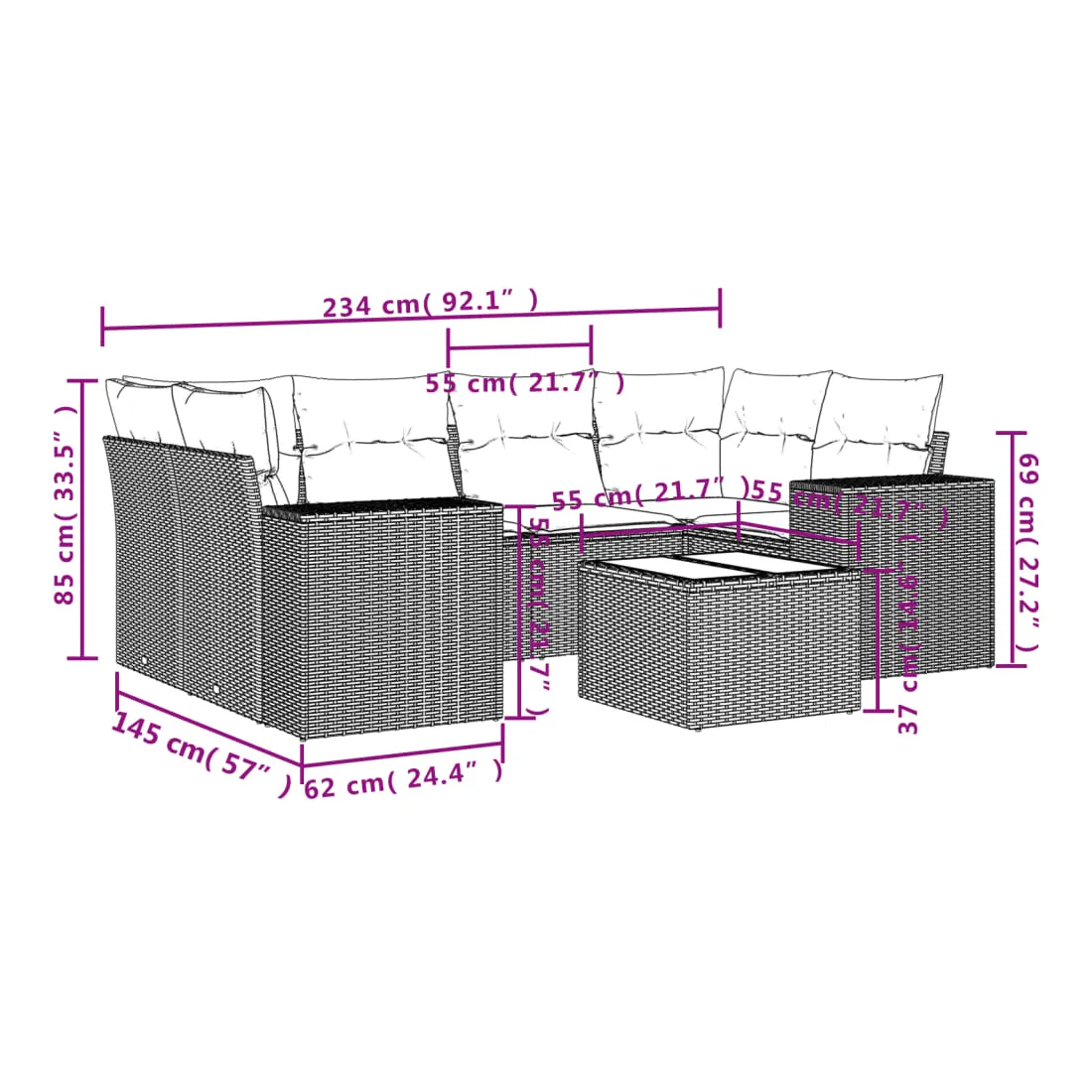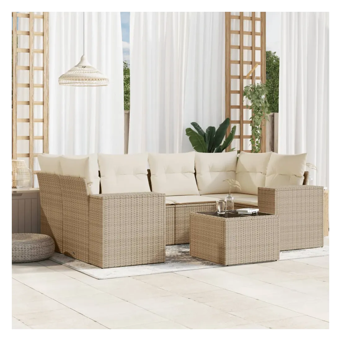 Cet ensemble de canapés de jardin est le complément parfait de votre arrière-cour, terrasse ou patio, offrant un espace confortable et accueillant pour discuter avec la famille et les amis ou simplement se détendre et profiter de l'extérieur. Matériau durable : la résine tressée, également connue sous le nom de poly rotin, est un matériau synthétique solide et nécessitant peu d'entretien qui ressemble au rotin naturel. Il est léger, facile à nettoyer et couramment utilisé pour les meubles d'extérieur en raison de sa durabilité et de ses propriétés de résistance aux intempéries.Dessus en verre : le dessus de la table d'extérieur est fabriqué en verre trempé solide et durable, ce qui le rend facile à nettoyer avec un chiffon humide et ajoute une touche d'élégance à votre espace extérieur.Expérience d'assise confortable : ce mobilier d'extérieur, doté de coussins épais, offre une expérience d'assise confortable.Housse amovible et lavable : ces coussins de siège sont dotés de housses amovibles pour un lavage et un entretien faciles.Conception modulaire : cet ensemble de meubles d'extérieur a une conception modulaire, ce qui le rend complètement flexible et facile à déplacer, afin que vous puissiez créer un agencement de meubles d'extérieur personnalisé. Bon à savoir :Pour que vos meubles d'extérieur restent beaux, nous vous recommandons de les protéger avec une housse imperméable.