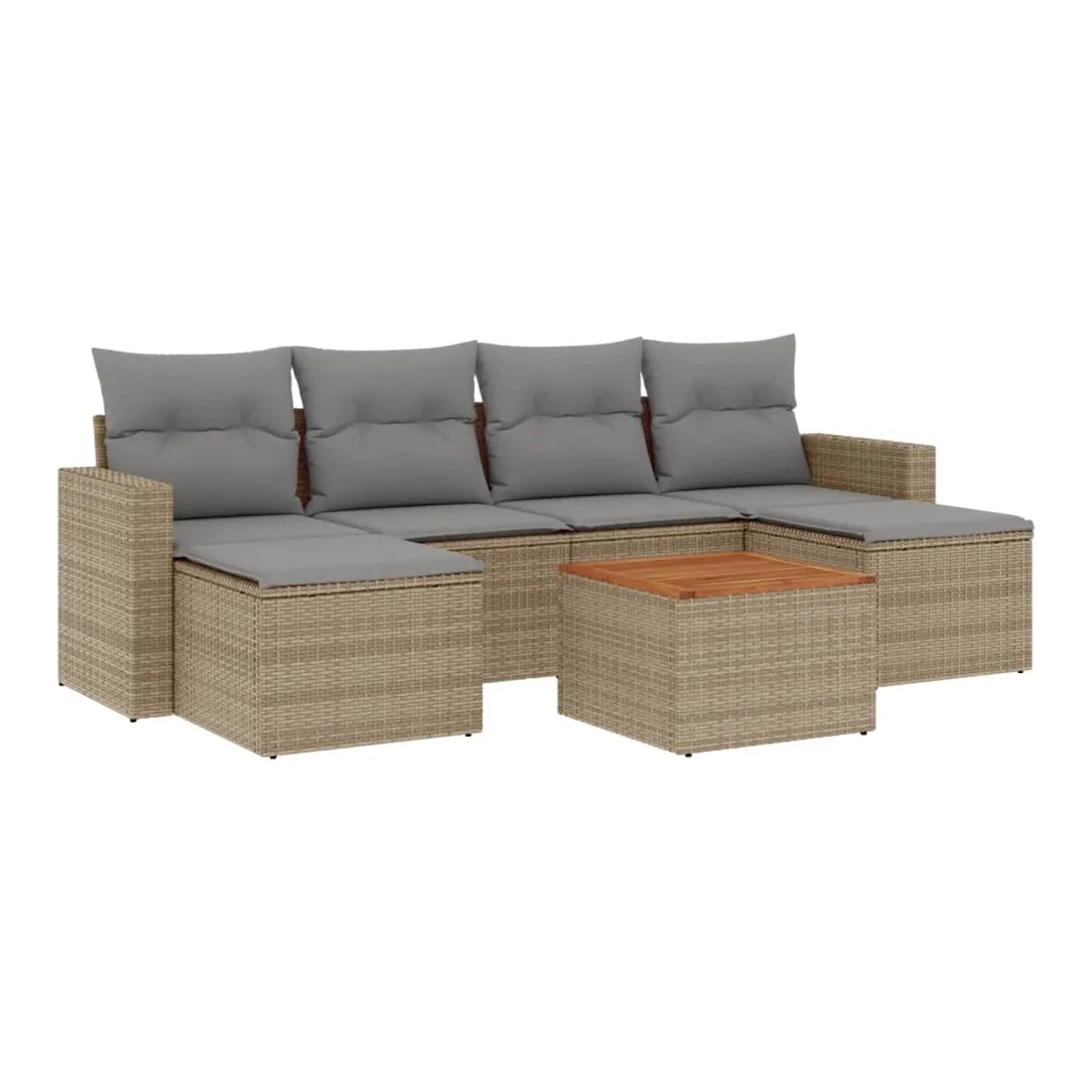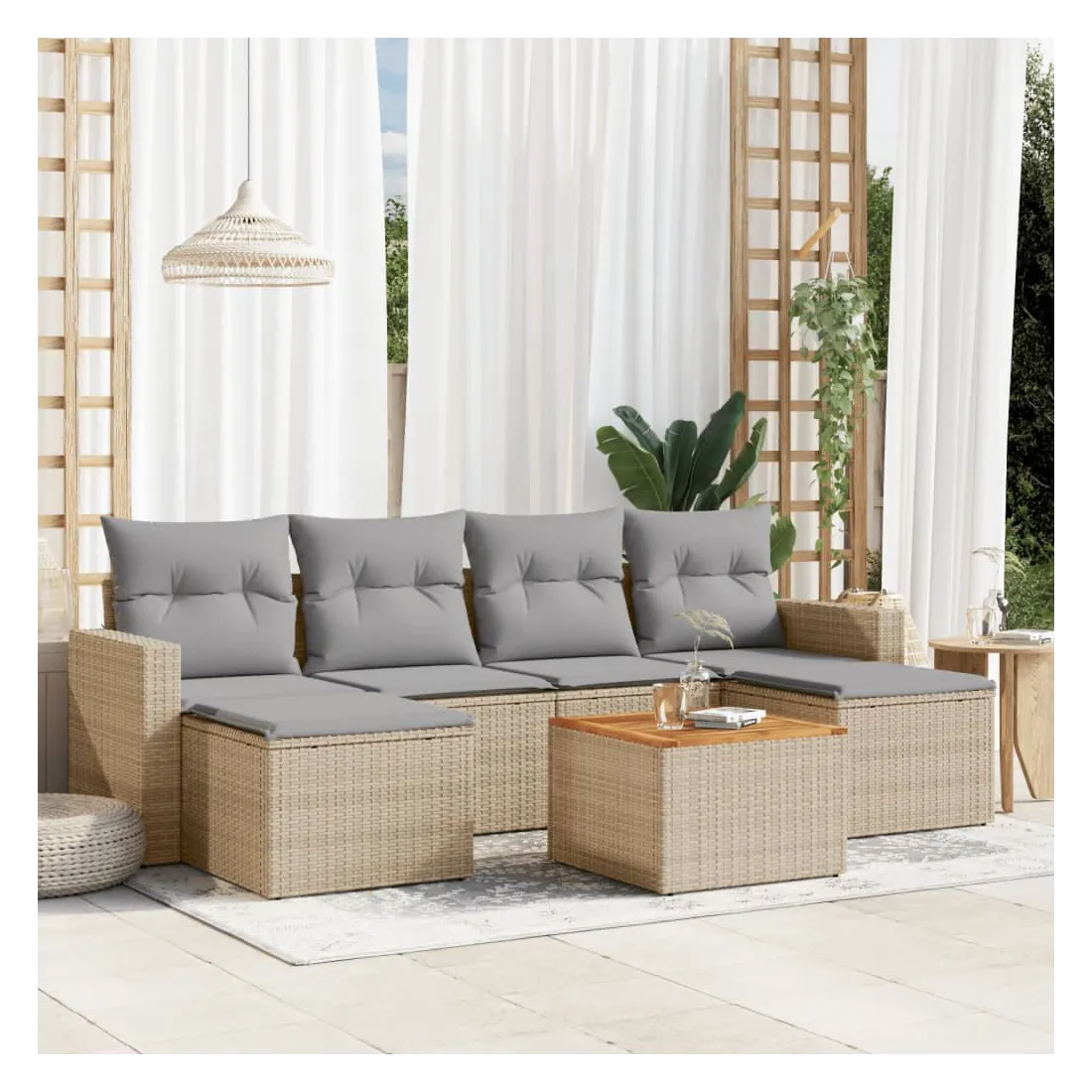 Cet ensemble de canapés de jardin est le complément parfait de votre arrière-cour, terrasse ou patio, offrant un espace confortable et accueillant pour discuter avec la famille et les amis ou simplement se détendre et profiter de l'extérieur. Matériau durable : la résine tressée, également connue sous le nom de poly rotin, est un matériau synthétique solide et nécessitant peu d'entretien qui ressemble au rotin naturel. Il est léger, facile à nettoyer et couramment utilisé pour les meubles d'extérieur en raison de sa durabilité et de ses propriétés de résistance aux intempéries.Dessus stable et facile à nettoyer : cette table de jardin a un dessus en bois d'acacia robuste, durable et facile à nettoyer avec un chiffon humide.Expérience d'assise confortable : ce mobilier d'extérieur, doté de coussins épais, offre une expérience d'assise confortable.Housse amovible et lavable : ces coussins de siège sont dotés de housses amovibles pour un lavage et un entretien faciles.Conception modulaire : cet ensemble de meubles d'extérieur a une conception modulaire, ce qui le rend complètement flexible et facile à déplacer, afin que vous puissiez créer un agencement de meubles d'extérieur personnalisé. Bon à savoir :Pour que vos meubles d'extérieur restent beaux, nous vous recommandons de les protéger avec une housse imperméable.