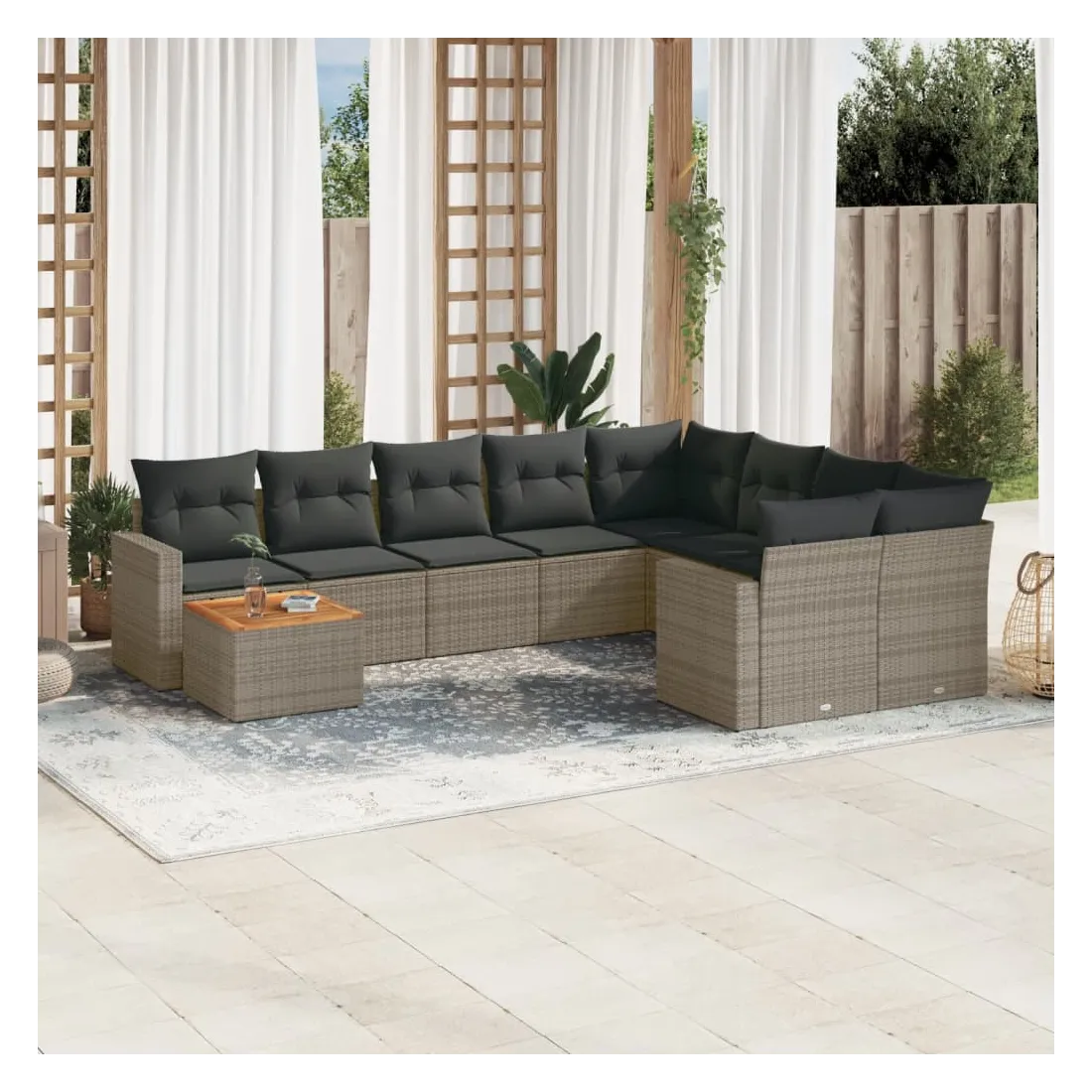 Cet ensemble de canapés de jardin est le complément parfait de votre arrière-cour, terrasse ou patio, offrant un espace confortable et accueillant pour discuter avec la famille et les amis ou simplement se détendre et profiter de l'extérieur. Matériau durable : la résine tressée, également connue sous le nom de poly rotin, est un matériau synthétique solide et nécessitant peu d'entretien qui ressemble au rotin naturel. Il est léger, facile à nettoyer et couramment utilisé pour les meubles d'extérieur en raison de sa durabilité et de ses propriétés de résistance aux intempéries.Dessus stable et facile à nettoyer : cette table de jardin a un dessus en bois d'acacia robuste, durable et facile à nettoyer avec un chiffon humide.Expérience d'assise confortable : ce mobilier d'extérieur, doté de coussins épais, offre une expérience d'assise confortable.Housse amovible et lavable : ces coussins de siège sont dotés de housses amovibles pour un lavage et un entretien faciles.Conception modulaire : cet ensemble de meubles d'extérieur a une conception modulaire, ce qui le rend complètement flexible et facile à déplacer, afin que vous puissiez créer un agencement de meubles d'extérieur personnalisé. Bon à savoir :Pour que vos meubles d'extérieur restent beaux, nous vous recommandons de les protéger avec une housse imperméable.