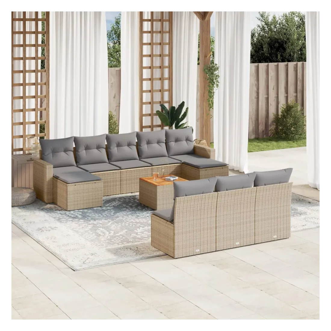 Cet ensemble de canapés de jardin est le complément parfait de votre arrière-cour, terrasse ou patio, offrant un espace confortable et accueillant pour discuter avec la famille et les amis ou simplement se détendre et profiter de l'extérieur. Matériau durable : la résine tressée, également connue sous le nom de poly rotin, est un matériau synthétique solide et nécessitant peu d'entretien qui ressemble au rotin naturel. Il est léger, facile à nettoyer et couramment utilisé pour les meubles d'extérieur en raison de sa durabilité et de ses propriétés de résistance aux intempéries.Dessus stable et facile à nettoyer : cette table de jardin a un dessus en bois d'acacia robuste, durable et facile à nettoyer avec un chiffon humide.Expérience d'assise confortable : ce mobilier d'extérieur, doté de coussins épais, offre une expérience d'assise confortable.Housse amovible et lavable : ces coussins de siège sont dotés de housses amovibles pour un lavage et un entretien faciles.Conception modulaire : cet ensemble de meubles d'extérieur a une conception modulaire, ce qui le rend complètement flexible et facile à déplacer, afin que vous puissiez créer un agencement de meubles d'extérieur personnalisé. Bon à savoir :Pour que vos meubles d'extérieur restent beaux, nous vous recommandons de les protéger avec une housse imperméable.