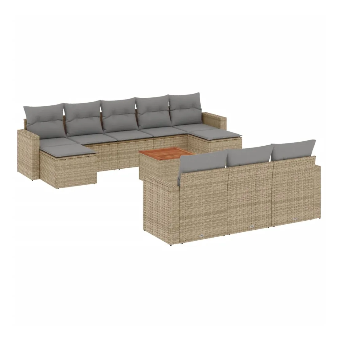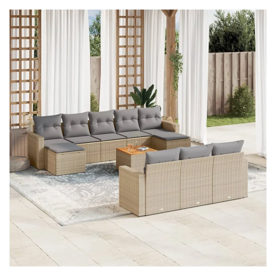 Cet ensemble de canapés de jardin est le complément parfait de votre arrière-cour, terrasse ou patio, offrant un espace confortable et accueillant pour discuter avec la famille et les amis ou simplement se détendre et profiter de l'extérieur. Matériau durable : la résine tressée, également connue sous le nom de poly rotin, est un matériau synthétique solide et nécessitant peu d'entretien qui ressemble au rotin naturel. Il est léger, facile à nettoyer et couramment utilisé pour les meubles d'extérieur en raison de sa durabilité et de ses propriétés de résistance aux intempéries.Dessus stable et facile à nettoyer : cette table de jardin a un dessus en bois d'acacia robuste, durable et facile à nettoyer avec un chiffon humide.Expérience d'assise confortable : ce mobilier d'extérieur, doté de coussins épais, offre une expérience d'assise confortable.Housse amovible et lavable : ces coussins de siège sont dotés de housses amovibles pour un lavage et un entretien faciles.Conception modulaire : cet ensemble de meubles d'extérieur a une conception modulaire, ce qui le rend complètement flexible et facile à déplacer, afin que vous puissiez créer un agencement de meubles d'extérieur personnalisé. Bon à savoir :Pour que vos meubles d'extérieur restent beaux, nous vous recommandons de les protéger avec une housse imperméable.