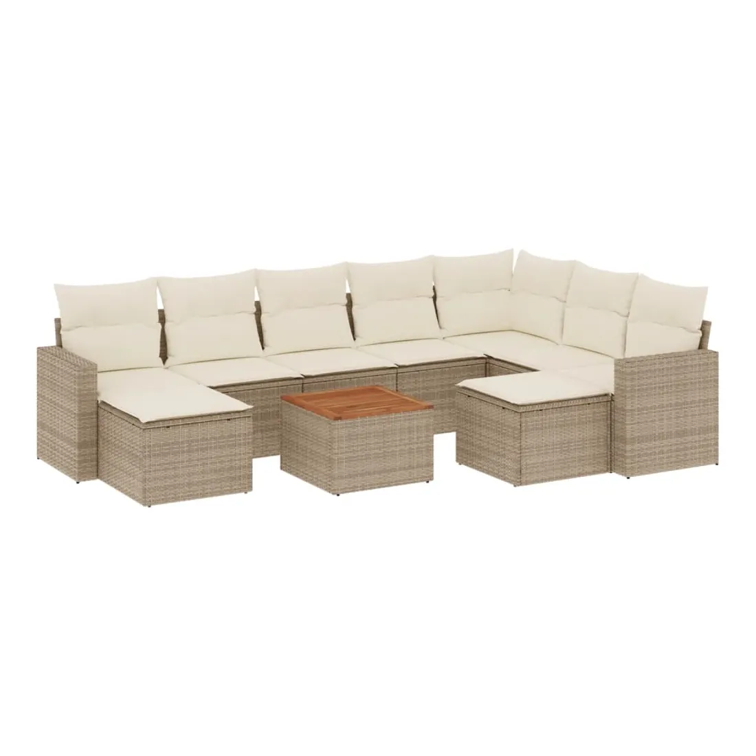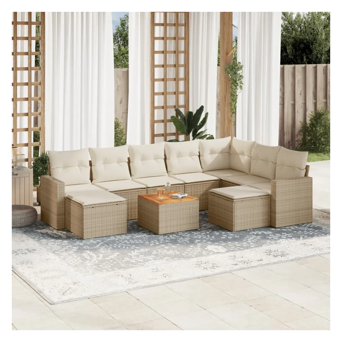Cet ensemble de canapés de jardin est le complément parfait de votre arrière-cour, terrasse ou patio, offrant un espace confortable et accueillant pour discuter avec la famille et les amis ou simplement se détendre et profiter de l'extérieur. Matériau durable : la résine tressée, également connue sous le nom de poly rotin, est un matériau synthétique solide et nécessitant peu d'entretien qui ressemble au rotin naturel. Il est léger, facile à nettoyer et couramment utilisé pour les meubles d'extérieur en raison de sa durabilité et de ses propriétés de résistance aux intempéries.Dessus stable et facile à nettoyer : cette table de jardin a un dessus en bois d'acacia robuste, durable et facile à nettoyer avec un chiffon humide.Expérience d'assise confortable : ce mobilier d'extérieur, doté de coussins épais, offre une expérience d'assise confortable.Housse amovible et lavable : ces coussins de siège sont dotés de housses amovibles pour un lavage et un entretien faciles.Conception modulaire : cet ensemble de meubles d'extérieur a une conception modulaire, ce qui le rend complètement flexible et facile à déplacer, afin que vous puissiez créer un agencement de meubles d'extérieur personnalisé. Bon à savoir :Pour que vos meubles d'extérieur restent beaux, nous vous recommandons de les protéger avec une housse imperméable.