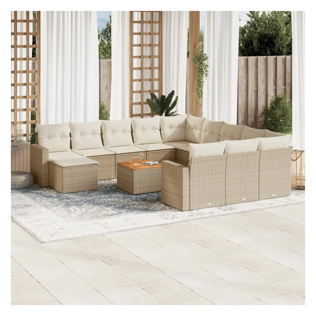 Cet ensemble de canapés de jardin est le complément parfait de votre arrière-cour, terrasse ou patio, offrant un espace confortable et accueillant pour discuter avec la famille et les amis ou simplement se détendre et profiter de l'extérieur. Matériau durable : la résine tressée, également connue sous le nom de poly rotin, est un matériau synthétique solide et nécessitant peu d'entretien qui ressemble au rotin naturel. Il est léger, facile à nettoyer et couramment utilisé pour les meubles d'extérieur en raison de sa durabilité et de ses propriétés de résistance aux intempéries.Dessus stable et facile à nettoyer : cette table de jardin a un dessus en bois d'acacia robuste, durable et facile à nettoyer avec un chiffon humide.Expérience d'assise confortable : ce mobilier d'extérieur, doté de coussins épais, offre une expérience d'assise confortable.Housse amovible et lavable : ces coussins de siège sont dotés de housses amovibles pour un lavage et un entretien faciles.Conception modulaire : cet ensemble de meubles d'extérieur a une conception modulaire, ce qui le rend complètement flexible et facile à déplacer, afin que vous puissiez créer un agencement de meubles d'extérieur personnalisé. Bon à savoir :Pour que vos meubles d'extérieur restent beaux, nous vous recommandons de les protéger avec une housse imperméable.