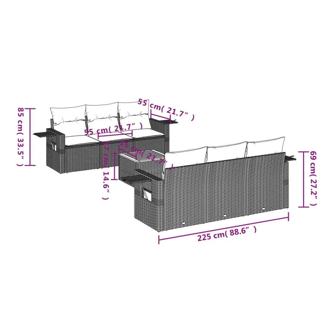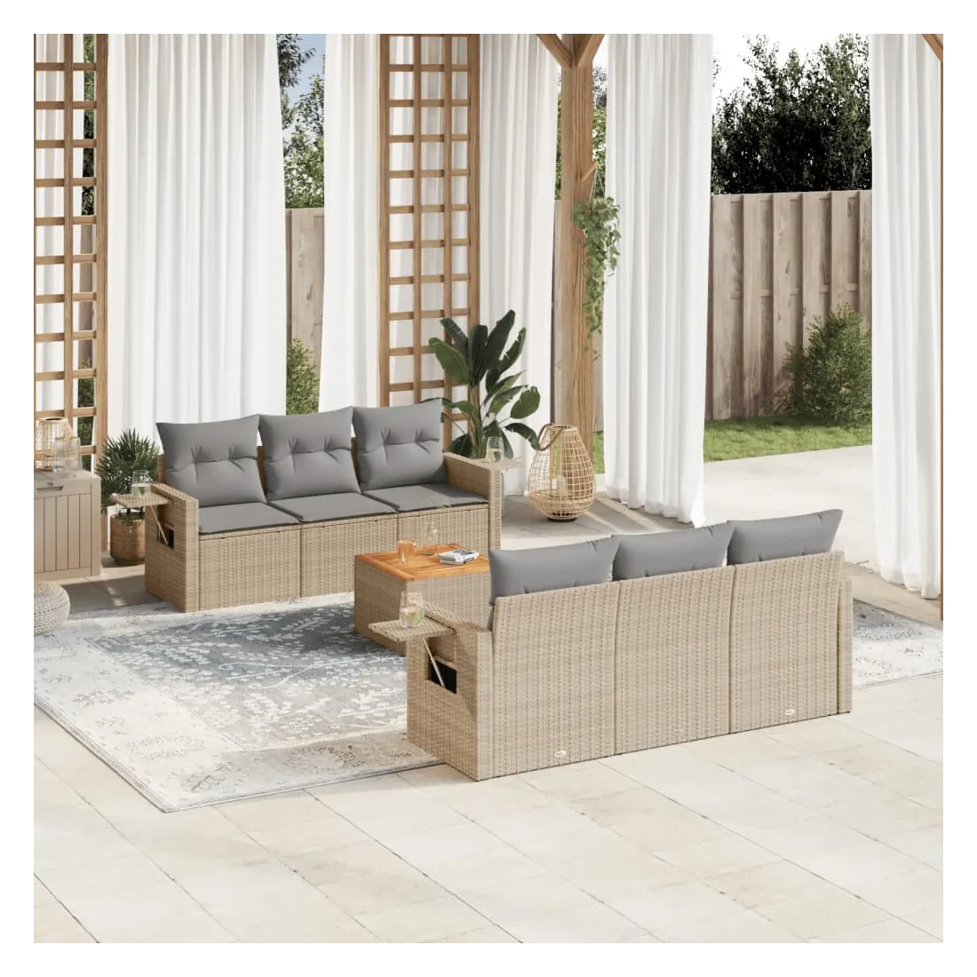 Cet ensemble de canapés de jardin est le complément parfait de votre arrière-cour, terrasse ou patio, offrant un espace confortable et accueillant pour discuter avec la famille et les amis ou simplement se détendre et profiter de l'extérieur. Matériau durable : la résine tressée, également connue sous le nom de poly rotin, est un matériau synthétique solide et nécessitant peu d'entretien qui ressemble au rotin naturel. Il est léger, facile à nettoyer et couramment utilisé pour les meubles d'extérieur en raison de sa durabilité et de ses propriétés de résistance aux intempéries.Table d'appoint pratique : ce mobilier d'extérieur comprend une table d'appoint pliable avec un ressort à gaz sur les accoudoirs, offrant un endroit pratique pour garder vos essentiels à portée de main.Dessus stable et facile à nettoyer : cette table de jardin a un dessus en bois d'acacia robuste, durable et facile à nettoyer avec un chiffon humide.Housse amovible et lavable : ces coussins de siège sont dotés de housses amovibles pour un lavage et un entretien faciles.Conception modulaire : cet ensemble de meubles d'extérieur a une conception modulaire, ce qui le rend complètement flexible et facile à déplacer, afin que vous puissiez créer un agencement de meubles d'extérieur personnalisé. Bon à savoir :Pour que vos meubles d'extérieur restent beaux, nous vous recommandons de les protéger avec une housse imperméable.