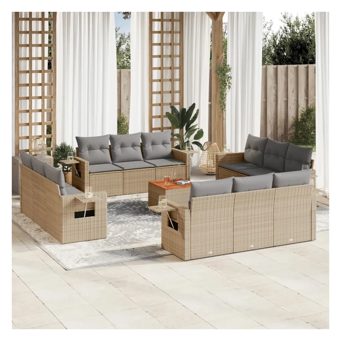 Cet ensemble de canapés de jardin est le complément parfait de votre arrière-cour, terrasse ou patio, offrant un espace confortable et accueillant pour discuter avec la famille et les amis ou simplement se détendre et profiter de l'extérieur. Matériau durable : la résine tressée, également connue sous le nom de poly rotin, est un matériau synthétique solide et nécessitant peu d'entretien qui ressemble au rotin naturel. Il est léger, facile à nettoyer et couramment utilisé pour les meubles d'extérieur en raison de sa durabilité et de ses propriétés de résistance aux intempéries.Table d'appoint pratique : ce mobilier d'extérieur comprend une table d'appoint pliable avec un ressort à gaz sur les accoudoirs, offrant un endroit pratique pour garder vos essentiels à portée de main.Dessus stable et facile à nettoyer : cette table de jardin a un dessus en bois d'acacia robuste, durable et facile à nettoyer avec un chiffon humide.Housse amovible et lavable : ces coussins de siège sont dotés de housses amovibles pour un lavage et un entretien faciles.Conception modulaire : cet ensemble de meubles d'extérieur a une conception modulaire, ce qui le rend complètement flexible et facile à déplacer, afin que vous puissiez créer un agencement de meubles d'extérieur personnalisé. Bon à savoir :Pour que vos meubles d'extérieur restent beaux, nous vous recommandons de les protéger avec une housse imperméable.