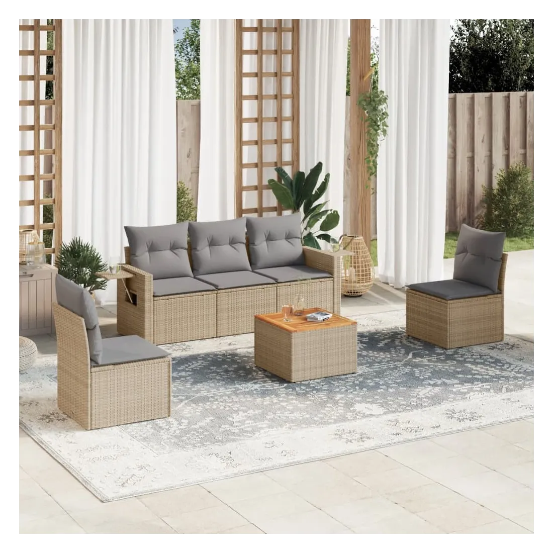 Cet ensemble de canapés de jardin est le complément parfait de votre arrière-cour, terrasse ou patio, offrant un espace confortable et accueillant pour discuter avec la famille et les amis ou simplement se détendre et profiter de l'extérieur. Matériau durable : la résine tressée, également connue sous le nom de poly rotin, est un matériau synthétique solide et nécessitant peu d'entretien qui ressemble au rotin naturel. Il est léger, facile à nettoyer et couramment utilisé pour les meubles d'extérieur en raison de sa durabilité et de ses propriétés de résistance aux intempéries.Table d'appoint pratique : ce mobilier d'extérieur comprend une table d'appoint pliable avec un ressort à gaz sur les accoudoirs, offrant un endroit pratique pour garder vos essentiels à portée de main.Dessus stable et facile à nettoyer : cette table de jardin a un dessus en bois d'acacia robuste, durable et facile à nettoyer avec un chiffon humide.Housse amovible et lavable : ces coussins de siège sont dotés de housses amovibles pour un lavage et un entretien faciles.Conception modulaire : cet ensemble de meubles d'extérieur a une conception modulaire, ce qui le rend complètement flexible et facile à déplacer, afin que vous puissiez créer un agencement de meubles d'extérieur personnalisé. Bon à savoir :Pour que vos meubles d'extérieur restent beaux, nous vous recommandons de les protéger avec une housse imperméable.