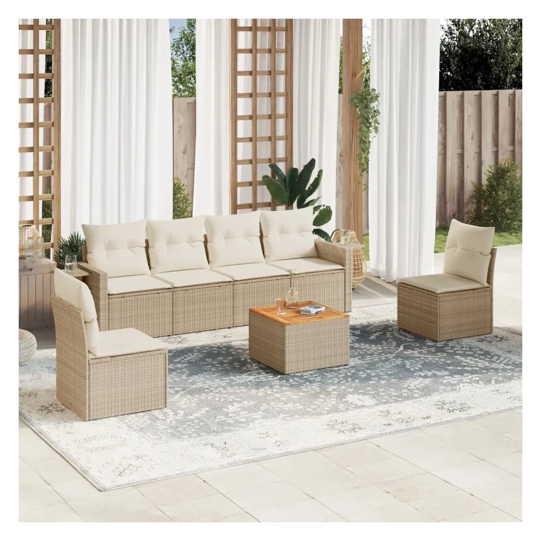 Cet ensemble de canapés de jardin est le complément parfait de votre arrière-cour, terrasse ou patio, offrant un espace confortable et accueillant pour discuter avec la famille et les amis ou simplement se détendre et profiter de l'extérieur. Matériau durable : la résine tressée, également connue sous le nom de poly rotin, est un matériau synthétique solide et nécessitant peu d'entretien qui ressemble au rotin naturel. Il est léger, facile à nettoyer et couramment utilisé pour les meubles d'extérieur en raison de sa durabilité et de ses propriétés de résistance aux intempéries.Table d'appoint pratique : ce mobilier d'extérieur comprend une table d'appoint pliable avec un ressort à gaz sur les accoudoirs, offrant un endroit pratique pour garder vos essentiels à portée de main.Dessus stable et facile à nettoyer : cette table de jardin a un dessus en bois d'acacia robuste, durable et facile à nettoyer avec un chiffon humide.Housse amovible et lavable : ces coussins de siège sont dotés de housses amovibles pour un lavage et un entretien faciles.Conception modulaire : cet ensemble de meubles d'extérieur a une conception modulaire, ce qui le rend complètement flexible et facile à déplacer, afin que vous puissiez créer un agencement de meubles d'extérieur personnalisé. Bon à savoir :Pour que vos meubles d'extérieur restent beaux, nous vous recommandons de les protéger avec une housse imperméable.