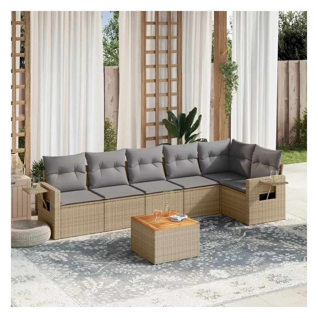 Cet ensemble de canapés de jardin est le complément parfait de votre arrière-cour, terrasse ou patio, offrant un espace confortable et accueillant pour discuter avec la famille et les amis ou simplement se détendre et profiter de l'extérieur. Matériau durable : la résine tressée, également connue sous le nom de poly rotin, est un matériau synthétique solide et nécessitant peu d'entretien qui ressemble au rotin naturel. Il est léger, facile à nettoyer et couramment utilisé pour les meubles d'extérieur en raison de sa durabilité et de ses propriétés de résistance aux intempéries.Table d'appoint pratique : ce mobilier d'extérieur comprend une table d'appoint pliable avec un ressort à gaz sur les accoudoirs, offrant un endroit pratique pour garder vos essentiels à portée de main.Dessus stable et facile à nettoyer : cette table de jardin a un dessus en bois d'acacia robuste, durable et facile à nettoyer avec un chiffon humide.Housse amovible et lavable : ces coussins de siège sont dotés de housses amovibles pour un lavage et un entretien faciles.Conception modulaire : cet ensemble de meubles d'extérieur a une conception modulaire, ce qui le rend complètement flexible et facile à déplacer, afin que vous puissiez créer un agencement de meubles d'extérieur personnalisé. Bon à savoir :Pour que vos meubles d'extérieur restent beaux, nous vous recommandons de les protéger avec une housse imperméable.