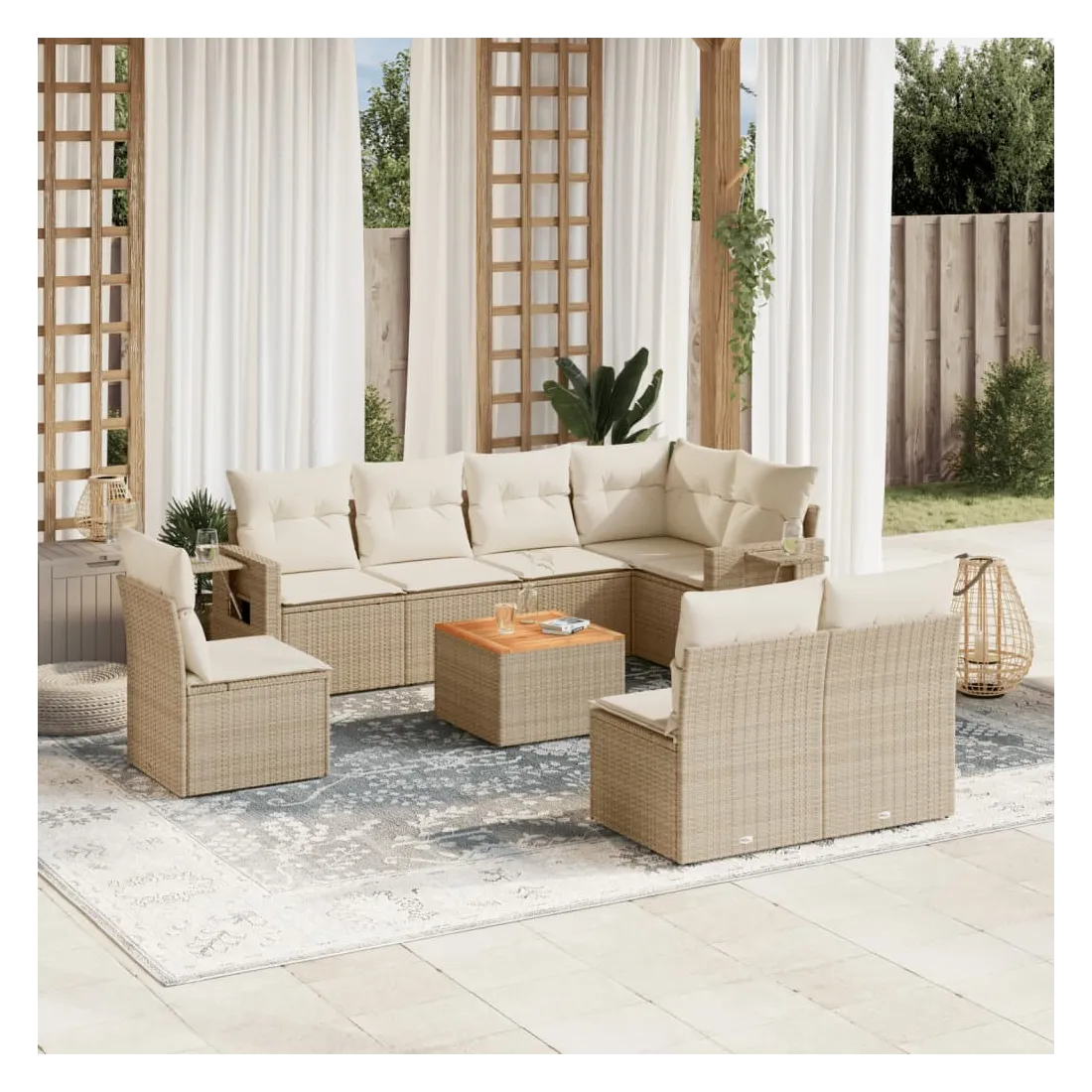 Cet ensemble de canapés de jardin est le complément parfait de votre arrière-cour, terrasse ou patio, offrant un espace confortable et accueillant pour discuter avec la famille et les amis ou simplement se détendre et profiter de l'extérieur. Matériau durable : la résine tressée, également connue sous le nom de poly rotin, est un matériau synthétique solide et nécessitant peu d'entretien qui ressemble au rotin naturel. Il est léger, facile à nettoyer et couramment utilisé pour les meubles d'extérieur en raison de sa durabilité et de ses propriétés de résistance aux intempéries.Table d'appoint pratique : ce mobilier d'extérieur comprend une table d'appoint pliable avec un ressort à gaz sur les accoudoirs, offrant un endroit pratique pour garder vos essentiels à portée de main.Dessus stable et facile à nettoyer : cette table de jardin a un dessus en bois d'acacia robuste, durable et facile à nettoyer avec un chiffon humide.Housse amovible et lavable : ces coussins de siège sont dotés de housses amovibles pour un lavage et un entretien faciles.Conception modulaire : cet ensemble de meubles d'extérieur a une conception modulaire, ce qui le rend complètement flexible et facile à déplacer, afin que vous puissiez créer un agencement de meubles d'extérieur personnalisé. Bon à savoir :Pour que vos meubles d'extérieur restent beaux, nous vous recommandons de les protéger avec une housse imperméable.