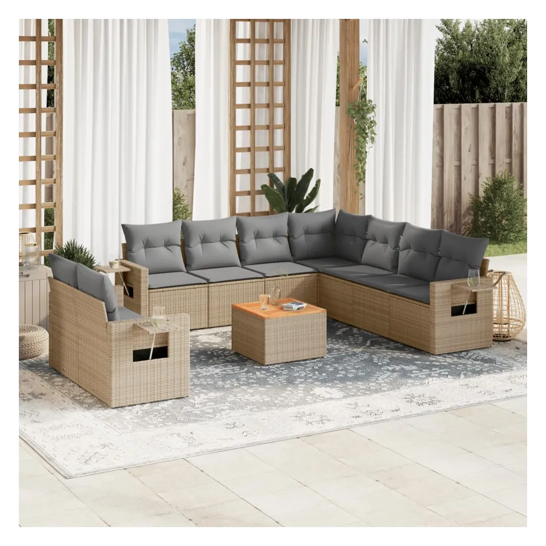 Cet ensemble de canapés de jardin est le complément parfait de votre arrière-cour, terrasse ou patio, offrant un espace confortable et accueillant pour discuter avec la famille et les amis ou simplement se détendre et profiter de l'extérieur. Matériau durable : la résine tressée, également connue sous le nom de poly rotin, est un matériau synthétique solide et nécessitant peu d'entretien qui ressemble au rotin naturel. Il est léger, facile à nettoyer et couramment utilisé pour les meubles d'extérieur en raison de sa durabilité et de ses propriétés de résistance aux intempéries.Table d'appoint pratique : ce mobilier d'extérieur comprend une table d'appoint pliable avec un ressort à gaz sur les accoudoirs, offrant un endroit pratique pour garder vos essentiels à portée de main.Dessus stable et facile à nettoyer : cette table de jardin a un dessus en bois d'acacia robuste, durable et facile à nettoyer avec un chiffon humide.Housse amovible et lavable : ces coussins de siège sont dotés de housses amovibles pour un lavage et un entretien faciles.Conception modulaire : cet ensemble de meubles d'extérieur a une conception modulaire, ce qui le rend complètement flexible et facile à déplacer, afin que vous puissiez créer un agencement de meubles d'extérieur personnalisé. Bon à savoir :Pour que vos meubles d'extérieur restent beaux, nous vous recommandons de les protéger avec une housse imperméable.