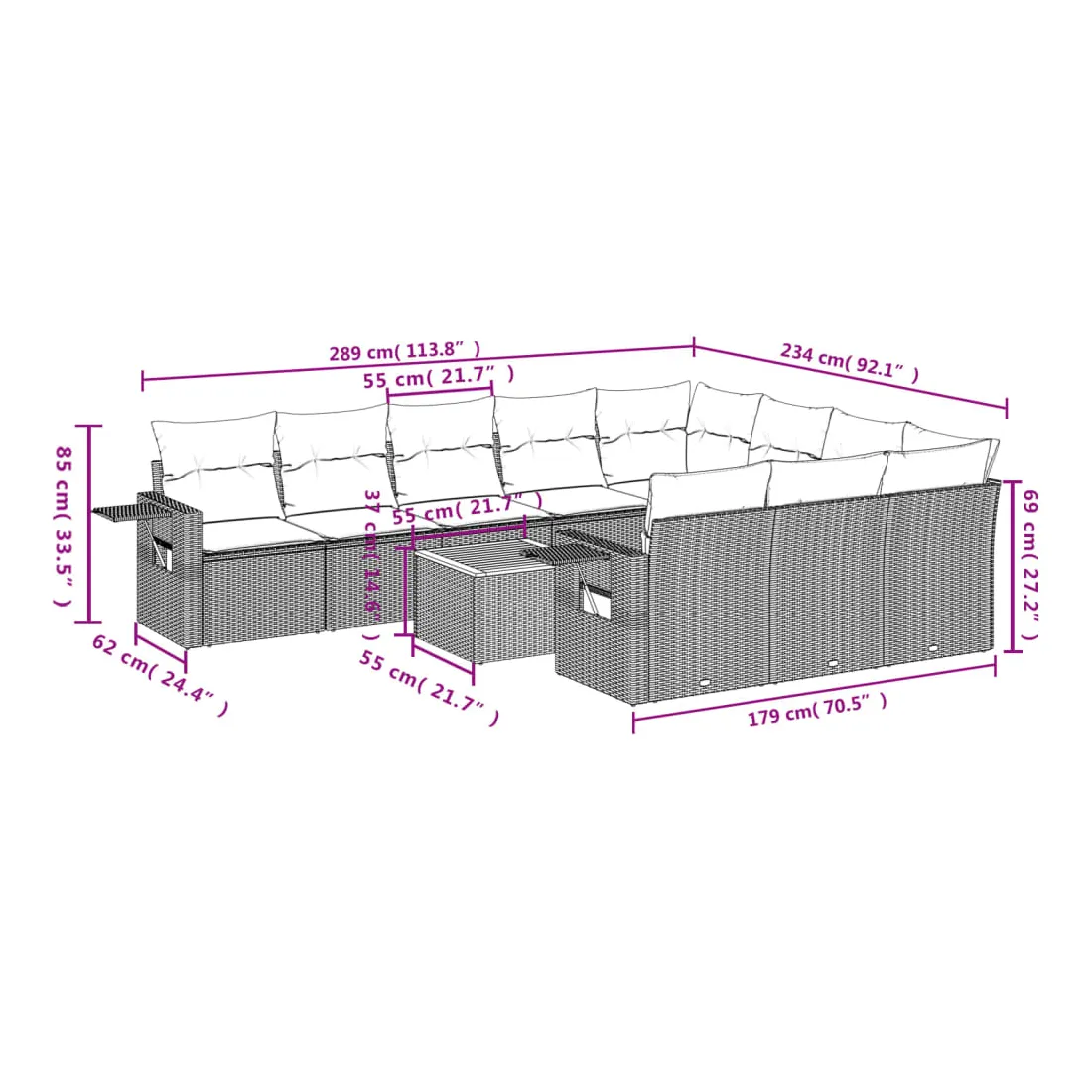 Cet ensemble de canapés de jardin est le complément parfait de votre arrière-cour, terrasse ou patio, offrant un espace confortable et accueillant pour discuter avec la famille et les amis ou simplement se détendre et profiter de l'extérieur. Matériau durable : la résine tressée, également connue sous le nom de poly rotin, est un matériau synthétique solide et nécessitant peu d'entretien qui ressemble au rotin naturel. Il est léger, facile à nettoyer et couramment utilisé pour les meubles d'extérieur en raison de sa durabilité et de ses propriétés de résistance aux intempéries.Table d'appoint pratique : ce mobilier d'extérieur comprend une table d'appoint pliable avec un ressort à gaz sur les accoudoirs, offrant un endroit pratique pour garder vos essentiels à portée de main.Dessus stable et facile à nettoyer : cette table de jardin a un dessus en bois d'acacia robuste, durable et facile à nettoyer avec un chiffon humide.Housse amovible et lavable : ces coussins de siège sont dotés de housses amovibles pour un lavage et un entretien faciles.Conception modulaire : cet ensemble de meubles d'extérieur a une conception modulaire, ce qui le rend complètement flexible et facile à déplacer, afin que vous puissiez créer un agencement de meubles d'extérieur personnalisé. Bon à savoir :Pour que vos meubles d'extérieur restent beaux, nous vous recommandons de les protéger avec une housse imperméable.