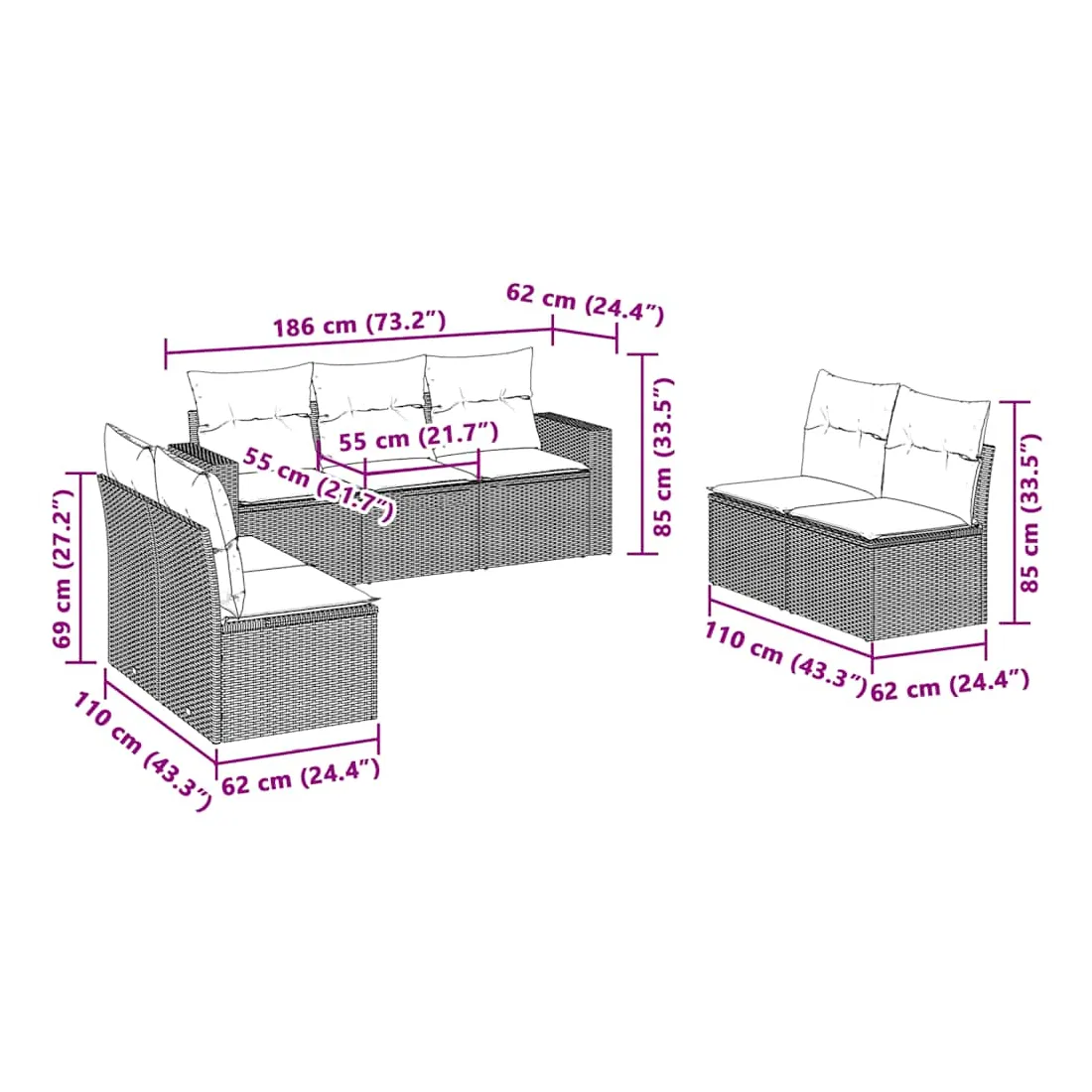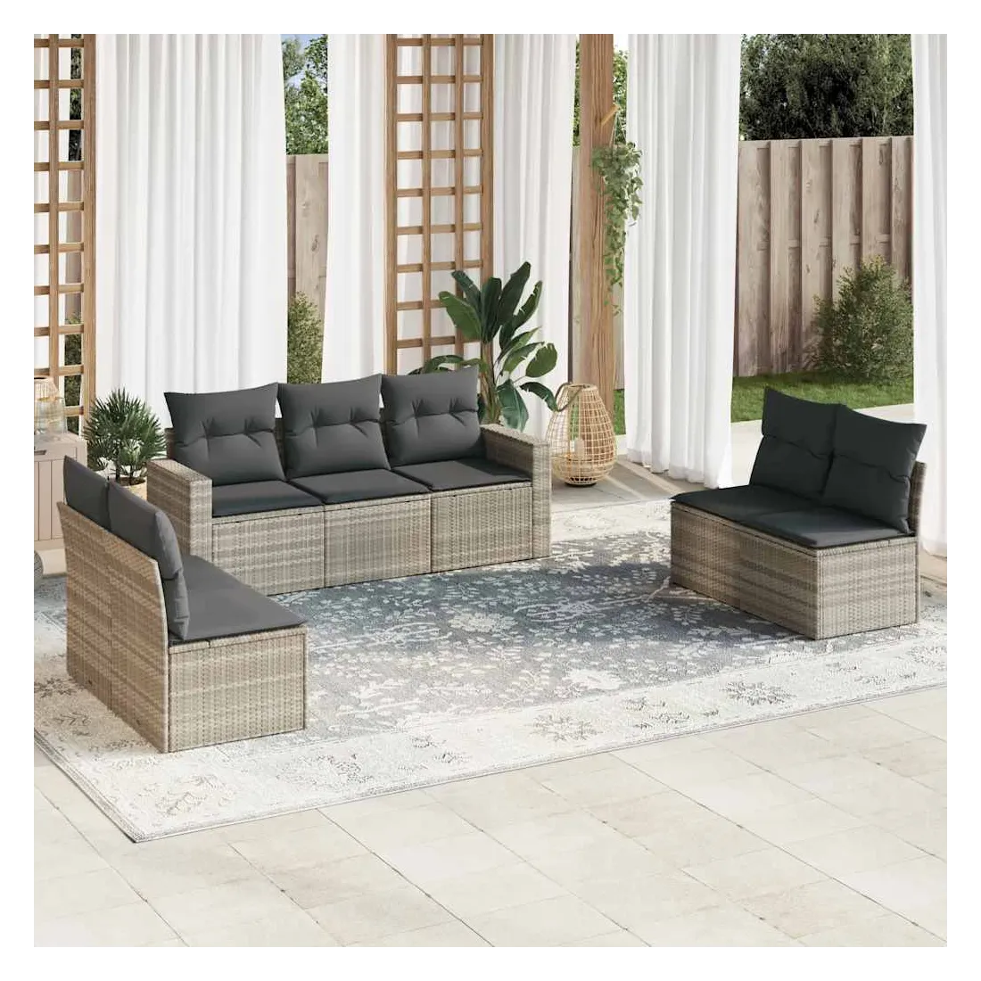 Cet ensemble de canapés de jardin est le complément parfait de votre arrière-cour, terrasse ou patio, offrant un espace confortable et accueillant pour discuter avec la famille et les amis ou simplement se détendre et profiter de l'extérieur. Matériau durable : la résine tressée, également connue sous le nom de poly rotin, est un matériau synthétique solide et nécessitant peu d'entretien qui ressemble au rotin naturel. Il est léger, facile à nettoyer et couramment utilisé pour les meubles d'extérieur en raison de sa durabilité et de ses propriétés de résistance aux intempéries.Fonction de rangement avec sac résistant à l'eau : chaque siège de jardin dispose d'un espace de rangement sous l'assise, complété par un sac résistant à l'eau pour ranger les coussins, les jouets et d'autres objets. Les sacs intérieurs sont dotés d'un couvercle et peuvent être solidement fixés aux sièges à l'aide de bandes auto-agrippantes pour plus de stabilité.Expérience d'assise confortable : ce mobilier d'extérieur, doté de coussins épais, offre une expérience d'assise confortable.Housse amovible et lavable : ces coussins de siège sont dotés de housses amovibles pour un lavage et un entretien faciles.Conception modulaire : cet ensemble de meubles d'extérieur a une conception modulaire, ce qui le rend complètement flexible et facile à déplacer, afin que vous puissiez créer un agencement de meubles d'extérieur personnalisé. Bon à savoir :Pour que vos meubles d'extérieur restent beaux, nous vous recommandons de les protéger avec une housse imperméable.