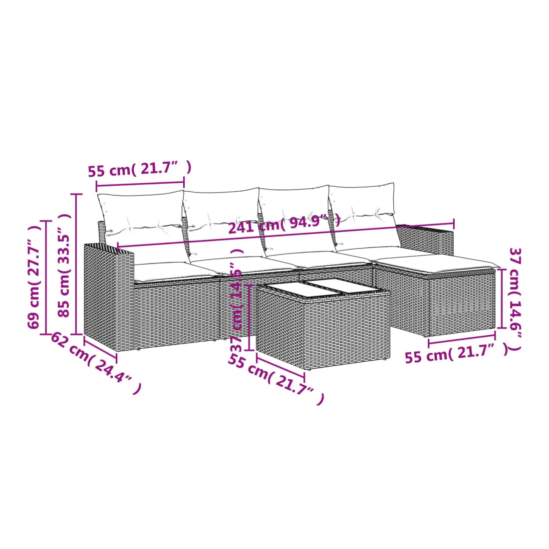 Cet ensemble de canapés de jardin est le complément parfait de votre arrière-cour, terrasse ou patio, offrant un espace confortable et accueillant pour discuter avec la famille et les amis ou simplement se détendre et profiter de l'extérieur. Matériau durable : la résine tressée, également connue sous le nom de poly rotin, est un matériau synthétique solide et nécessitant peu d'entretien qui ressemble au rotin naturel. Il est léger, facile à nettoyer et couramment utilisé pour les meubles d'extérieur en raison de sa durabilité et de ses propriétés de résistance aux intempéries.Fonction de rangement avec sac résistant à l'eau : chaque siège de jardin dispose d'un espace de rangement sous l'assise, complété par un sac résistant à l'eau pour ranger les coussins, les jouets et d'autres objets. Les sacs intérieurs sont dotés d'un couvercle et peuvent être solidement fixés aux sièges à l'aide de bandes auto-agrippantes pour plus de stabilité.Dessus en verre : le dessus de la table d'extérieur est fabriqué en verre trempé solide et durable, ce qui le rend facile à nettoyer avec un chiffon humide et ajoute une touche d'élégance à votre espace extérieur.Housse amovible et lavable : ces coussins de siège sont dotés de housses amovibles pour un lavage et un entretien faciles.Conception modulaire : cet ensemble de meubles d'extérieur a une conception modulaire, ce qui le rend complètement flexible et facile à déplacer, afin que vous puissiez créer un agencement de meubles d'extérieur personnalisé. Bon à savoir :Pour que vos meubles d'extérieur restent beaux, nous vous recommandons de les protéger avec une housse imperméable.