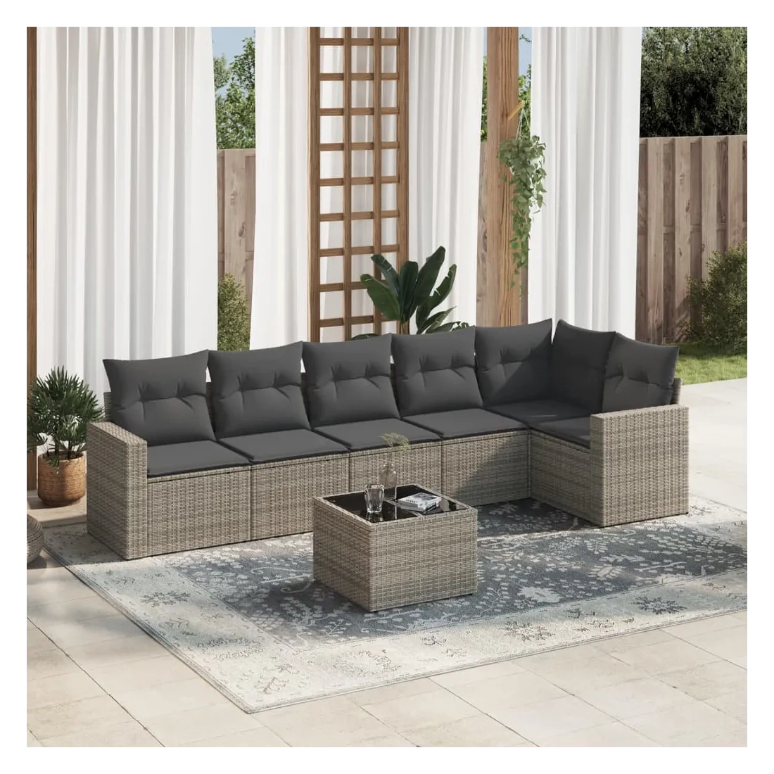 Cet ensemble de canapés de jardin est le complément parfait de votre arrière-cour, terrasse ou patio, offrant un espace confortable et accueillant pour discuter avec la famille et les amis ou simplement se détendre et profiter de l'extérieur. Matériau durable : la résine tressée, également connue sous le nom de poly rotin, est un matériau synthétique solide et nécessitant peu d'entretien qui ressemble au rotin naturel. Il est léger, facile à nettoyer et couramment utilisé pour les meubles d'extérieur en raison de sa durabilité et de ses propriétés de résistance aux intempéries.Fonction de rangement avec sac résistant à l'eau : chaque siège de jardin dispose d'un espace de rangement sous l'assise, complété par un sac résistant à l'eau pour ranger les coussins, les jouets et d'autres objets. Les sacs intérieurs sont dotés d'un couvercle et peuvent être solidement fixés aux sièges à l'aide de bandes auto-agrippantes pour plus de stabilité.Dessus en verre : le dessus de la table d'extérieur est fabriqué en verre trempé solide et durable, ce qui le rend facile à nettoyer avec un chiffon humide et ajoute une touche d'élégance à votre espace extérieur.Housse amovible et lavable : ces coussins de siège sont dotés de housses amovibles pour un lavage et un entretien faciles.Conception modulaire : cet ensemble de meubles d'extérieur a une conception modulaire, ce qui le rend complètement flexible et facile à déplacer, afin que vous puissiez créer un agencement de meubles d'extérieur personnalisé. Bon à savoir :Pour que vos meubles d'extérieur restent beaux, nous vous recommandons de les protéger avec une housse imperméable.