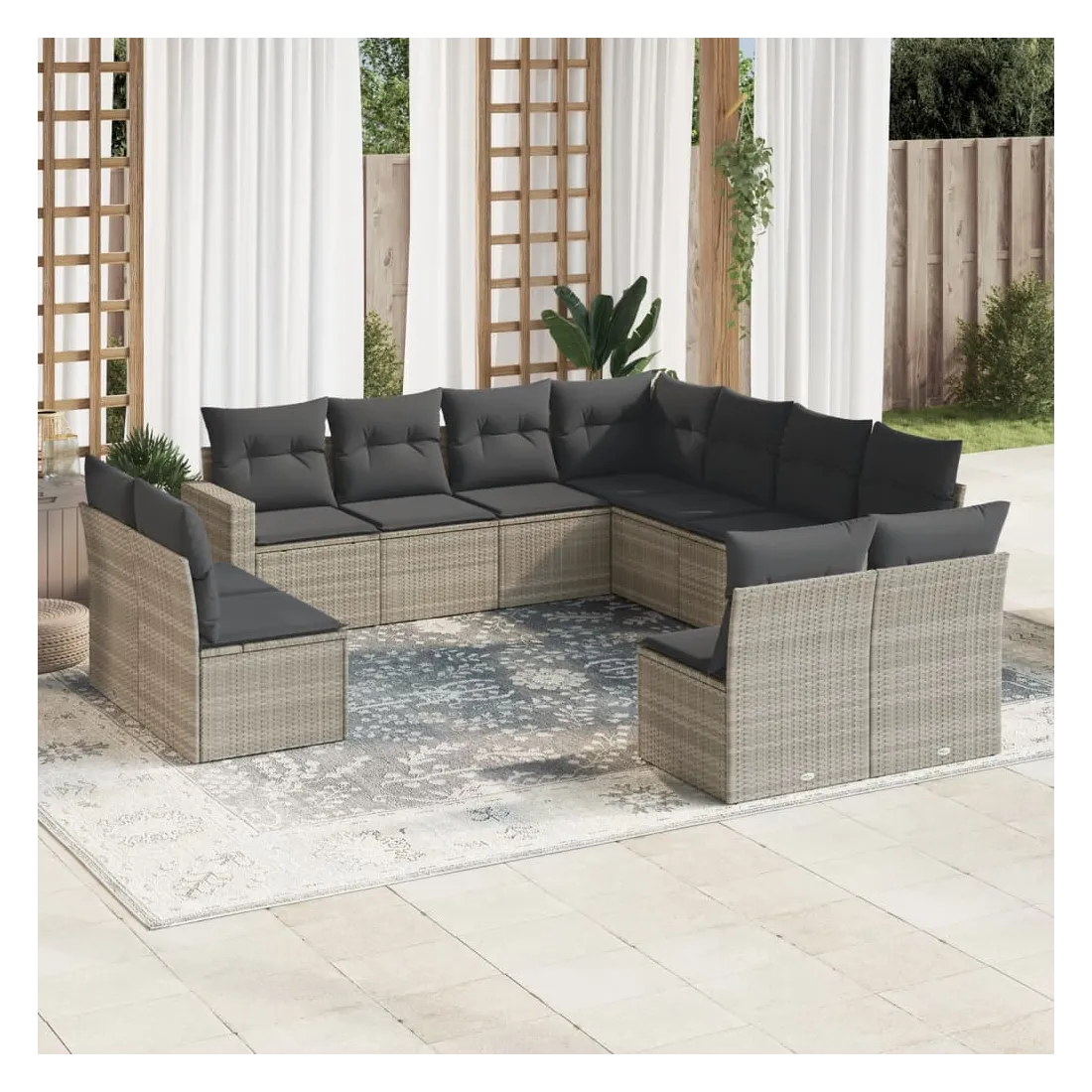 Cet ensemble de canapés de jardin est le complément parfait de votre arrière-cour, terrasse ou patio, offrant un espace confortable et accueillant pour discuter avec la famille et les amis ou simplement se détendre et profiter de l'extérieur. Matériau durable : la résine tressée, également connue sous le nom de poly rotin, est un matériau synthétique solide et nécessitant peu d'entretien qui ressemble au rotin naturel. Il est léger, facile à nettoyer et couramment utilisé pour les meubles d'extérieur en raison de sa durabilité et de ses propriétés de résistance aux intempéries.Fonction de rangement avec sac résistant à l'eau : chaque siège de jardin dispose d'un espace de rangement sous l'assise, complété par un sac résistant à l'eau pour ranger les coussins, les jouets et d'autres objets. Les sacs intérieurs sont dotés d'un couvercle et peuvent être solidement fixés aux sièges à l'aide de bandes auto-agrippantes pour plus de stabilité.Expérience d'assise confortable : ce mobilier d'extérieur, doté de coussins épais, offre une expérience d'assise confortable.Housse amovible et lavable : ces coussins de siège sont dotés de housses amovibles pour un lavage et un entretien faciles.Conception modulaire : cet ensemble de meubles d'extérieur a une conception modulaire, ce qui le rend complètement flexible et facile à déplacer, afin que vous puissiez créer un agencement de meubles d'extérieur personnalisé. Bon à savoir :Pour que vos meubles d'extérieur restent beaux, nous vous recommandons de les protéger avec une housse imperméable.