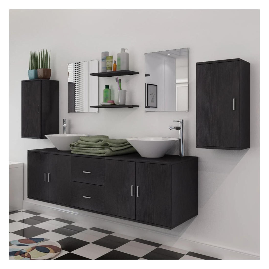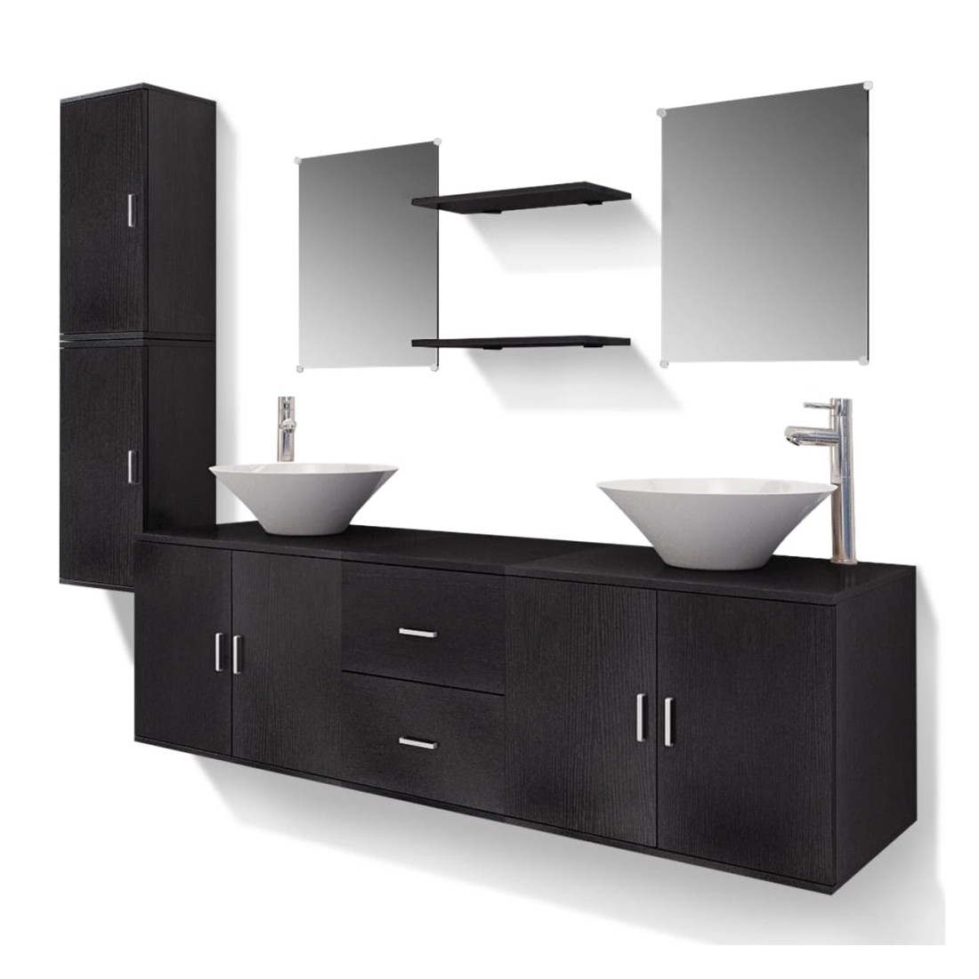 Cet ensemble complet comprend 1 armoire de lavabo murale, 2 armoires murales, 2 miroirs, 2 étagères, 2 lavabos et 2 robinets et complète parfaitement votre salle de bain en optimisant votre espace sans compromettre le style. Les armoires murales et l'armoire de lavabo avec deux tiroirs offrent amplement d'espace pour ranger vos articles de toilette, produits de beauté et divers types de petits articles. Des peignes, des cosmétiques, des brosses à dents et des dentifrices peuvent être organisés sur les étagères à portée de main. Fabriqué en aggloméré de haute qualité, ce meuble-lavabo est très robuste et durable. Les deux lavabos sont en céramique de haute qualité, ce qui les rend résistants aux rayures, à la corrosion et faciles à nettoyer. Ils sont adaptés au montage au-dessus du comptoir. Les 2 mitigeurs de haute qualité inclus, chacun d'eux livré avec des tuyaux d'eau chaude et froide ainsi que des pièces d'installation, sont faciles à installer. Grâce à leur surface chromée, ces mitigeurs de lavabo ont une brillance miroitante très réfléchissante et la construction en laiton massif, la poignée en zinc et la cartouche à disques en céramique rendent les robinets très durables. L'assemblage est vraiment facile. Veuillez noter que les trous pour les robinets ne sont pas pré-percés.