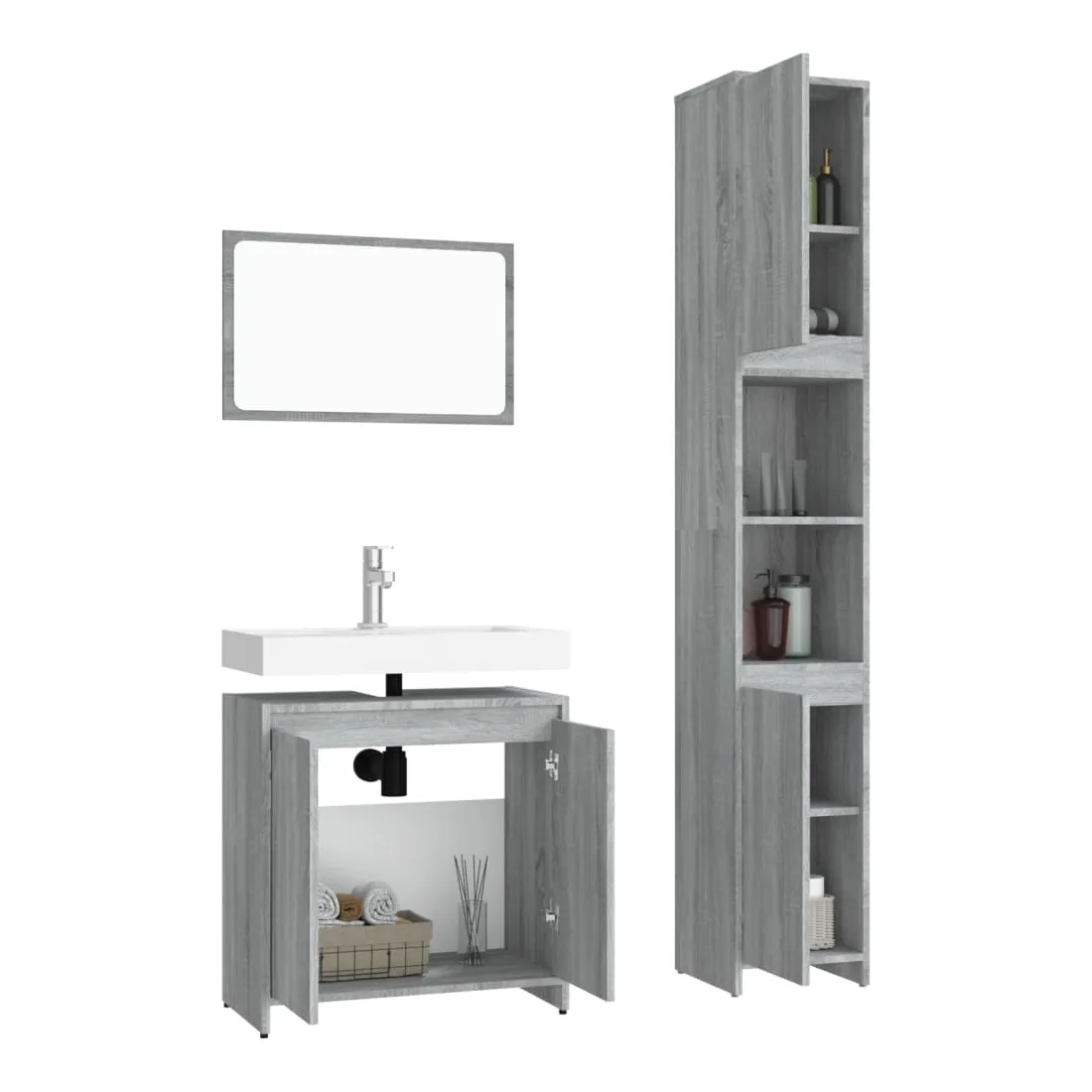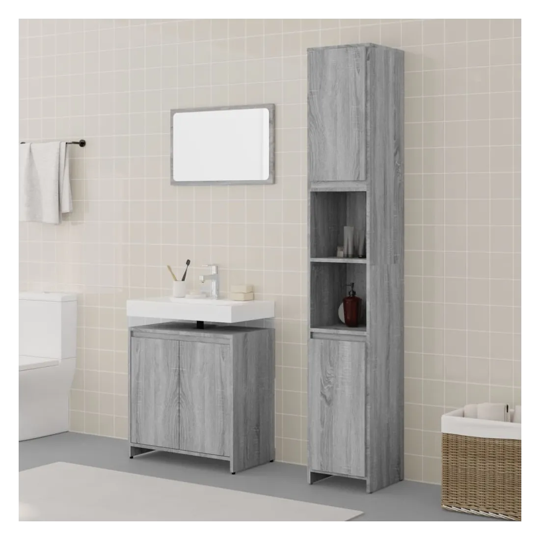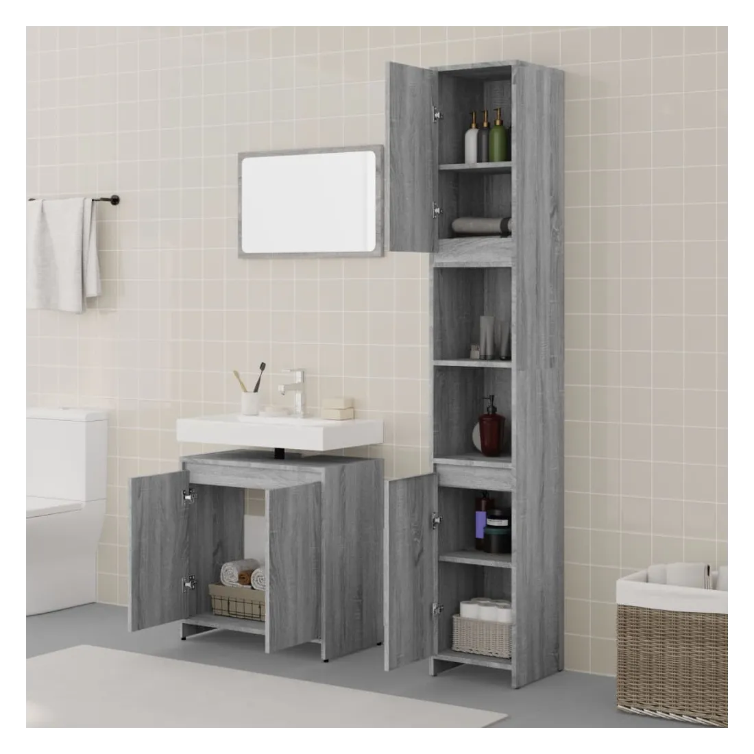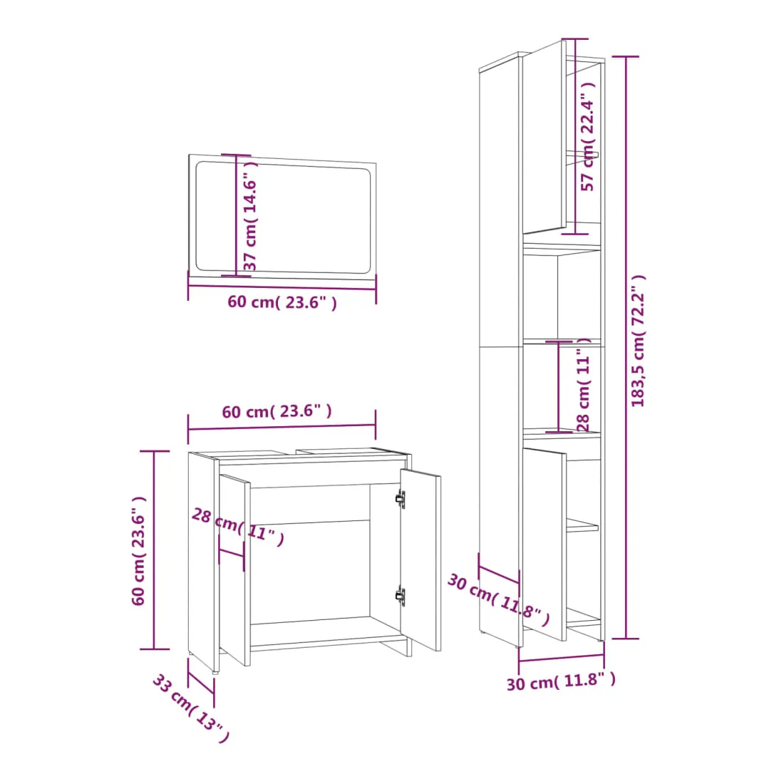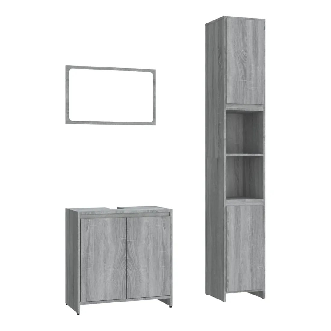 Cet ensemble de meubles de salle de bain élégant de 3 pièces, avec un espace de rangement spacieux, est un excellent supplément à votre salle de bain, ce qui lui donne un aspect soigné et impressionnant ! Matériau pratique : le bois d'ingénierie est d'une qualité exceptionnelle avec une surface lisse et présente également résistance, stabilité et résistance à l'humidité.Grand espace de rangement : cette armoire à miroir de salle de bain offre un grand espace de rangement pour garder vos articles de buanderie, articles de toilette et autres articles bien organisés et à portée de main. Vous pouvez créer et utiliser de manière optimale un espace de rangement supplémentaire dans votre salle de bain.Miroir utilitaire : l'armoire de salle de bain avec miroir est parfaite pour votre routine beauté quotidienne. Le miroir vous permet de prendre soin de la peau de votre visage et de vous maquiller aussi !Design élégant : les lignes épurées et le design élégant font que cette armoire de lavabo de salle de bain s'intègre parfaitement dans votre salle de bain. Attention :Afin d'éviter qu'il ne bascule, ce produit doit être utilisé avec le dispositif de fixation murale fourni. Remarque :Les vis et les chevilles pour l'intérieur du mur ne sont pas incluses. Recherchez et utilisez des vis et des chevilles adaptées à vos murs. Si vous n'êtes pas sûr, demandez conseil à un professionnel. Lisez et suivez attentivement chaque étape des instructions.Chaque produit est livré avec un manuel de montage dans la boîte pour un montage facile.