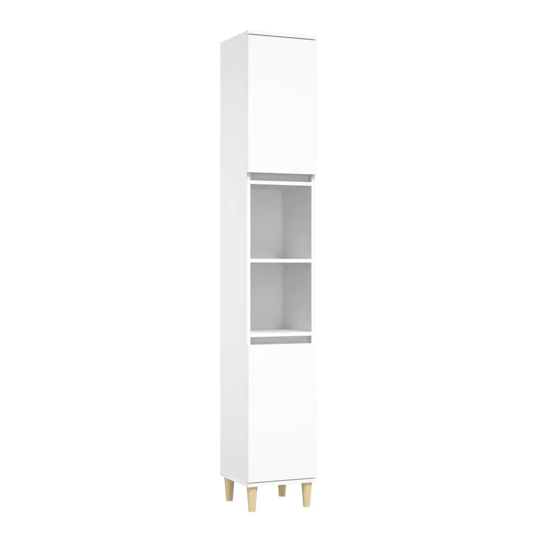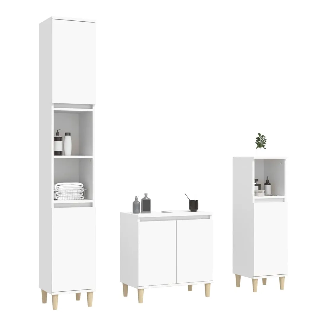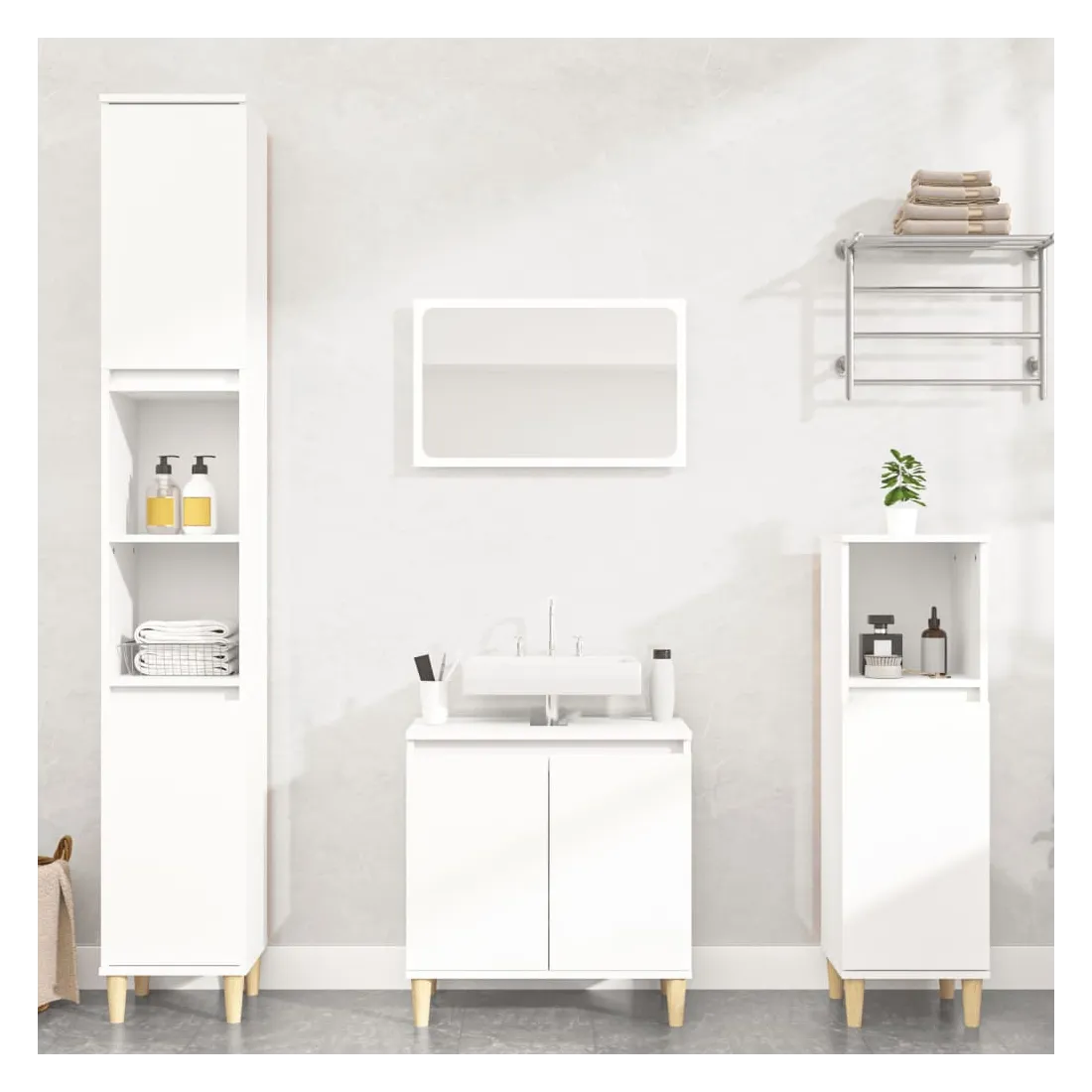 Cet ensemble de meubles de salle de bain, avec un espace de rangement spacieux, est un excellent supplément à votre salle de bain, ce qui lui donne une apparence ordonnée et saisissante ! Matériau durable : le bois d'ingénierie est d'une qualité exceptionnelle avec une surface lisse et présente également résistance, stabilité et résistance à l'humidité.Grand espace de rangement : ces armoires de salle de bain offrent un grand espace de rangement pour garder vos fournitures de salle de bain bien organisées.Pieds en bois : les pieds en bois d'eucalyptus massif donnent au meuble de salle de bain un aspect naturel et agréable tout en assurant la stabilité.Surface facile à nettoyer : l'ensemble de salle de bain est facile à nettoyer avec un chiffon humide.Design élégant : les lignes épurées et le design élégant se fondent parfaitement dans votre salle de bain. Attention :Pour éviter qu'il ne soit renversé, ce produit doit être utilisé avec le dispositif de fixation au mur fourni. Bon à savoir :Les vis et les chevilles pour l'intérieur du mur ne sont pas incluses. Nous vous conseillons de trouver et d'utiliser des vis et des chevilles adaptées spécifiquement à vos murs. Si vous n'êtes pas sûr, vous pouvez consulter un professionnel. Veuillez lire et suivre chaque étape des instructions.