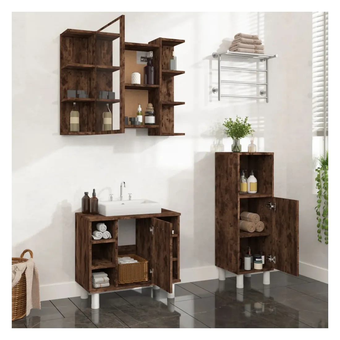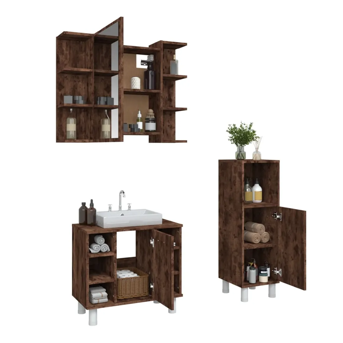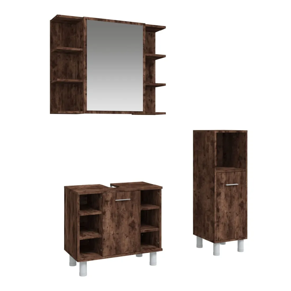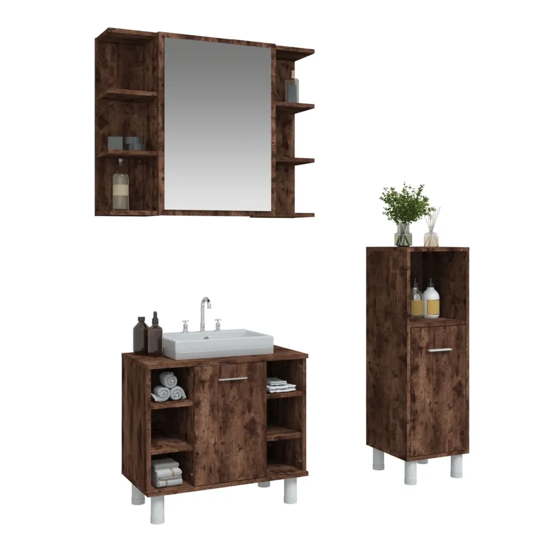 Cet ensemble d'armoires de salle de bain attrayant, avec un grand espace de rangement, présente un design élégant mais pratique. Matériau durable : le bois d'ingénierie est d'une qualité exceptionnelle avec une surface lisse et présente également résistance, stabilité et résistance à l'humidité.Grand espace de rangement : l'espace de rangement facilite l'organisation des articles dans ces meubles de salle de bain. Surface facile à nettoyer : l'ensemble de salle de bain est facile à nettoyer avec un chiffon humide.Design élégant : les lignes épurées et le design élégant se fondent parfaitement dans votre salle de bain. Attention :Pour éviter qu'il ne soit renversé, ce produit doit être utilisé avec le dispositif de fixation au mur fourni. Bon à savoir :Les vis et les chevilles pour l'intérieur du mur ne sont pas incluses. Nous vous conseillons de trouver et d'utiliser des vis et des chevilles adaptées spécifiquement à vos murs. Si vous n'êtes pas sûr, vous pouvez consulter un professionnel. Veuillez lire et suivre chaque étape des instructions. Pour faciliter au maximum le montage, chaque produit est livré avec des instructions.