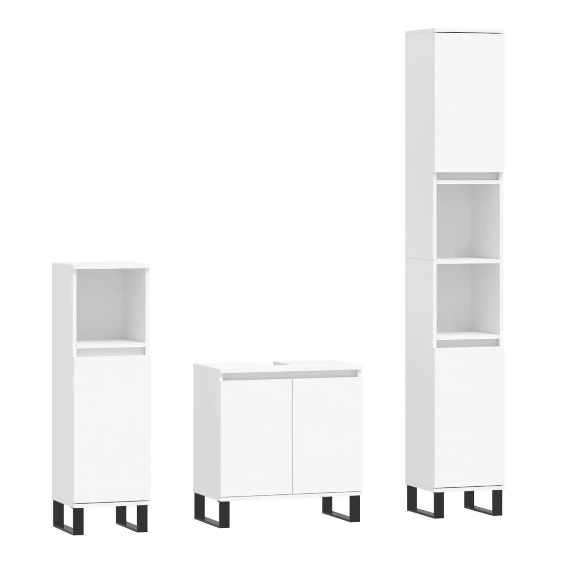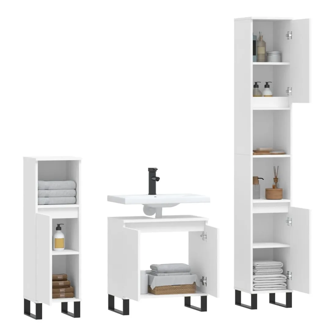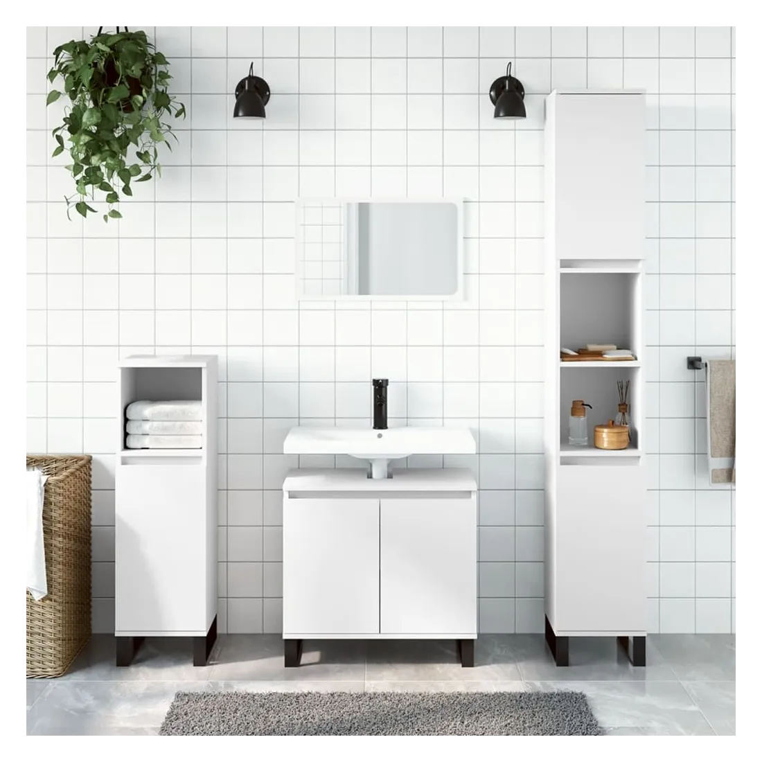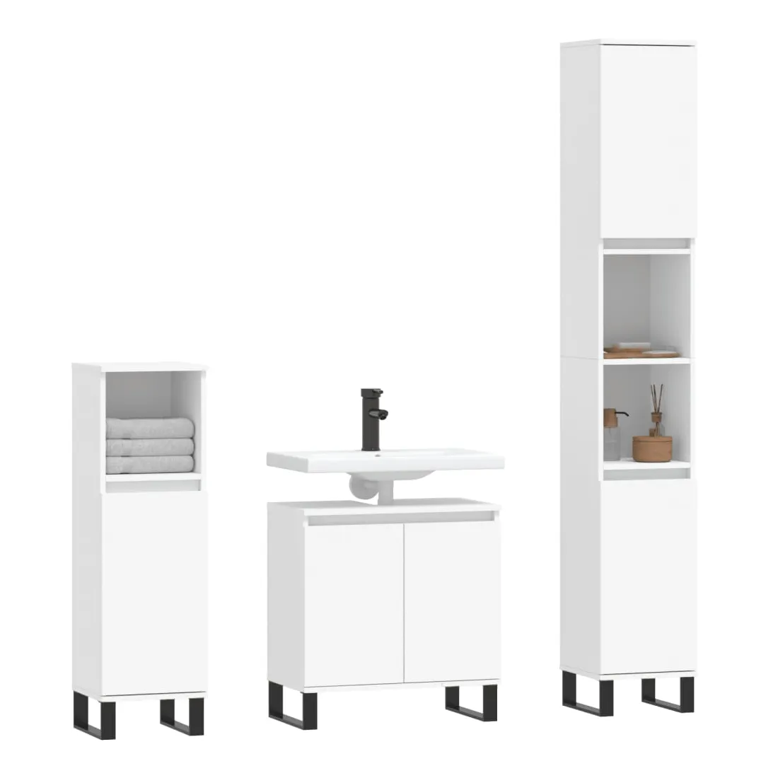 Cet ensemble d'armoires de salle de bain attrayant, avec un grand espace de rangement, présente un design élégant mais pratique. Matériau durable : le bois d'ingénierie est d'une qualité exceptionnelle avec une surface lisse et présente également résistance, stabilité et résistance à l'humidité. Grand espace de rangement : l'espace de rangement facilite l'organisation des articles dans ces meubles de salle de bain. Pieds en métal : les pieds en métal ajoutent un style moderne et calme à votre intérieur tout en assurant la stabilité.Surface facile à nettoyer : l'ensemble de salle de bain est facile à nettoyer avec un chiffon humide. Attention :Pour éviter qu'il ne soit renversé, ce produit doit être utilisé avec le dispositif de fixation au mur fourni. Bon à savoir :Les vis et les chevilles pour l'intérieur du mur ne sont pas incluses. Nous vous conseillons de trouver et d'utiliser des vis et des chevilles adaptées spécifiquement à vos murs. Si vous n'êtes pas sûr, vous pouvez consulter un professionnel. Veuillez lire et suivre chaque étape des instructions.Le lavabo n'est pas inclus dans la livraison.