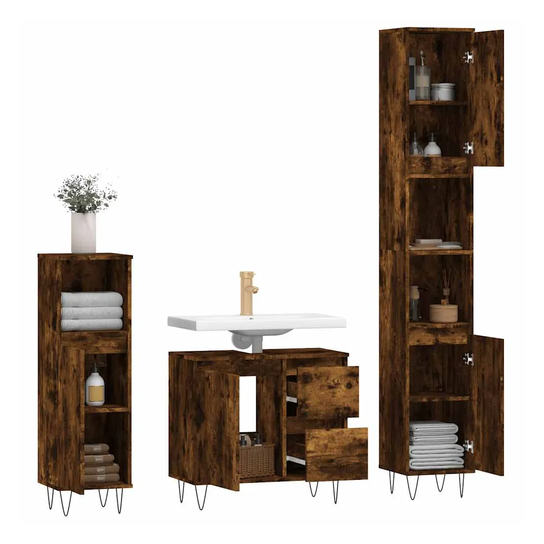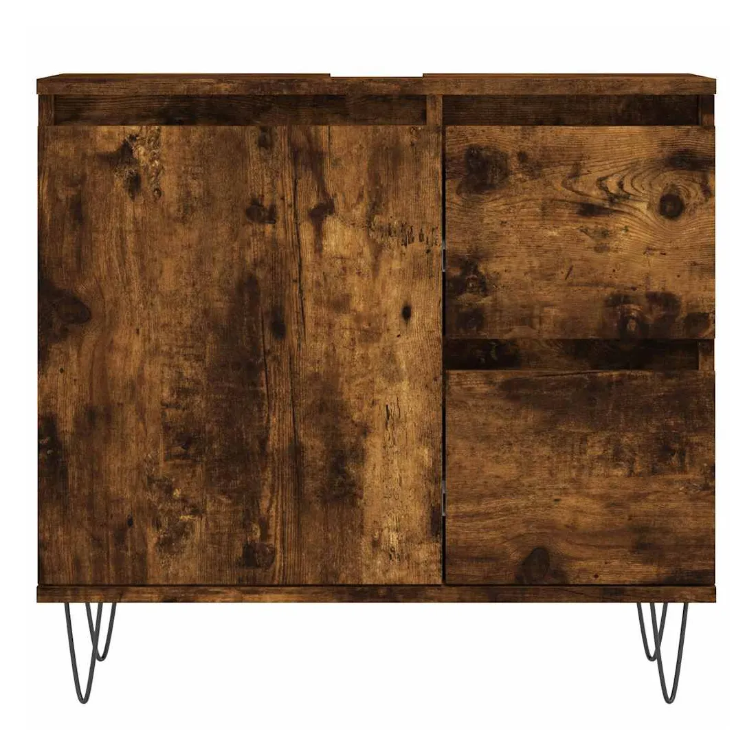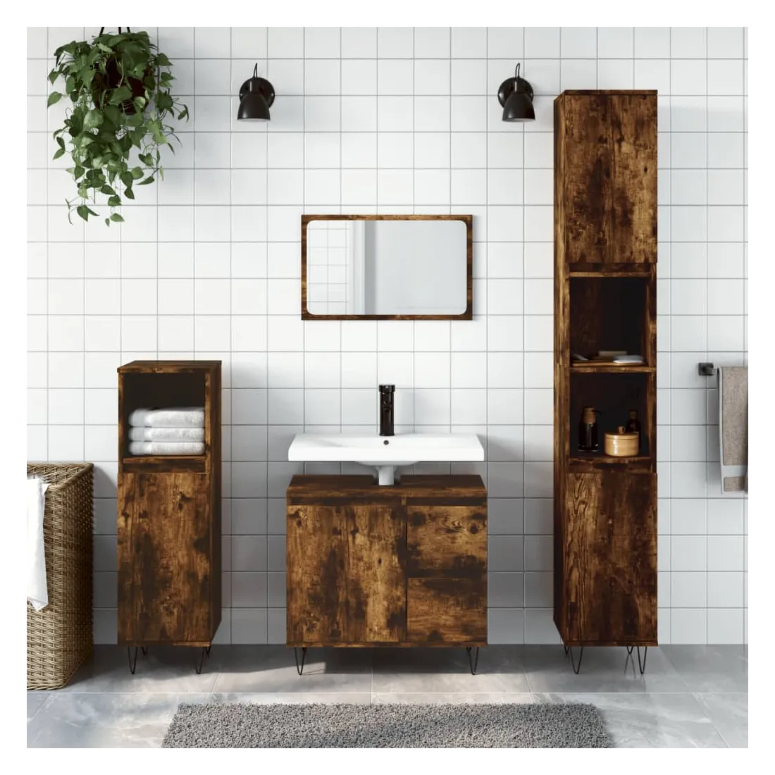 Cet ensemble de meubles de salle de bain tendance est un excellent supplément à votre salle de bain, ce qui lui donne une apparence ordonnée et saisissante ! Matériau durable : le bois d'ingénierie est d'une qualité exceptionnelle avec une surface lisse et présente également résistance, stabilité et résistance à l'humidité. Pieds en fer : les pieds en fer ajoutent un style moderne et calme à votre intérieur tout en assurant la stabilité.Grand espace de rangement : l'armoire de salle de bain offre diverses options de rangement et un espace spacieux pour ranger des articles dans votre salle de bain. Design pratique : le dessus du meuble-lavabo de salle de bain est idéal pour placer le lavabo. Attention :Pour éviter qu'il ne soit renversé, ce produit doit être utilisé avec le dispositif de fixation au mur fourni. Bon à savoir :Le lavabo n'est pas inclus dans la livraison.Les vis et les chevilles pour l'intérieur du mur ne sont pas incluses. Nous vous conseillons de trouver et d'utiliser des vis et des chevilles adaptées spécifiquement à vos murs. Si vous n'êtes pas sûr, vous pouvez consulter un professionnel. Veuillez lire et suivre chaque étape des instructions.