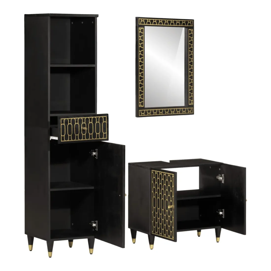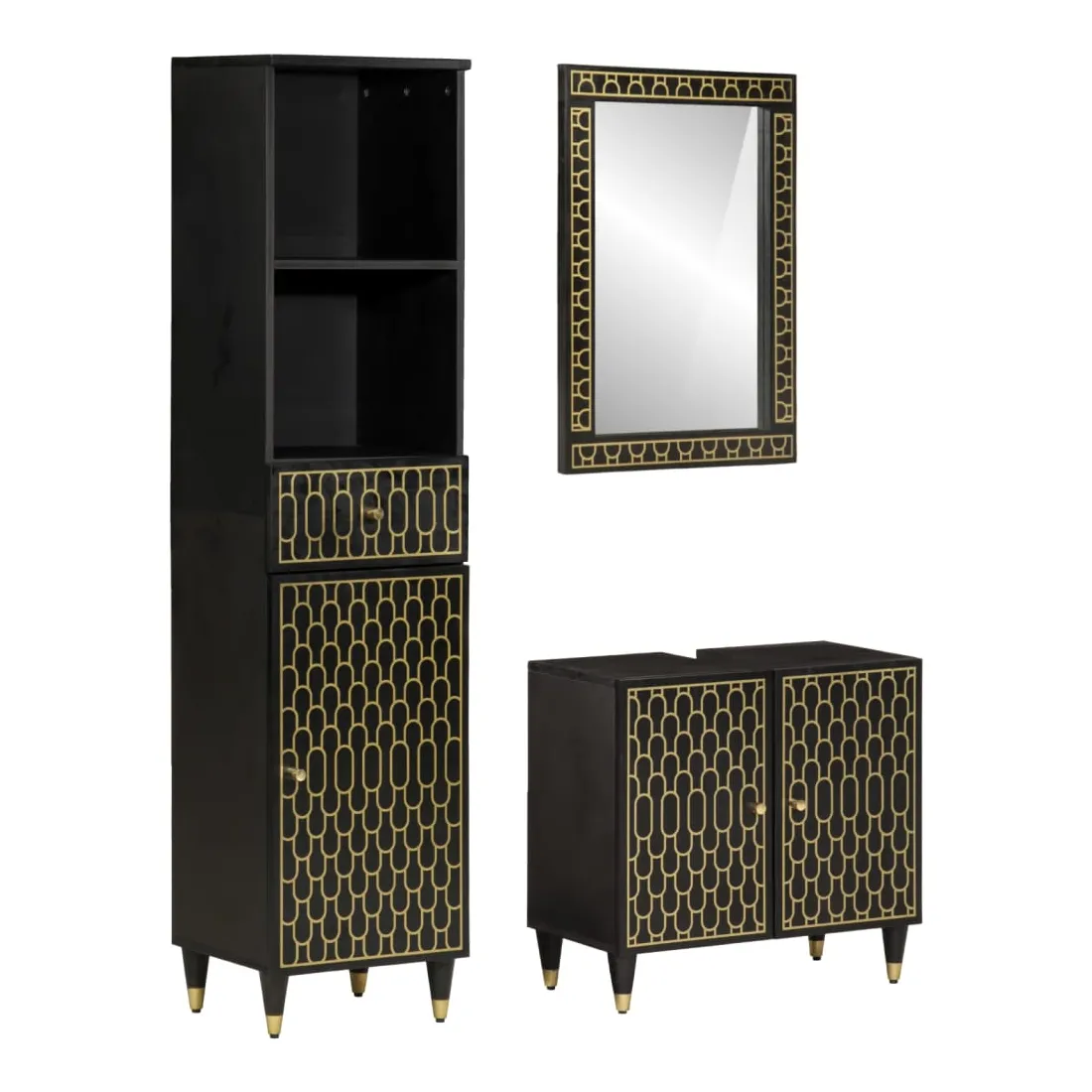 Cet ensemble de meubles de salle de bain pratique, avec un espace de rangement spacieux, est un excellent supplément à votre salle de bain, ce qui lui donne une apparence ordonnée et saisissante ! Bois de manguier massif : le bois de manguier massif est un bois dur tropical solide qui fait des meubles robustes. Ses beaux grains de bois rendent chaque meuble légèrement différent l'un de l'autre. Grand espace de rangement : les meubles de salle de bain en bois offrent diverses options de rangement et un espace spacieux pour ranger des objets dans votre salle de bain. Design peu encombrant : le miroir de courtoisie peut être facilement fixé au mur pour économiser de l'espace au sol. Le haut de l'armoire de toilette est idéal pour placer l'évier, ce qui permet d'utiliser pleinement l'espace libre sous l'évier. Image claire : la face en verre du miroir offre une réflexion fine et non déformée. Il convient donc pour se maquiller, se raser ou vérifier son costume avant de sortir. Attention :Pour éviter qu'il ne bascule, ce produit doit être utilisé avec le dispositif de fixation murale fourni. Bon à savoir :Chaque article est unique, avec des variations de couleurs et de grains. La livraison est aléatoire, ce qui garantit l'exclusivité et l'individualité de votre produit. Les vis et les chevilles pour l'intérieur du mur ne sont pas incluses. Nous vous conseillons de trouver et d'utiliser des vis et des chevilles adaptées spécifiquement à vos murs. Si vous n'êtes pas sûr, vous pouvez consulter un professionnel. Veuillez lire et suivre chaque étape des instructions.