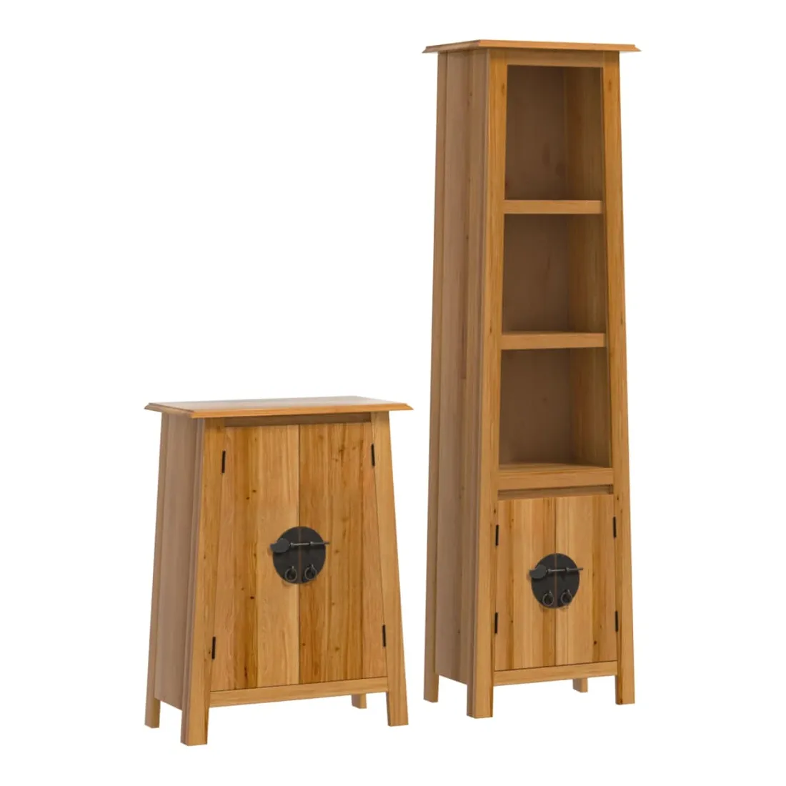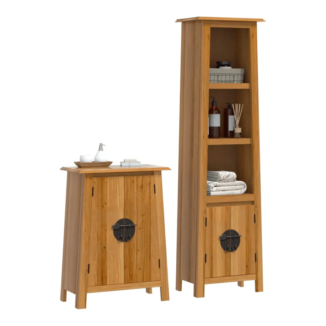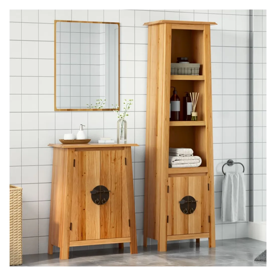 Cet ensemble de meubles de salle de bain est un excellent supplément à votre salle de bain, ce qui lui donne une apparence ordonnée et saisissante ! Bois de pin massif : le bois de pin massif est un matériau naturel magnifique. Le bois de pin a un grain droit et les nœuds donnent au matériau son aspect caractéristique et rustique.Grand espace de rangement : l'armoire de salle de bain offre suffisamment d'espace pour ranger facilement vos articles de toilette et articles de bain essentiels tels que savons, shampoing, dentifrice, etc.Poignées pratiques : les poignées en métal vous permettent d'ouvrir facilement le meuble de rangement de la salle de bains pour obtenir ce que vous voulez. Attention :Pour éviter qu'il ne bascule, ce produit doit être utilisé avec le dispositif de fixation murale (non fourni). Bon à savoir :Chaque article est unique, avec des variations de couleurs et de grains. La livraison est aléatoire, ce qui garantit l'exclusivité et l'individualité de votre produit.