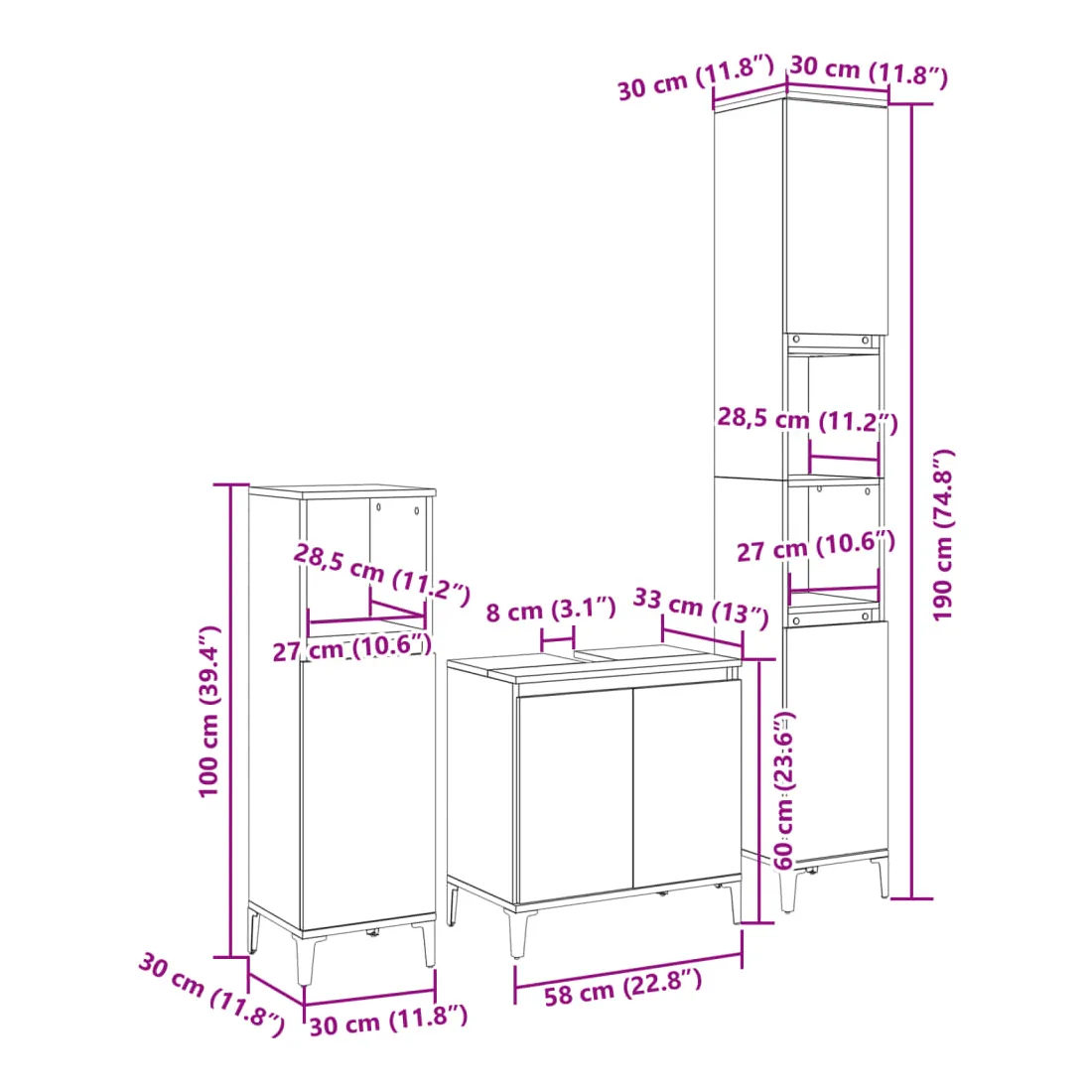 - Dimensions de l'armoire de salle de bain (basse) : 30 x 30 x 100 cm (L x l x H)