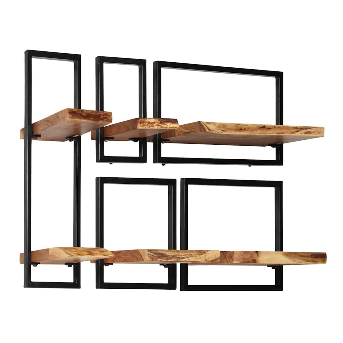 Cet ensemble d'étagères murales se compose de 5 étagères de différentes tailles et transforme un mur vide en un élément spécial grâce à son design rétro. Les étagères en bois massif sont idéales pour exposer divers articles tels que livres, prix, objets de collection, ornements, etc. Le set d'étagères combine des étagères en bois dur d'acacia massif avec des cadres stables en acier enduit de poudre. Les étagères en bois dur d'acacia sont solides, stables et durables et les grains de bois visibles dégagent un charme rustique, tandis que les cadres en acier ajoutent à l'aspect industriel de l'ensemble. Les étagères peuvent être utilisées séparément ou ensemble pour s'assortir à votre décoration intérieure. L'ensemble d'étagères murales est facile à monter. Remarque importante : les coule