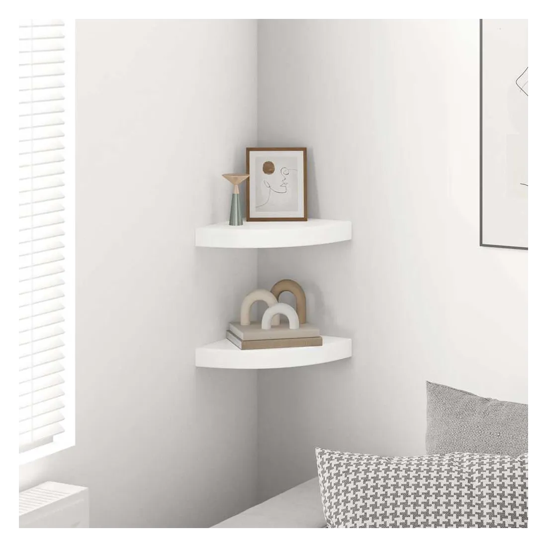 Cet ensemble de deux étagères d'angle élégantes est idéal pour exposer vos livres préférés, vos objets décoratifs, vos photos, vos récompenses, etc. Cette étagère de présentation, fabriquée en MDF alvéolé de qualité et en métal robuste, est stable et durable. Grâce à son système de fixation invisible, cette étagère murale est facile à installer et constitue l'espace idéal pour ranger vos objets tels que vos récompenses, livres, objets de collection, décorations, etc. Cette étagère flottante s'adapte à tous les styles de décoration et transforme un mur vide en un élément design !