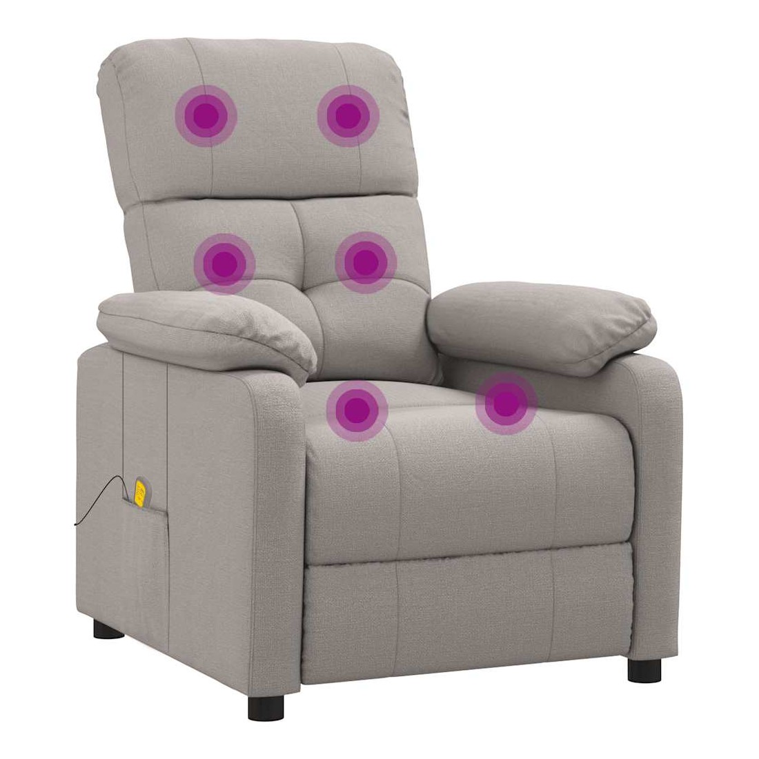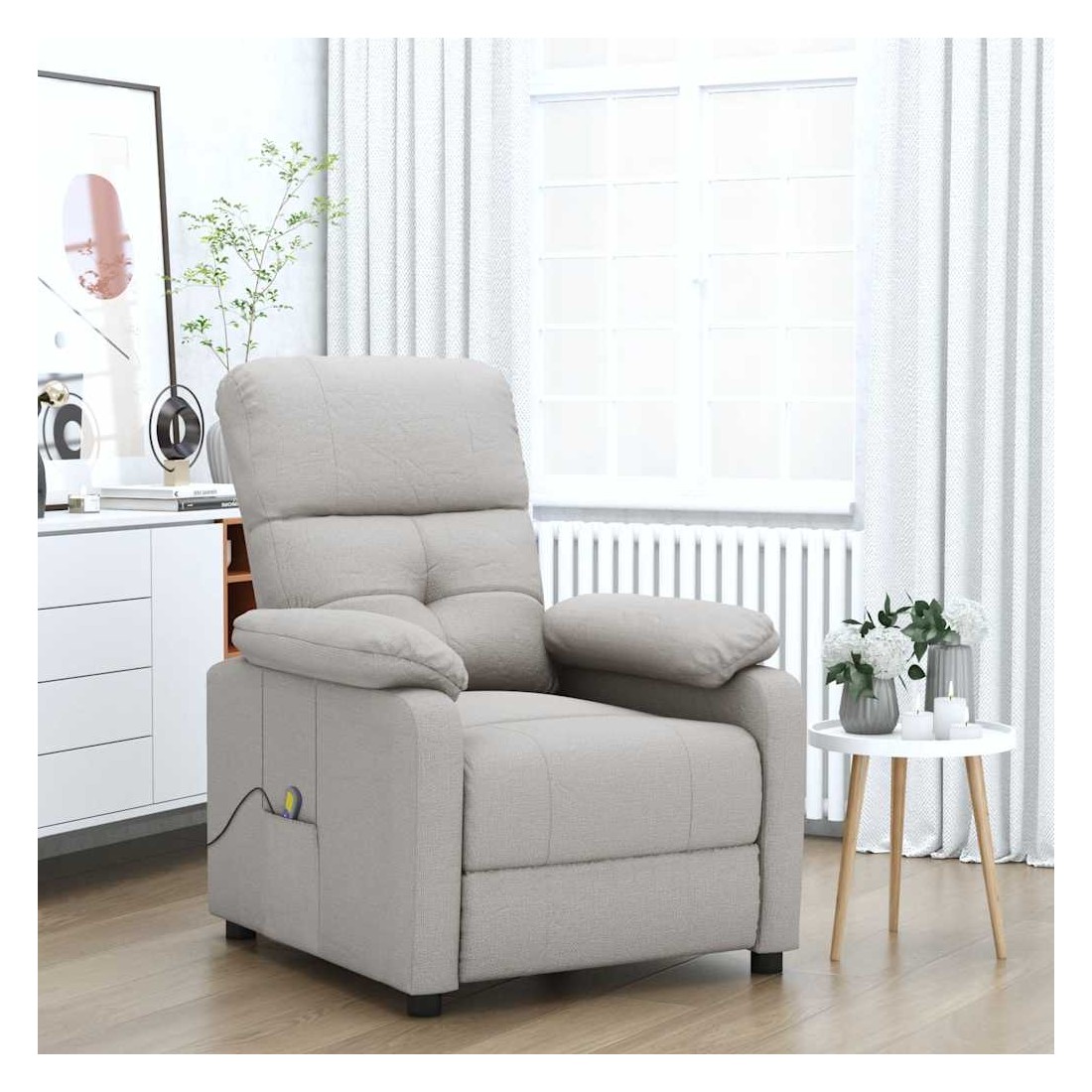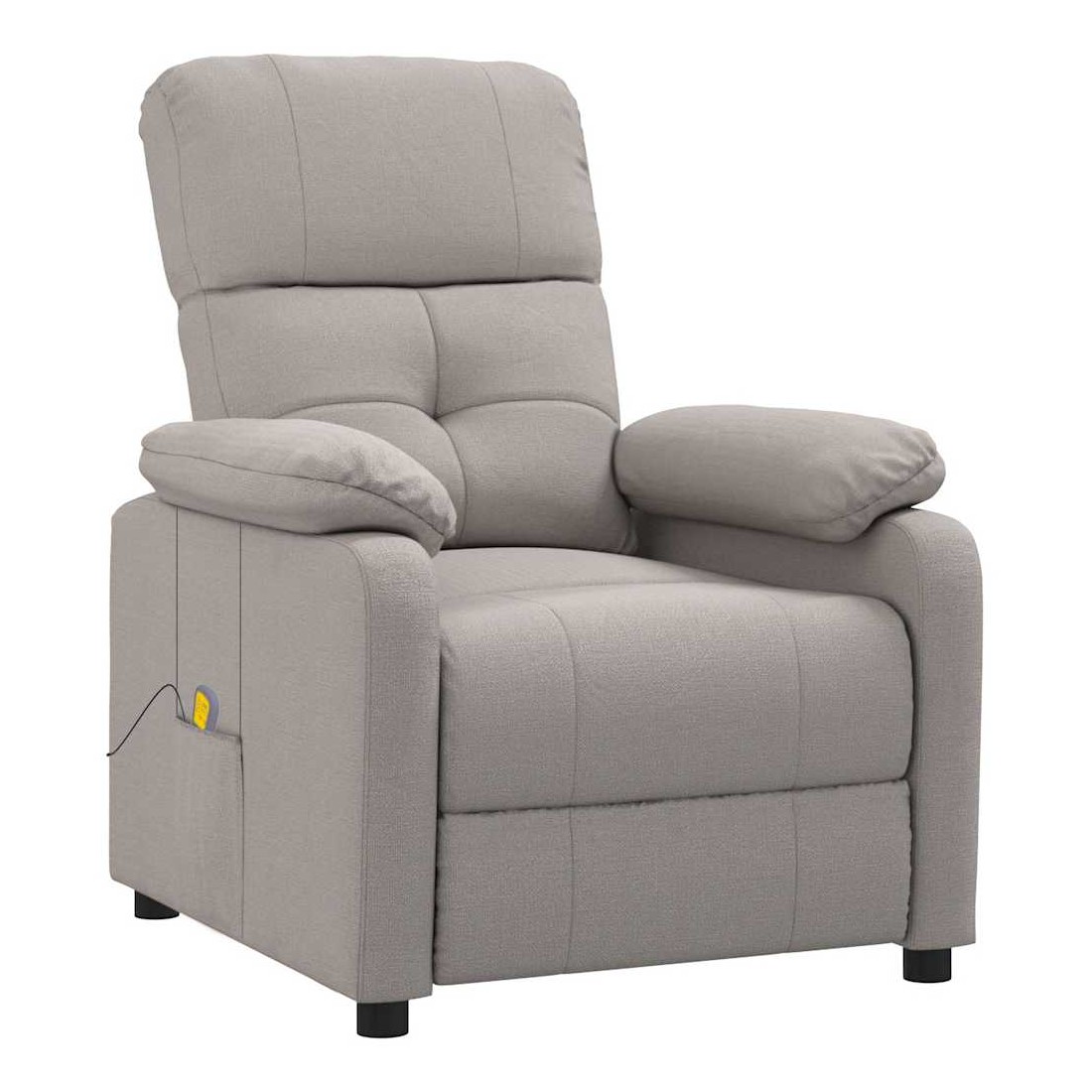 Asseyez-vous et détendez-vous dans ce fauteuil de massage très confortable ! Fonction d'inclinaison manuelle : le fauteuil inclinable est spécialement conçu avec 3 positions d'inclinaison afin que vous puissiez régler manuellement le dossier et le repose-pieds selon votre confort.Fonction de vibration : les 6 points de massage vous permettent de faire l'expérience d'un massage mieux ciblé. De plus, la télécommande incluse vous permet de choisir différents programmes de massage. La fonction de massage est alimentée par le connecteur USB, mais la source d'alimentation USB 5V certifiée n'est pas incluse.Expérience d'assise confortable : le siège, le dossier et les larges accoudoirs rembourrés épais recouverts de tissu procurent une sensation confortable et chaleureuse, vous permettant de vous sentir enveloppé lorsque vous êtes assis. Le tissu présente un aspect simple et épuré, et est respirant et durable.Cadre solide et stable : le cadre en bois et en métal offre une structure solide et une grande stabilité. Ce fauteuil inclinable est confortable et durable.