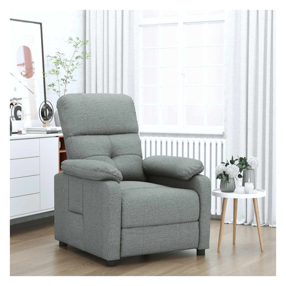 Asseyez-vous et détendez-vous dans ce fauteuil inclinable très confortable ! Fonction d'inclinaison manuelle : le fauteuil inclinable est spécialement conçu avec 3 positions d'inclinaison afin que vous puissiez régler manuellement le dossier et le repose-pieds selon votre confort. Expérience d'assise confortable : le siège, le dossier et les larges accoudoirs rembourrés épais recouverts de tissu procurent une sensation confortable et chaleureuse, vous permettant de vous sentir enveloppé lorsque vous êtes assis. Le tissu présente un aspect simple et épuré, et est respirant et durable. Cadre solide et stable : le cadre en bois et en métal offre une structure solide et une grande stabilité. Ce fauteuil inclinable est confortable et durable.