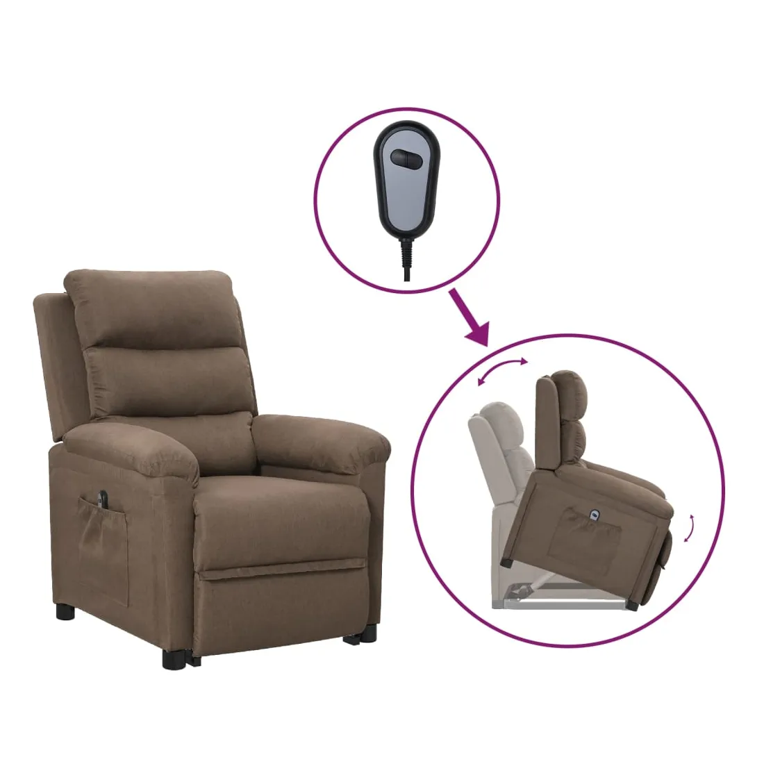 Asseyez-vous et détendez-vous dans ce fauteuil très confortable ! Fonction d'inclinaison manuelle : le fauteuil inclinable est spécialement conçu avec 3 positions d'inclinaison afin que vous puissiez régler manuellement le dossier et le repose-pieds selon votre confort. Fonction de levage électrique : ce fauteuil inclinable pour personnes âgées est équipé d'un moteur électrique pour la fonction de levage. Grâce à la fonction qui pousse toute la chaise vers le haut, vous pouvez facilement vous tenir debout sans stresser votre dos et vos genoux grâce à la commande manuelle à 2 boutons. Expérience d'assise confortable : le siège, le dossier et les larges accoudoirs rembourrés épais recouverts de tissu procurent une sensation confortable et chaleureuse, vous permettant de vous sentir envel