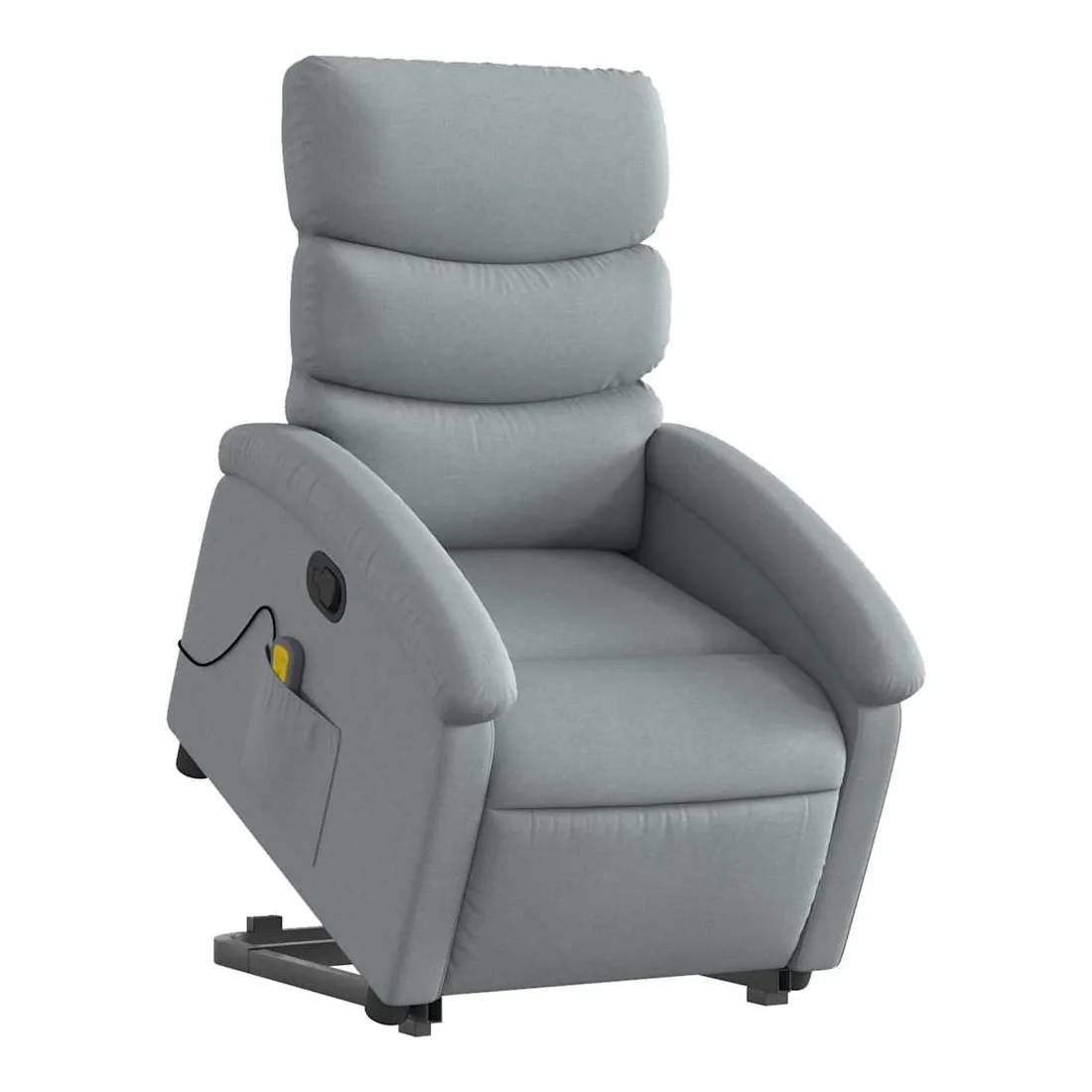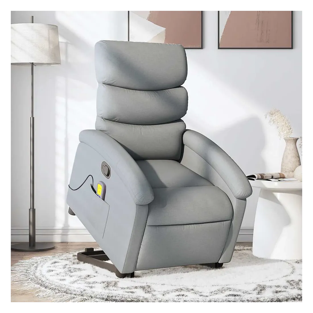 Asseyez-vous et détendez-vous dans ce fauteuil inclinable de massage très confortable ! Fonction de levage électrique : ce fauteuil inclinable pour personnes âgées est équipé d'un moteur électrique pour la fonction de levage. Grâce à la fonction qui pousse toute la chaise vers le haut, vous pouvez facilement vous tenir debout sans stresser votre dos et vos genoux en appuyant simplement sur le bouton.Fonction d'inclinaison manuelle : ce fauteuil inclinable est doté d'une poignée du côté droit. Vous pouvez régler manuellement le repose-pieds et le dossier dans n'importe quelle position selon votre confort en tirant simplement sur la poignée. Cette fonction permet une inclinaison maximale de 135 degrés. De plus, le dossier peut revenir rapidement à sa position d'origine en tirant simplement sur la poignée.Fonction de vibration : les 6 points de massage vous permettent de faire l'expérience d'un massage mieux ciblé. De plus, la télécommande incluse vous permet de choisir différents programmes de massage. La fonction de massage est alimentée par le connecteur USB qui nécessite une source d'alimentation USB certifiée de 5 V (non fournie).Expérience d'assise confortable : le siège, le dossier et les larges accoudoirs bien rembourrés recouverts de tissu procurent une sensation confortable et chaleureuse, vous permettant de vous sentir enveloppé lorsque vous êtes assis. Le tissu présente un aspect simple et épuré et est respirant et durable.Poche latérale pratique : ce fauteuil est doté d'une poche latérale pour ranger votre télécommande ou garder vos objets essentiels à portée de main.Cadre solide et stable : le cadre en bois et en métal offre une structure solide et une grande stabilité. Ce fauteuil inclinable est confortable et durable.