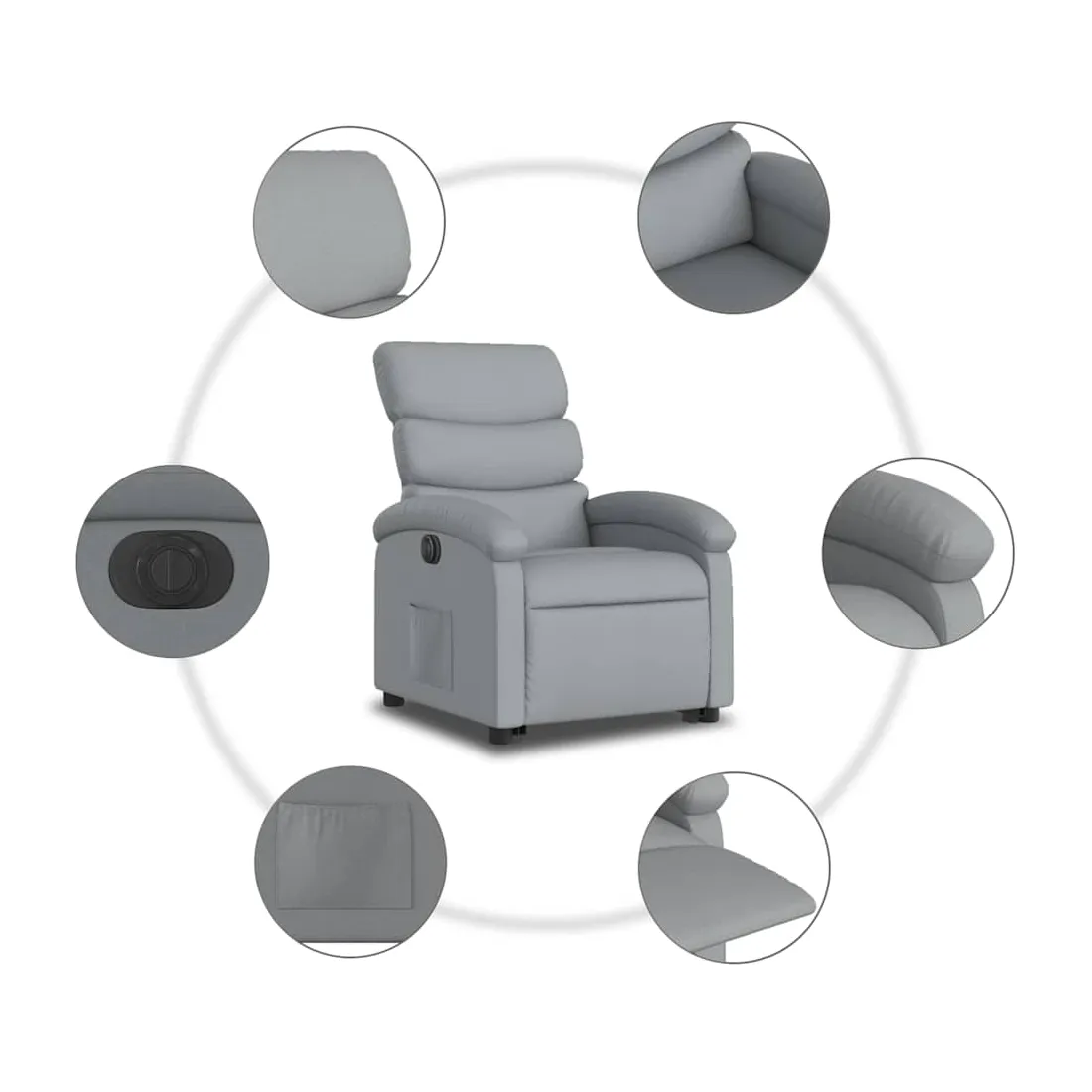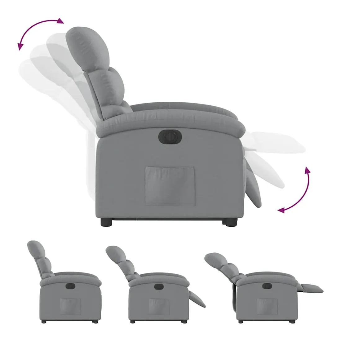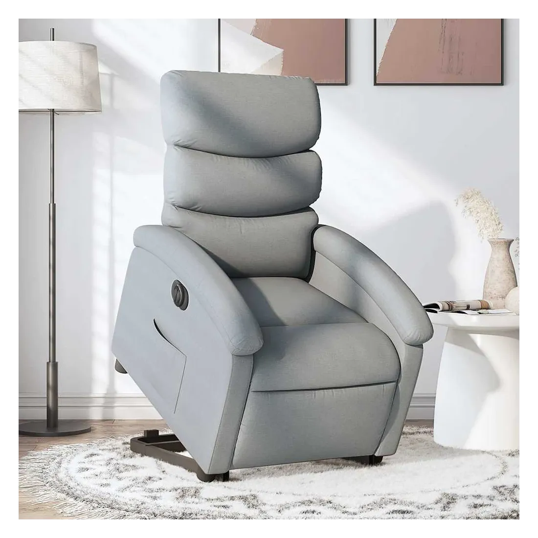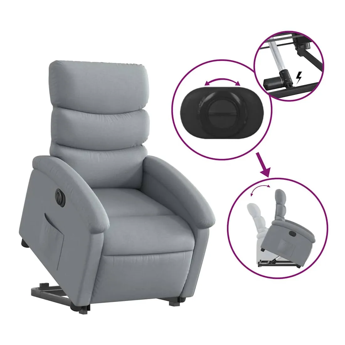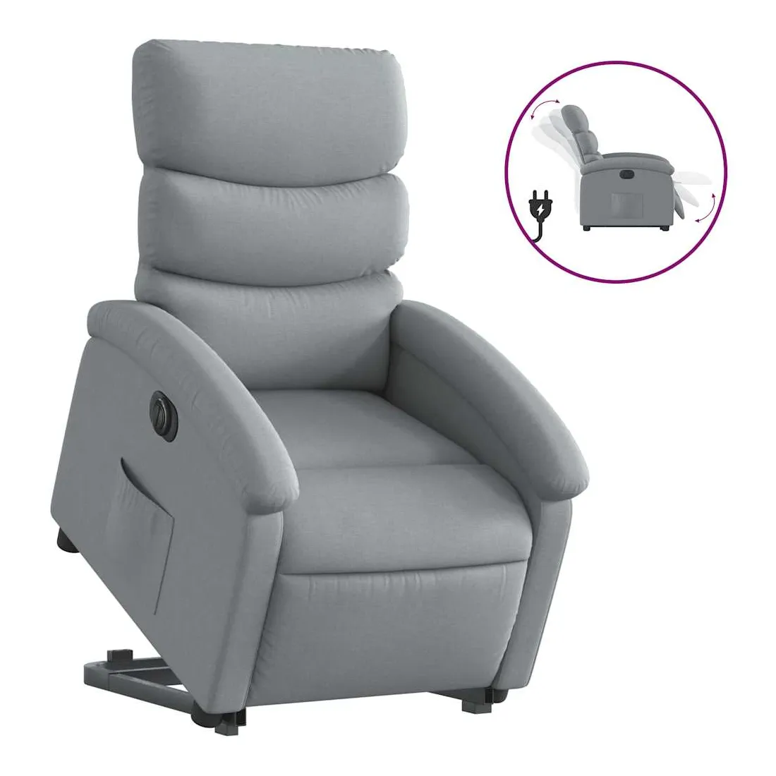 Asseyez-vous et détendez-vous dans ce fauteuil inclinable électrique très confortable ! Fonction de levage électrique : ce fauteuil inclinable pour personnes âgées est équipé d'un moteur électrique pour la fonction de levage. Grâce à la fonction qui pousse toute la chaise vers le haut, vous pouvez facilement vous tenir debout sans stresser votre dos et vos genoux en appuyant simplement sur le bouton.Fonction d'inclinaison électrique : ce fauteuil inclinable est également équipé d'un moteur électrique qui permet de régler automatiquement le repose-pied et le dossier dans n'importe quelle position, selon votre confort, en appuyant simplement sur le bouton situé sur le côté du fauteuil. Cette fonction permet une inclinaison maximale de 135 degrés. En outre, le dossier peut revenir automatiquement à sa position d'origine par une simple pression sur le bouton.Expérience d'assise confortable : le siège, le dossier et les larges accoudoirs bien rembourrés recouverts de tissu procurent une sensation confortable et chaleureuse, vous permettant de vous sentir enveloppé lorsque vous êtes assis. Le tissu présente un aspect simple et épuré et est respirant et durable.Poche latérale pratique : ce fauteuil est doté d'une poche latérale pour vous permettre de garder vos objets essentiels à portée de main.Cadre solide et stable : le cadre en bois et en métal offre une structure solide et une grande stabilité. Ce fauteuil inclinable est confortable et durable.