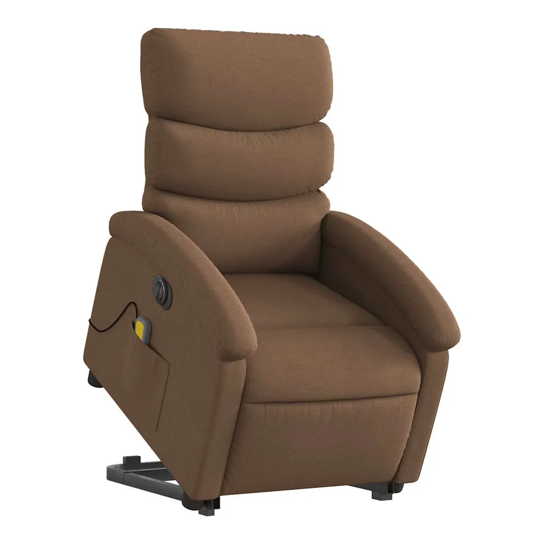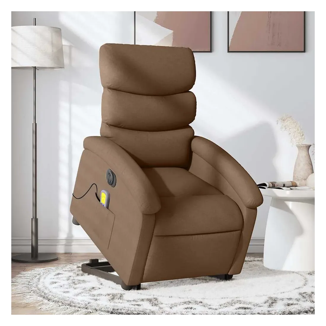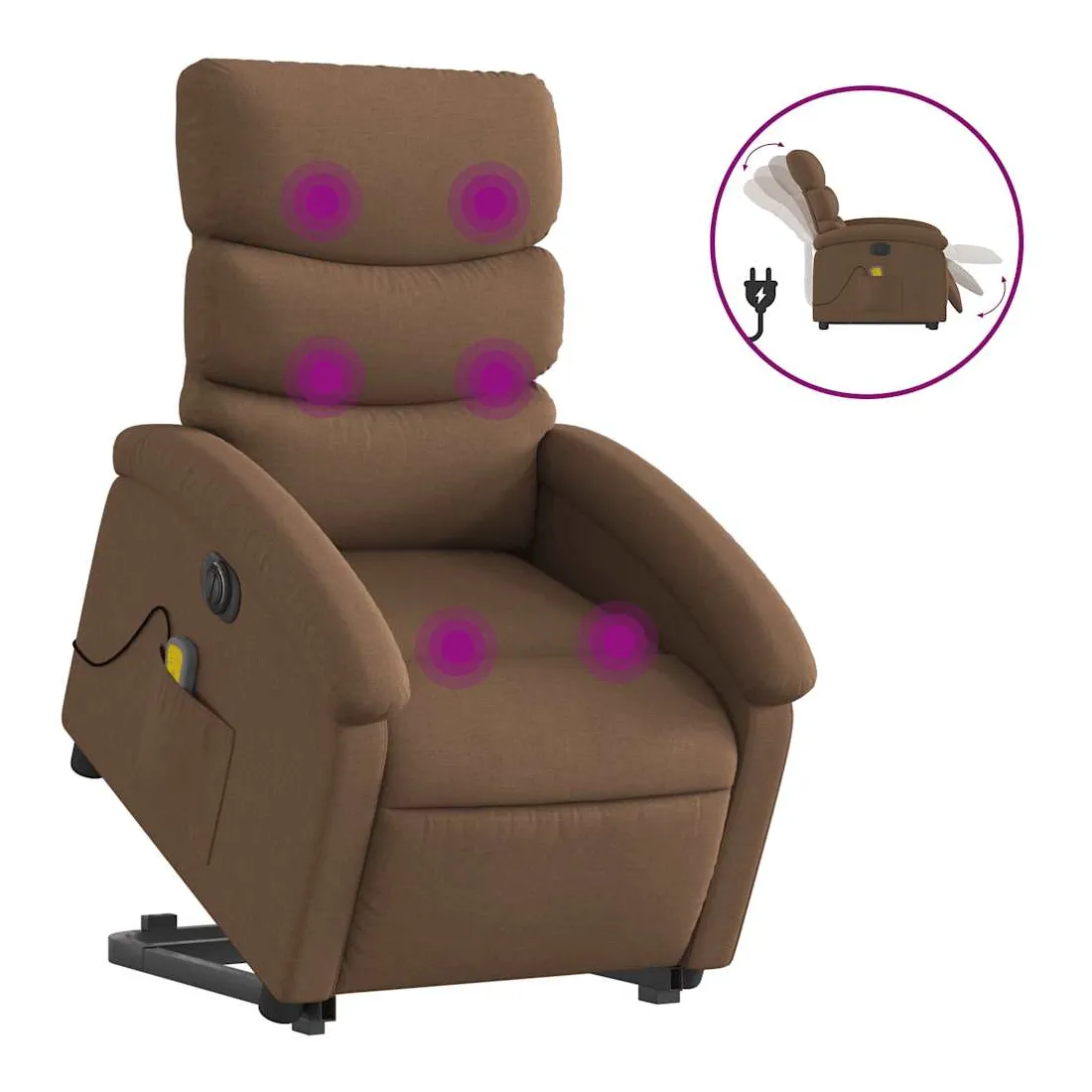 Asseyez-vous et détendez-vous dans ce fauteuil inclinable de massage électrique très confortable ! Fonction de levage électrique : ce fauteuil inclinable pour personnes âgées est équipé d'un moteur électrique pour la fonction de levage. Grâce à la fonction qui pousse toute la chaise vers le haut, vous pouvez facilement vous tenir debout sans stresser votre dos et vos genoux en appuyant simplement sur le bouton.Fonction d'inclinaison électrique : ce fauteuil inclinable est également équipé d'un moteur électrique qui permet de régler automatiquement le repose-pied et le dossier dans n'importe quelle position, selon votre confort, en appuyant simplement sur le bouton situé sur le côté du fauteuil. Cette fonction permet une inclinaison maximale de 135 degrés. En outre, le dossier peut revenir automatiquement à sa position d'origine par une simple pression sur le bouton.Fonction de vibration : les 6 points de massage vous permettent de faire l'expérience d'un massage mieux ciblé. De plus, la télécommande incluse vous permet de choisir différents programmes de massage. La fonction de massage est alimentée par le connecteur USB qui nécessite une source d'alimentation USB certifiée de 5 V (non fournie).Expérience d'assise confortable : le siège, le dossier et les larges accoudoirs bien rembourrés recouverts de tissu procurent une sensation confortable et chaleureuse, vous permettant de vous sentir enveloppé lorsque vous êtes assis. Le tissu présente un aspect simple et épuré et est respirant et durable.Poche latérale pratique : ce fauteuil est doté d'une poche latérale pour ranger votre télécommande ou garder vos objets essentiels à portée de main.Cadre solide et stable : le cadre en bois et en métal offre une structure solide et une grande stabilité. Ce fauteuil inclinable est confortable et durable.