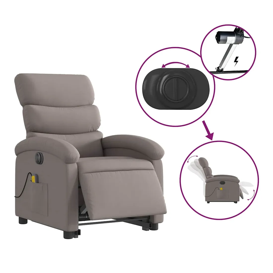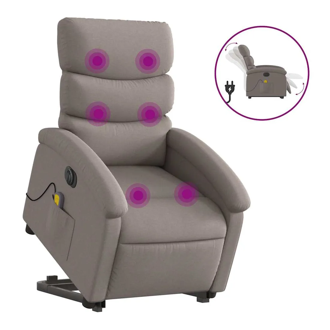 Asseyez-vous et détendez-vous dans ce fauteuil inclinable de massage électrique très confortable ! Fonction de levage électrique : ce fauteuil inclinable pour personnes âgées est équipé d'un moteur électrique pour la fonction de levage. Grâce à la fonction qui pousse toute la chaise vers le haut, vous pouvez facilement vous tenir debout sans stresser votre dos et vos genoux en appuyant simplement sur le bouton.Fonction d'inclinaison électrique : ce fauteuil inclinable est également équipé d'un moteur électrique qui permet de régler automatiquement le repose-pied et le dossier dans n'importe quelle position, selon votre confort, en appuyant simplement sur le bouton situé sur le côté du fauteuil. Cette fonction permet une inclinaison maximale de 135 degrés. En outre, le dossier peut revenir automatiquement à sa position d'origine par une simple pression sur le bouton.Fonction de vibration : les 6 points de massage vous permettent de faire l'expérience d'un massage mieux ciblé. De plus, la télécommande incluse vous permet de choisir différents programmes de massage. La fonction de massage est alimentée par le connecteur USB qui nécessite une source d'alimentation USB certifiée de 5 V (non fournie).Expérience d'assise confortable : le siège, le dossier et les larges accoudoirs bien rembourrés recouverts de tissu procurent une sensation confortable et chaleureuse, vous permettant de vous sentir enveloppé lorsque vous êtes assis. Le tissu présente un aspect simple et épuré et est respirant et durable.Poche latérale pratique : ce fauteuil est doté d'une poche latérale pour ranger votre télécommande ou garder vos objets essentiels à portée de main.Cadre solide et stable : le cadre en bois et en métal offre une structure solide et une grande stabilité. Ce fauteuil inclinable est confortable et durable.