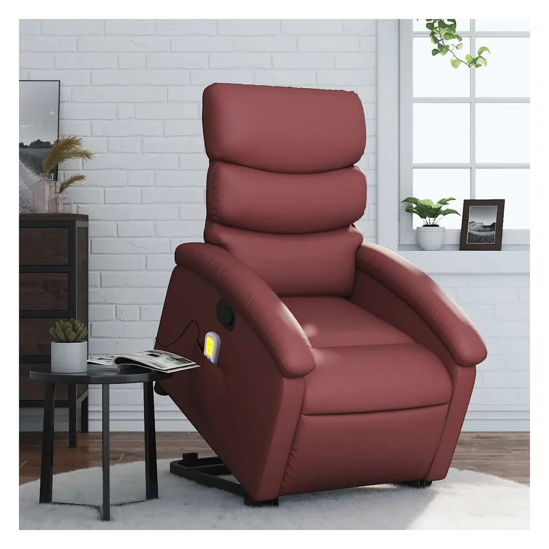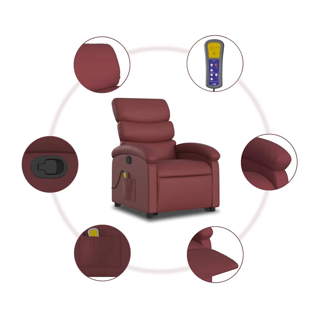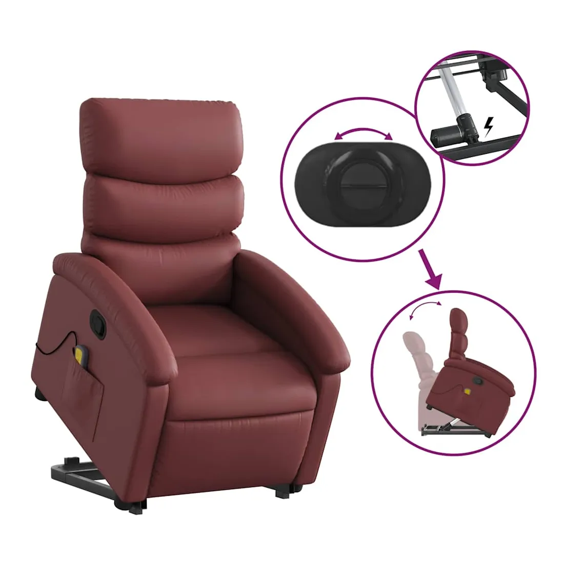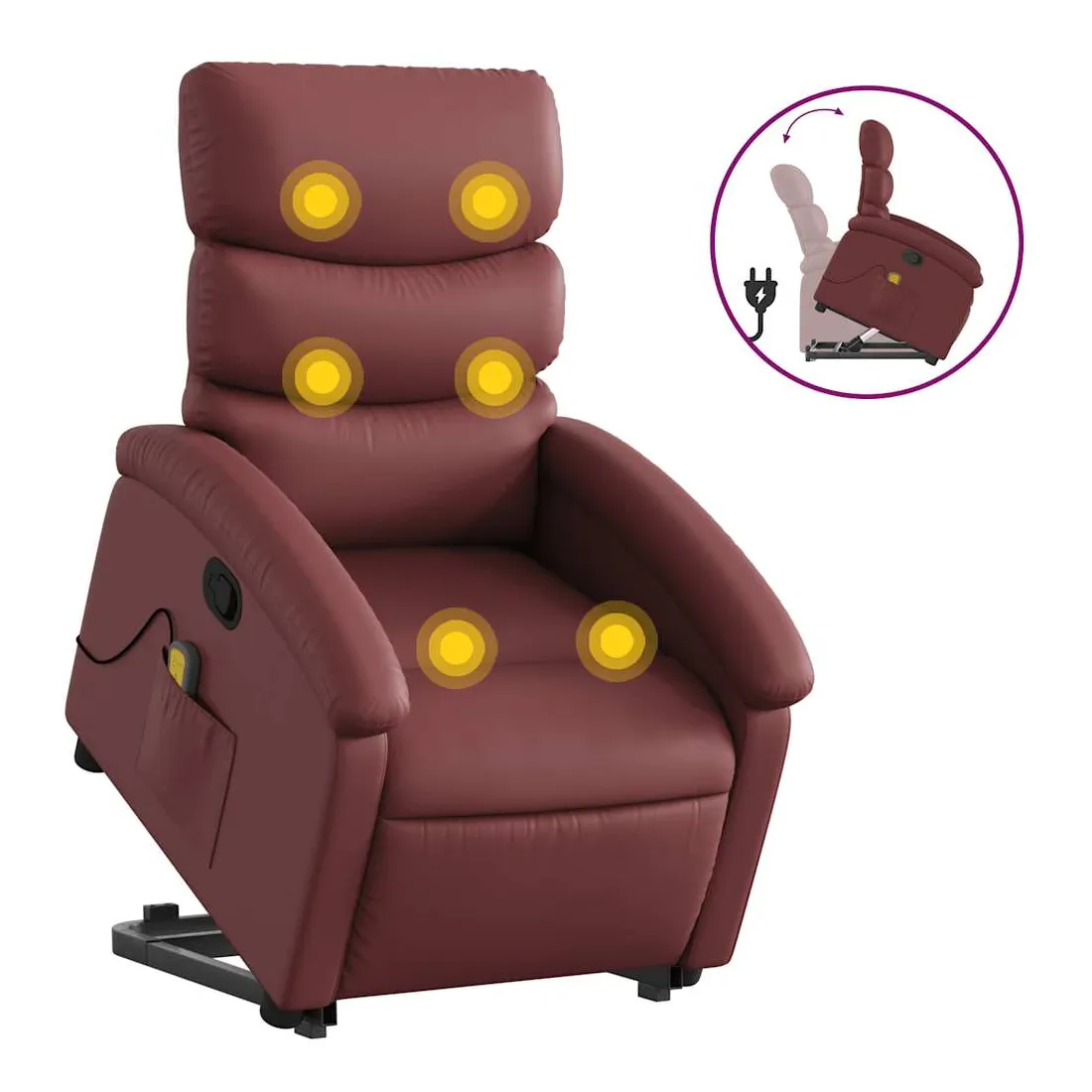 Asseyez-vous et détendez-vous dans ce fauteuil inclinable de massage très confortable ! Fonction de levage électrique : ce fauteuil inclinable pour personnes âgées est équipé d'un moteur électrique pour la fonction de levage. Grâce à la fonction qui pousse toute la chaise vers le haut, vous pouvez facilement vous tenir debout sans stresser votre dos et vos genoux en appuyant simplement sur le bouton.Fonction d'inclinaison manuelle : ce fauteuil inclinable est doté d'une poignée du côté droit. Vous pouvez régler manuellement le repose-pieds et le dossier dans n'importe quelle position selon votre confort en tirant simplement sur la poignée. Cette fonction permet une inclinaison maximale de 135 degrés. De plus, le dossier peut revenir rapidement à sa position d'origine en tirant simplement sur la poignée.Fonction de vibration : les 6 points de massage vous permettent de faire l'expérience d'un massage mieux ciblé. De plus, la télécommande incluse vous permet de choisir différents programmes de massage. La fonction de massage est alimentée par le connecteur USB qui nécessite une source d'alimentation USB certifiée de 5 V (non fournie).Expérience de siège confortable : le siège, le dossier et les larges accoudoirs rembourrés épais recouverts de similicuir procurent une sensation confortable, vous faisant vous sentir enlacé lorsque vous êtes assis. Le similicuir est un matériau très résistant. Il est résistant aux taches, ce qui le rend facile à nettoyer avec un chiffon humide. La surface lisse donne également un aspect luxueux et la beauté du cuir véritable.Poche latérale pratique : ce fauteuil est doté d'une poche latérale pour ranger votre télécommande ou garder vos objets essentiels à portée de main.Cadre solide et stable : le cadre en bois et en métal offre une structure solide et une grande stabilité. Ce fauteuil inclinable est confortable et durable.