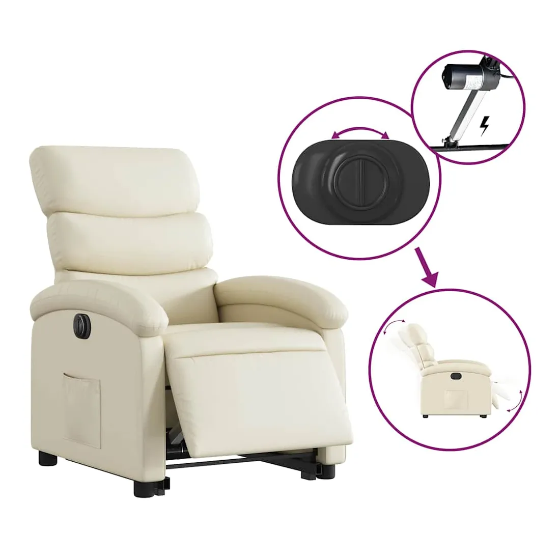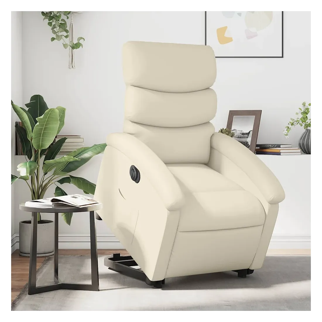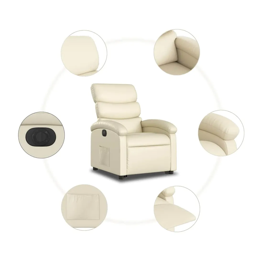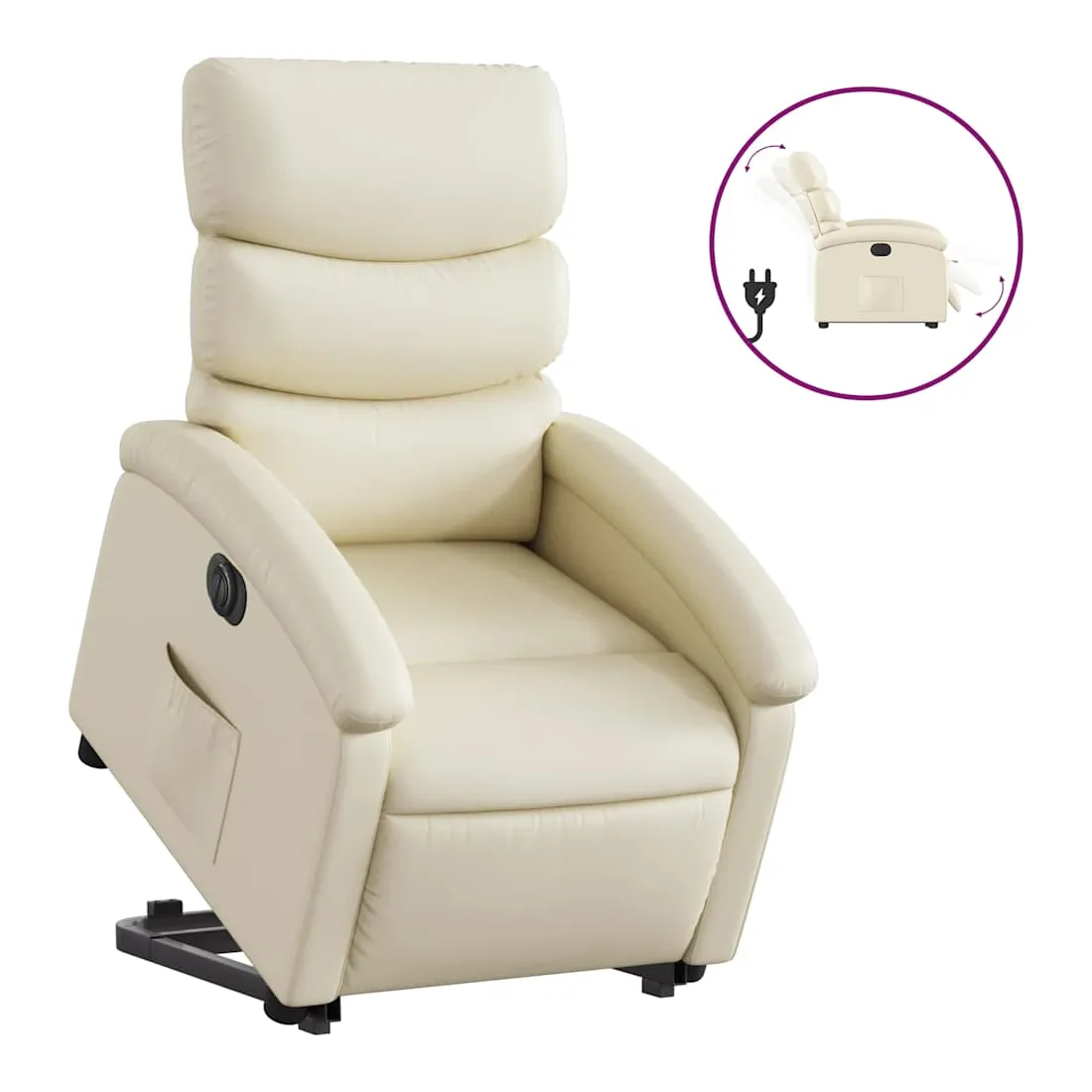 Asseyez-vous et détendez-vous dans ce fauteuil inclinable électrique très confortable ! Fonction de levage électrique : ce fauteuil inclinable pour personnes âgées est équipé d'un moteur électrique pour la fonction de levage. Grâce à la fonction qui pousse toute la chaise vers le haut, vous pouvez facilement vous tenir debout sans stresser votre dos et vos genoux en appuyant simplement sur le bouton.Fonction d'inclinaison électrique : ce fauteuil inclinable est également équipé d'un moteur électrique qui permet de régler automatiquement le repose-pied et le dossier dans n'importe quelle position, selon votre confort, en appuyant simplement sur le bouton situé sur le côté du fauteuil. Cette fonction permet une inclinaison maximale de 135 degrés. En outre, le dossier peut revenir automatiquement à sa position d'origine par une simple pression sur le bouton.Expérience de siège confortable : le siège, le dossier et les larges accoudoirs rembourrés épais recouverts de similicuir procurent une sensation confortable, vous faisant vous sentir enlacé lorsque vous êtes assis. Le similicuir est un matériau très résistant. Il est résistant aux taches, ce qui le rend facile à nettoyer avec un chiffon humide. La surface lisse donne également un aspect luxueux et la beauté du cuir véritable.Poche latérale pratique : ce fauteuil est doté d'une poche latérale pour vous permettre de garder vos objets essentiels à portée de main.Cadre solide et stable : le cadre en bois et en métal offre une structure solide et une grande stabilité. Ce fauteuil inclinable est confortable et durable.