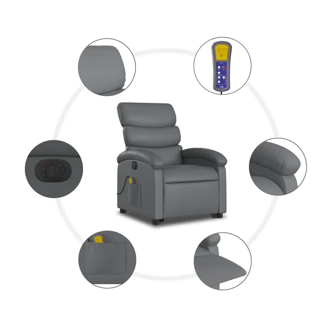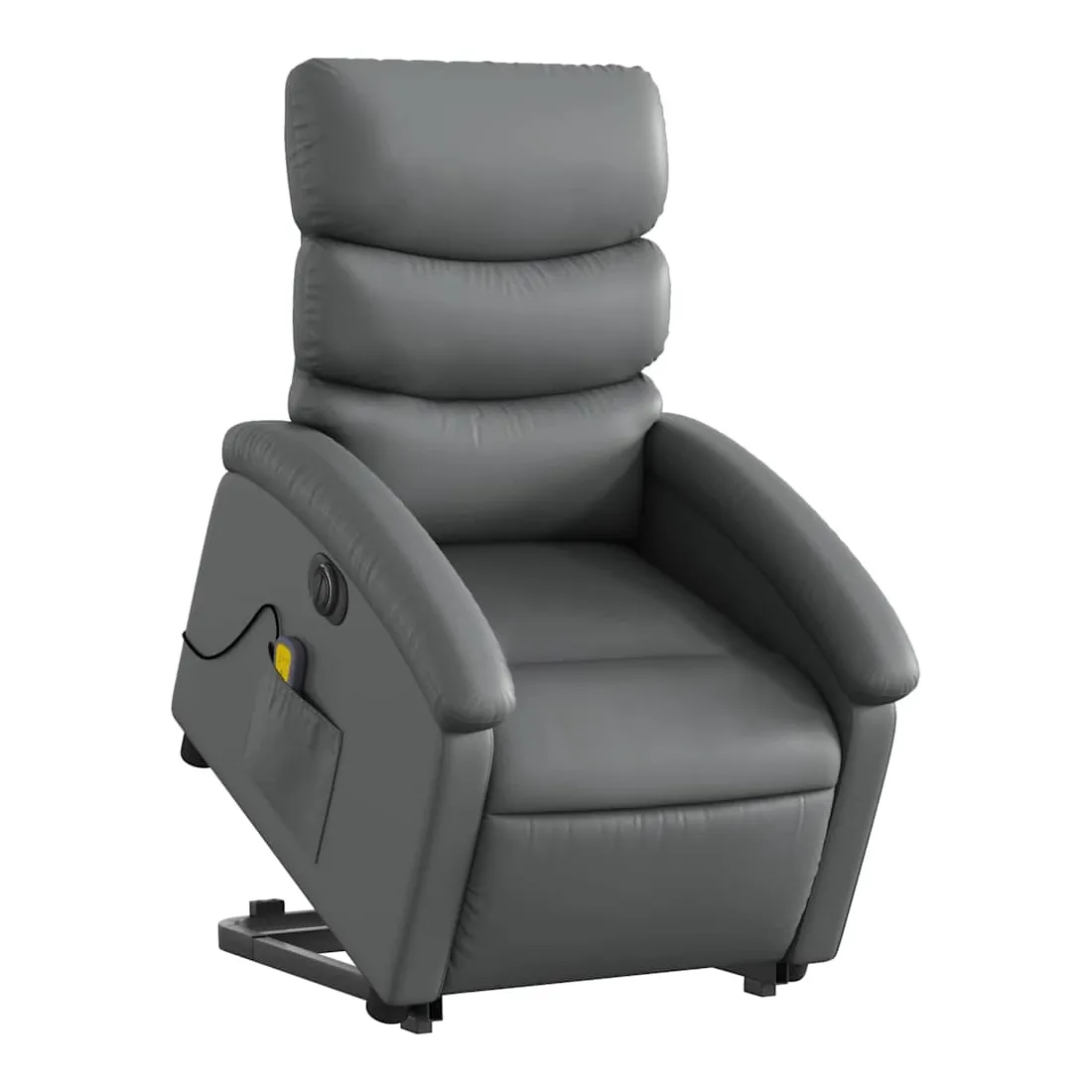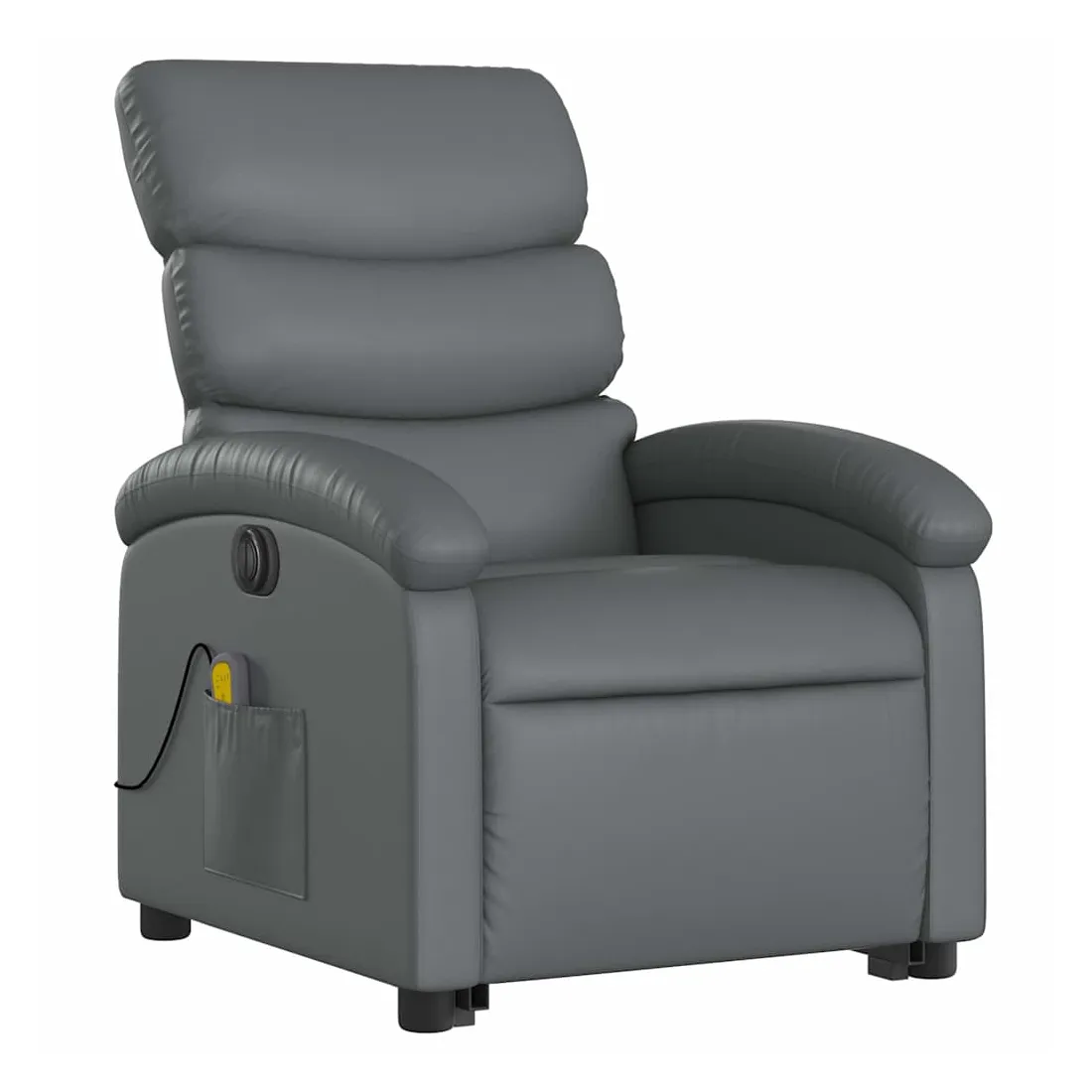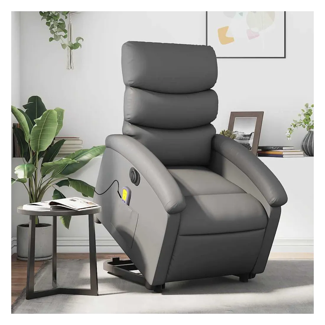 Asseyez-vous et détendez-vous dans ce fauteuil inclinable de massage électrique très confortable ! Fonction de levage électrique : ce fauteuil inclinable pour personnes âgées est équipé d'un moteur électrique pour la fonction de levage. Grâce à la fonction qui pousse toute la chaise vers le haut, vous pouvez facilement vous tenir debout sans stresser votre dos et vos genoux en appuyant simplement sur le bouton.Fonction d'inclinaison électrique : ce fauteuil inclinable est également équipé d'un moteur électrique qui permet de régler automatiquement le repose-pied et le dossier dans n'importe quelle position, selon votre confort, en appuyant simplement sur le bouton situé sur le côté du fauteuil. Cette fonction permet une inclinaison maximale de 135 degrés. En outre, le dossier peut revenir automatiquement à sa position d'origine par une simple pression sur le bouton.Fonction de vibration : les 6 points de massage vous permettent de faire l'expérience d'un massage mieux ciblé. De plus, la télécommande incluse vous permet de choisir différents programmes de massage. La fonction de massage est alimentée par le connecteur USB qui nécessite une source d'alimentation USB certifiée de 5 V (non fournie).Expérience de siège confortable : le siège, le dossier et les larges accoudoirs rembourrés épais recouverts de similicuir procurent une sensation confortable, vous faisant vous sentir enlacé lorsque vous êtes assis. Le similicuir est un matériau très résistant. Il est résistant aux taches, ce qui le rend facile à nettoyer avec un chiffon humide. La surface lisse donne également un aspect luxueux et la beauté du cuir véritable.Poche latérale pratique : ce fauteuil est doté d'une poche latérale pour ranger votre télécommande ou garder vos objets essentiels à portée de main.Cadre solide et stable : le cadre en bois et en métal offre une structure solide et une grande stabilité. Ce fauteuil inclinable est confortable et durable.
