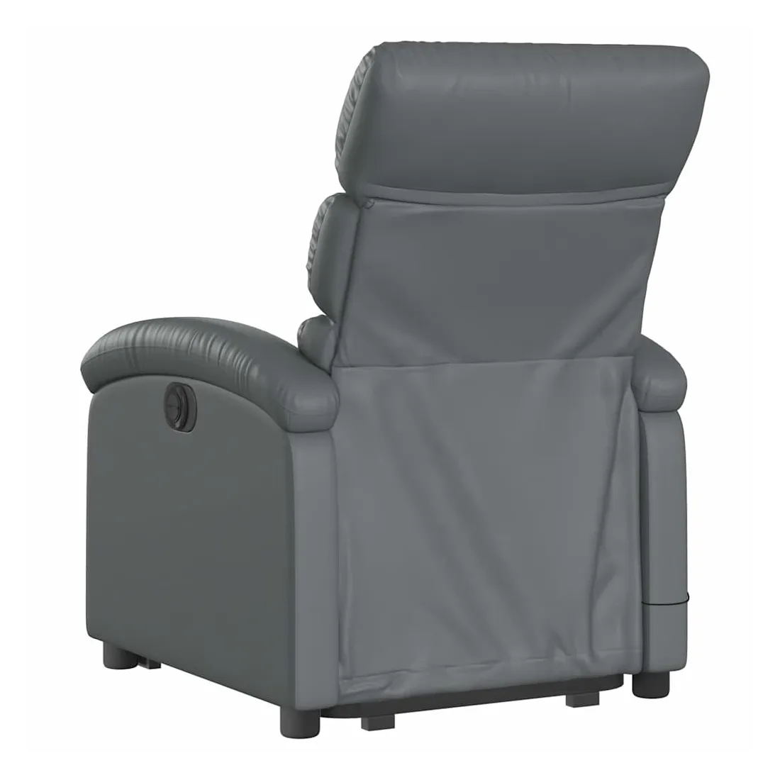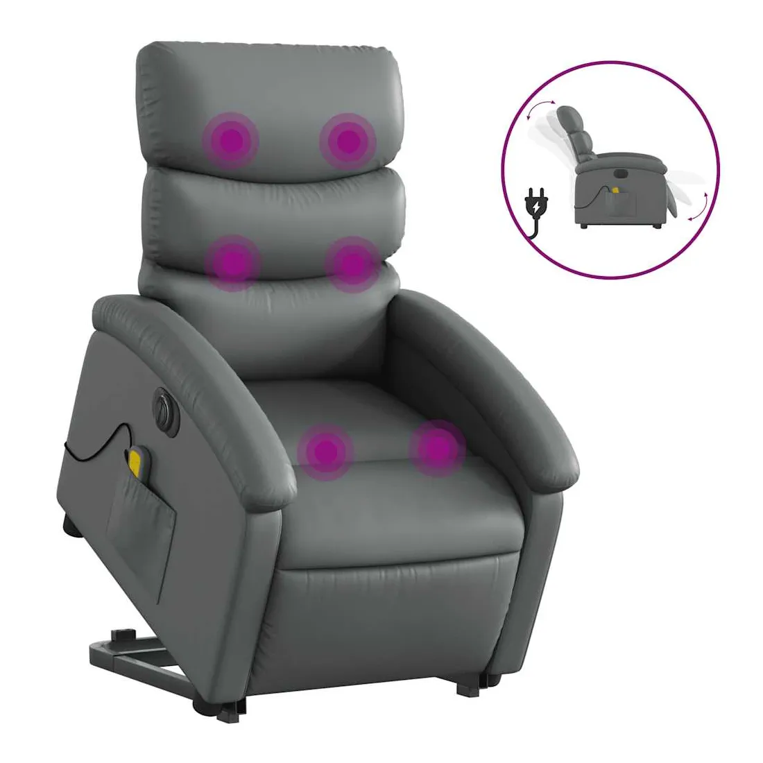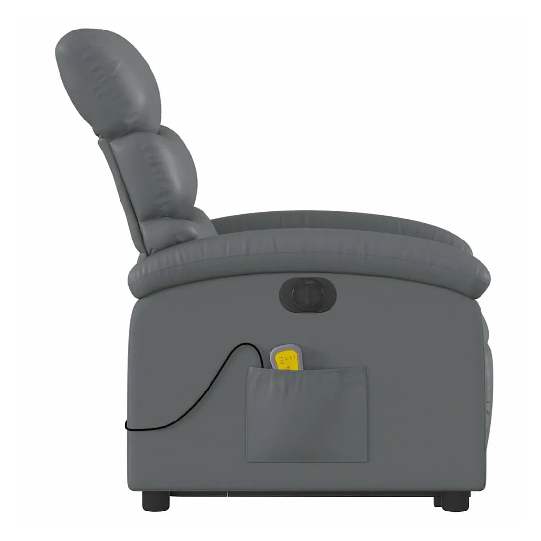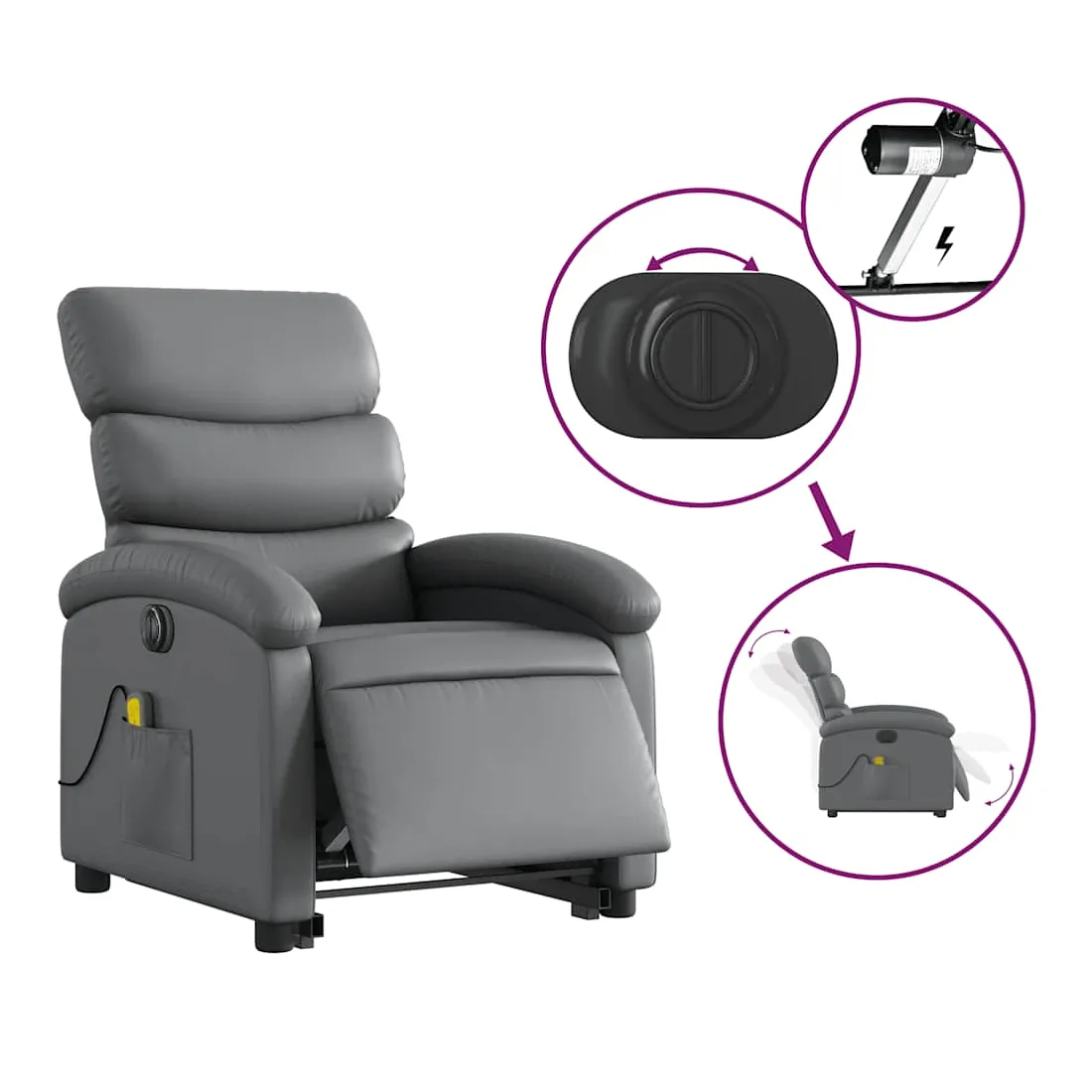 Asseyez-vous et détendez-vous dans ce fauteuil inclinable de massage électrique très confortable ! Fonction de levage électrique : ce fauteuil inclinable pour personnes âgées est équipé d'un moteur électrique pour la fonction de levage. Grâce à la fonction qui pousse toute la chaise vers le haut, vous pouvez facilement vous tenir debout sans stresser votre dos et vos genoux en appuyant simplement sur le bouton.Fonction d'inclinaison électrique : ce fauteuil inclinable est également équipé d'un moteur électrique qui permet de régler automatiquement le repose-pied et le dossier dans n'importe quelle position, selon votre confort, en appuyant simplement sur le bouton situé sur le côté du fauteuil. Cette fonction permet une inclinaison maximale de 135 degrés. En outre, le dossier peut revenir automatiquement à sa position d'origine par une simple pression sur le bouton.Fonction de vibration : les 6 points de massage vous permettent de faire l'expérience d'un massage mieux ciblé. De plus, la télécommande incluse vous permet de choisir différents programmes de massage. La fonction de massage est alimentée par le connecteur USB qui nécessite une source d'alimentation USB certifiée de 5 V (non fournie).Expérience de siège confortable : le siège, le dossier et les larges accoudoirs rembourrés épais recouverts de similicuir procurent une sensation confortable, vous faisant vous sentir enlacé lorsque vous êtes assis. Le similicuir est un matériau très résistant. Il est résistant aux taches, ce qui le rend facile à nettoyer avec un chiffon humide. La surface lisse donne également un aspect luxueux et la beauté du cuir véritable.Poche latérale pratique : ce fauteuil est doté d'une poche latérale pour ranger votre télécommande ou garder vos objets essentiels à portée de main.Cadre solide et stable : le cadre en bois et en métal offre une structure solide et une grande stabilité. Ce fauteuil inclinable est confortable et durable.