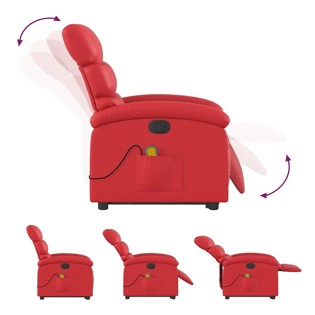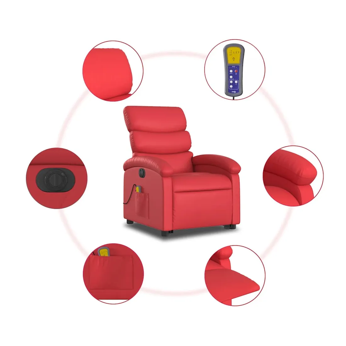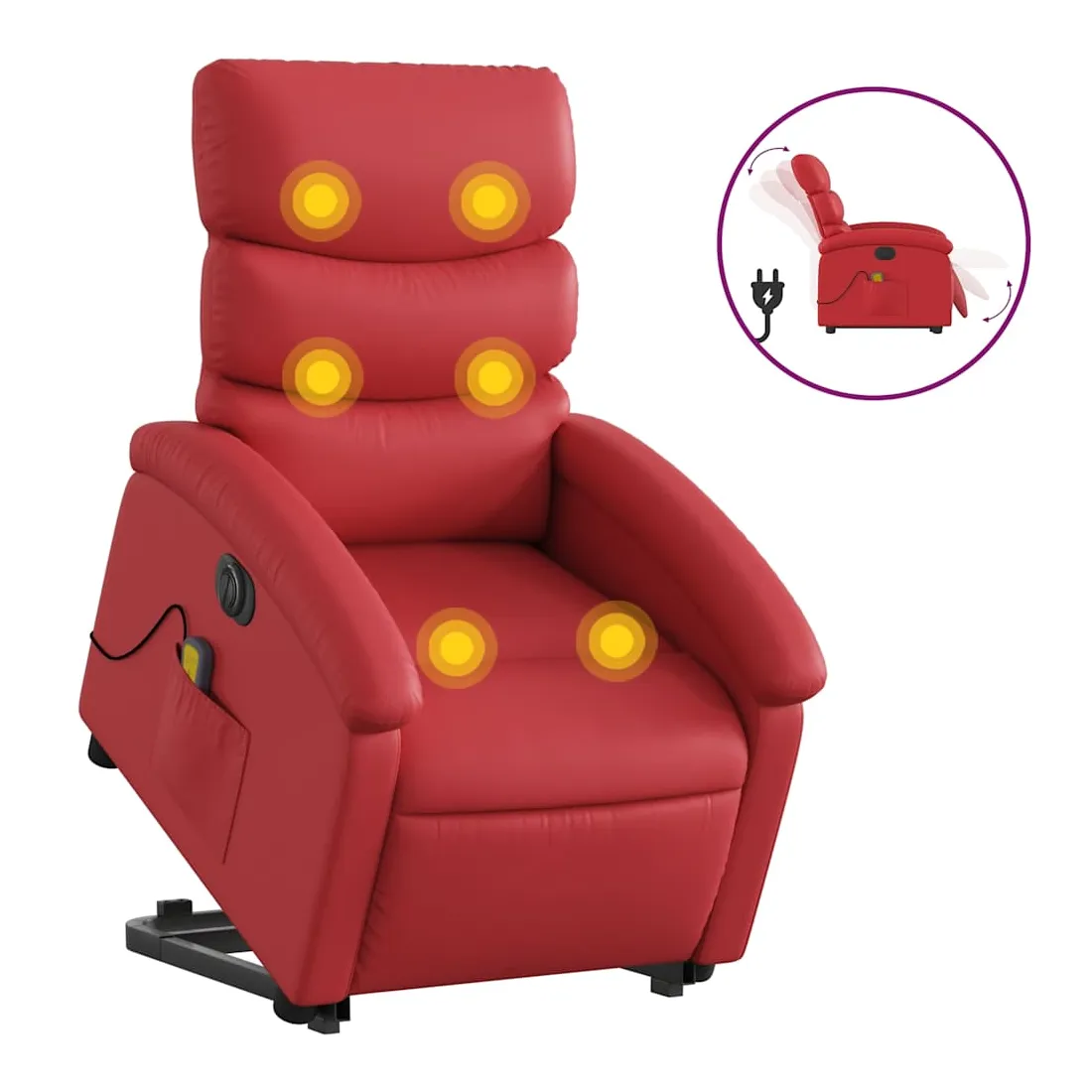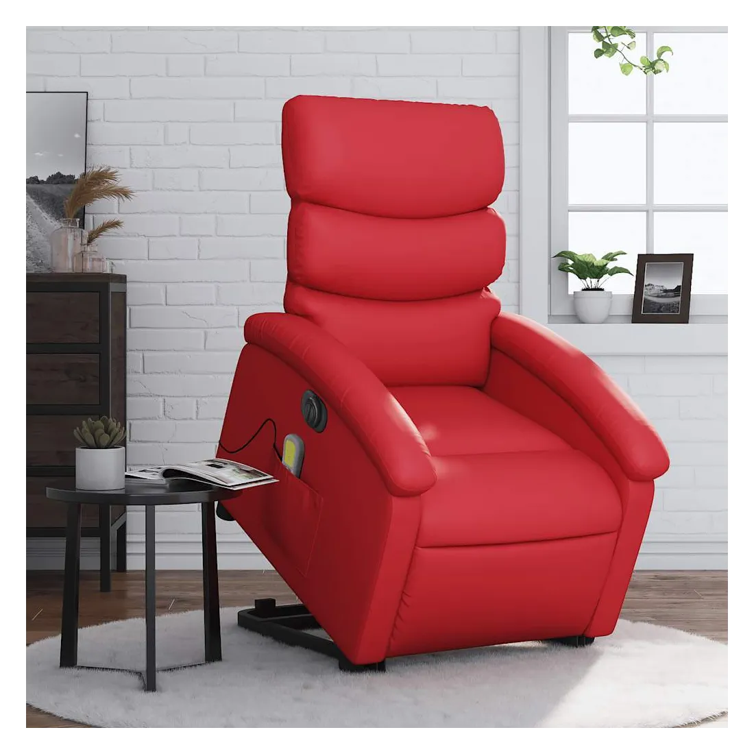 Asseyez-vous et détendez-vous dans ce fauteuil inclinable de massage électrique très confortable ! Fonction de levage électrique : ce fauteuil inclinable pour personnes âgées est équipé d'un moteur électrique pour la fonction de levage. Grâce à la fonction qui pousse toute la chaise vers le haut, vous pouvez facilement vous tenir debout sans stresser votre dos et vos genoux en appuyant simplement sur le bouton.Fonction d'inclinaison électrique : ce fauteuil inclinable est également équipé d'un moteur électrique qui permet de régler automatiquement le repose-pied et le dossier dans n'importe quelle position, selon votre confort, en appuyant simplement sur le bouton situé sur le côté du fauteuil. Cette fonction permet une inclinaison maximale de 135 degrés. En outre, le dossier peut revenir automatiquement à sa position d'origine par une simple pression sur le bouton.Fonction de vibration : les 6 points de massage vous permettent de faire l'expérience d'un massage mieux ciblé. De plus, la télécommande incluse vous permet de choisir différents programmes de massage. La fonction de massage est alimentée par le connecteur USB qui nécessite une source d'alimentation USB certifiée de 5 V (non fournie).Expérience de siège confortable : le siège, le dossier et les larges accoudoirs rembourrés épais recouverts de similicuir procurent une sensation confortable, vous faisant vous sentir enlacé lorsque vous êtes assis. Le similicuir est un matériau très résistant. Il est résistant aux taches, ce qui le rend facile à nettoyer avec un chiffon humide. La surface lisse donne également un aspect luxueux et la beauté du cuir véritable.Poche latérale pratique : ce fauteuil est doté d'une poche latérale pour ranger votre télécommande ou garder vos objets essentiels à portée de main.Cadre solide et stable : le cadre en bois et en métal offre une structure solide et une grande stabilité. Ce fauteuil inclinable est confortable et durable.