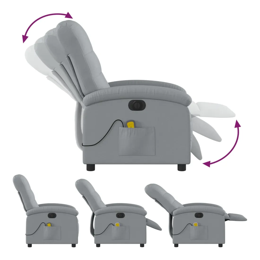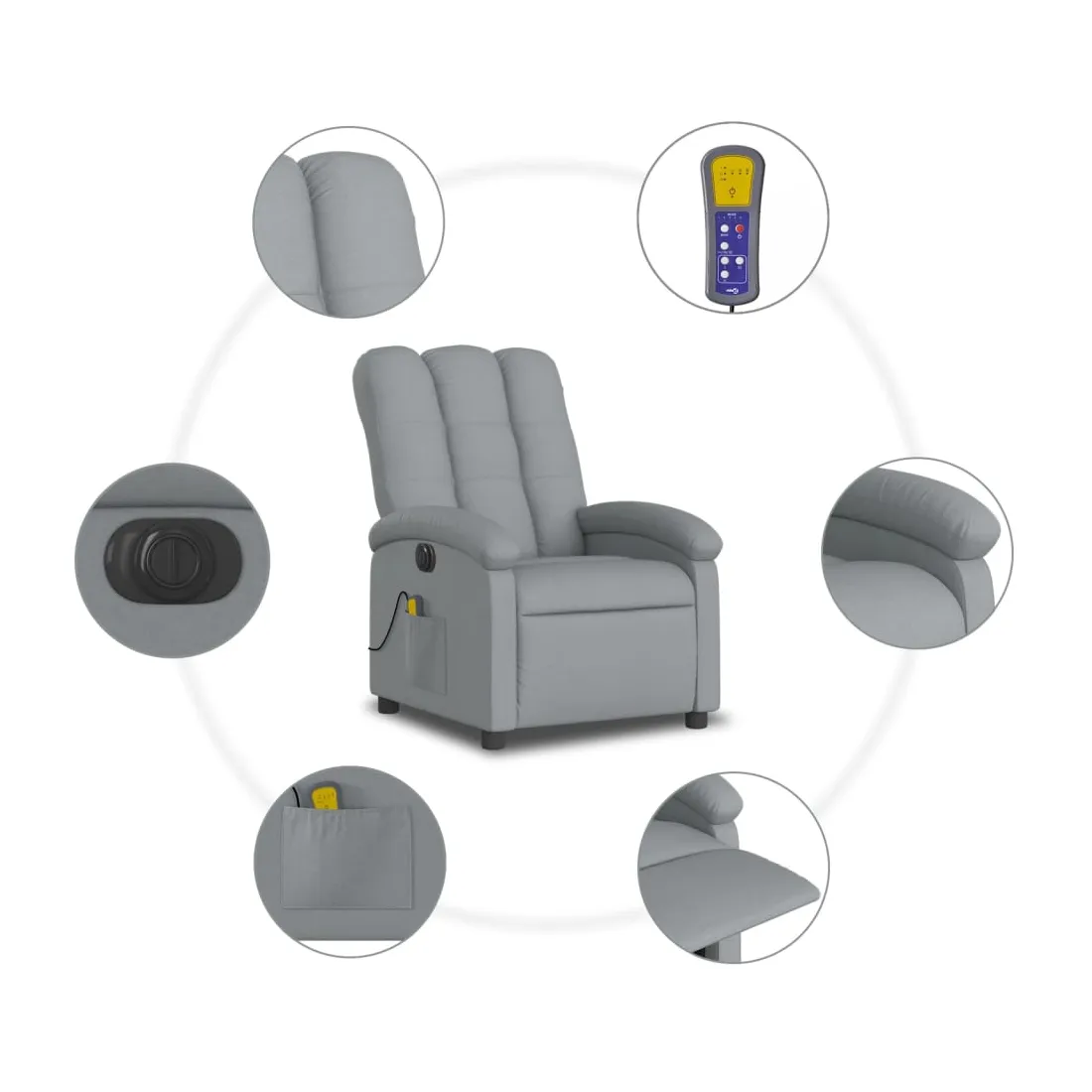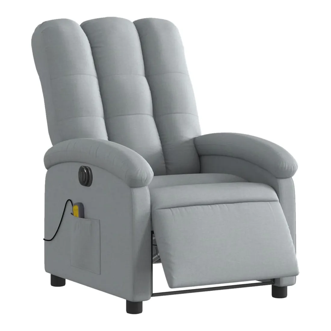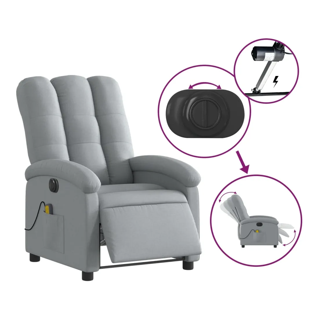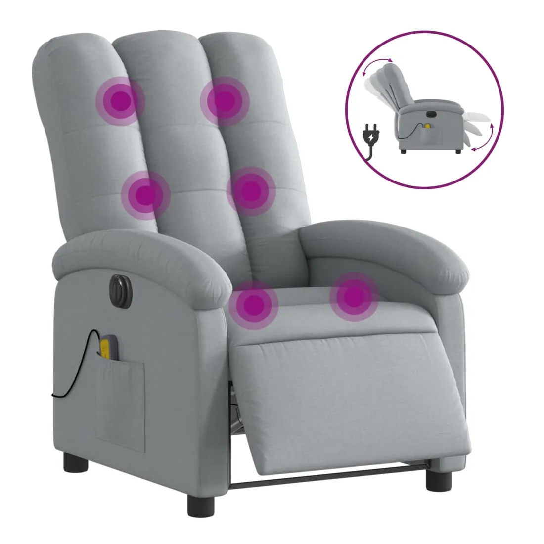 Asseyez-vous et détendez-vous dans ce fauteuil inclinable de massage électrique très confortable ! Fonction d'inclinaison électrique : ce fauteuil inclinable est équipé d'un moteur électrique qui permet de régler automatiquement le repose-pied et le dossier dans n'importe quelle position, selon votre confort, en appuyant simplement sur le bouton situé sur le côté du fauteuil. Cette fonction permet une inclinaison maximale de 135 degrés. En outre, le dossier peut revenir automatiquement à sa position d'origine par une simple pression sur le bouton.Fonction de vibration : les 6 points de massage vous permettent de faire l'expérience d'un massage mieux ciblé. De plus, la télécommande incluse vous permet de choisir différents programmes de massage. La fonction de massage est alimentée par le connecteur USB qui nécessite une source d'alimentation USB certifiée de 5 V (non fournie).Expérience d'assise confortable : le siège, le dossier et les larges accoudoirs bien rembourrés recouverts de tissu procurent une sensation confortable et chaleureuse, vous permettant de vous sentir enveloppé lorsque vous êtes assis. Le tissu présente un aspect simple et épuré et est respirant et durable.Poche latérale pratique : ce fauteuil est doté d'une poche latérale pour ranger votre télécommande ou garder vos objets essentiels à portée de main.Cadre solide et stable : le cadre en bois et en métal offre une structure solide et une grande stabilité. Ce fauteuil inclinable est confortable et durable.