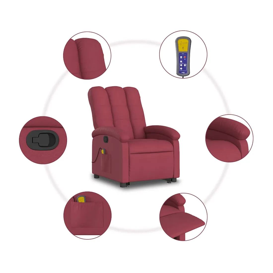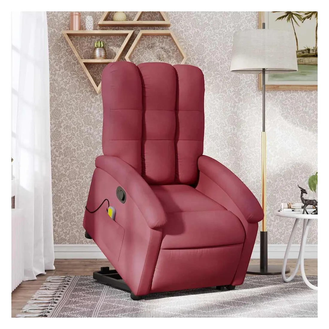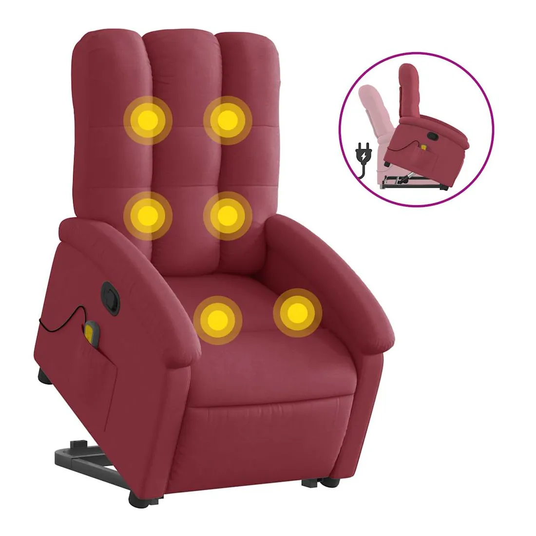 Asseyez-vous et détendez-vous dans ce fauteuil inclinable de massage très confortable ! Fonction de levage électrique : ce fauteuil inclinable pour personnes âgées est équipé d'un moteur électrique pour la fonction de levage. Grâce à la fonction qui pousse toute la chaise vers le haut, vous pouvez facilement vous tenir debout sans stresser votre dos et vos genoux en appuyant simplement sur le bouton.Fonction d'inclinaison manuelle : ce fauteuil inclinable est doté d'une poignée du côté droit. Vous pouvez régler manuellement le repose-pieds et le dossier dans n'importe quelle position selon votre confort en tirant simplement sur la poignée. Cette fonction permet une inclinaison maximale de 135 degrés. De plus, le dossier peut revenir rapidement à sa position d'origine en tirant simplement sur la poignée.Fonction de vibration : les 6 points de massage vous permettent de faire l'expérience d'un massage mieux ciblé. De plus, la télécommande incluse vous permet de choisir différents programmes de massage. La fonction de massage est alimentée par le connecteur USB qui nécessite une source d'alimentation USB certifiée de 5 V (non fournie).Expérience d'assise confortable : le siège, le dossier et les larges accoudoirs bien rembourrés recouverts de tissu procurent une sensation confortable et chaleureuse, vous permettant de vous sentir enveloppé lorsque vous êtes assis. Le tissu présente un aspect simple et épuré et est respirant et durable.Poche latérale pratique : ce fauteuil est doté d'une poche latérale pour ranger votre télécommande ou garder vos objets essentiels à portée de main.Cadre solide et stable : le cadre en bois et en métal offre une structure solide et une grande stabilité. Ce fauteuil inclinable est confortable et durable.