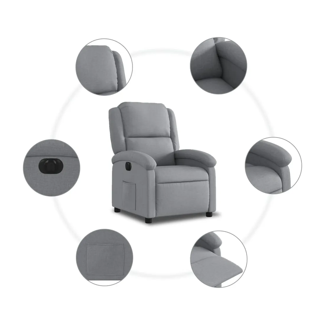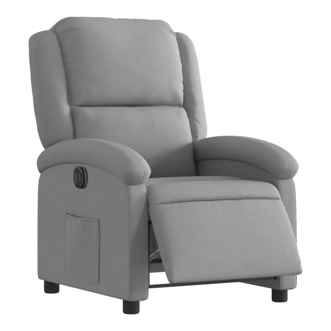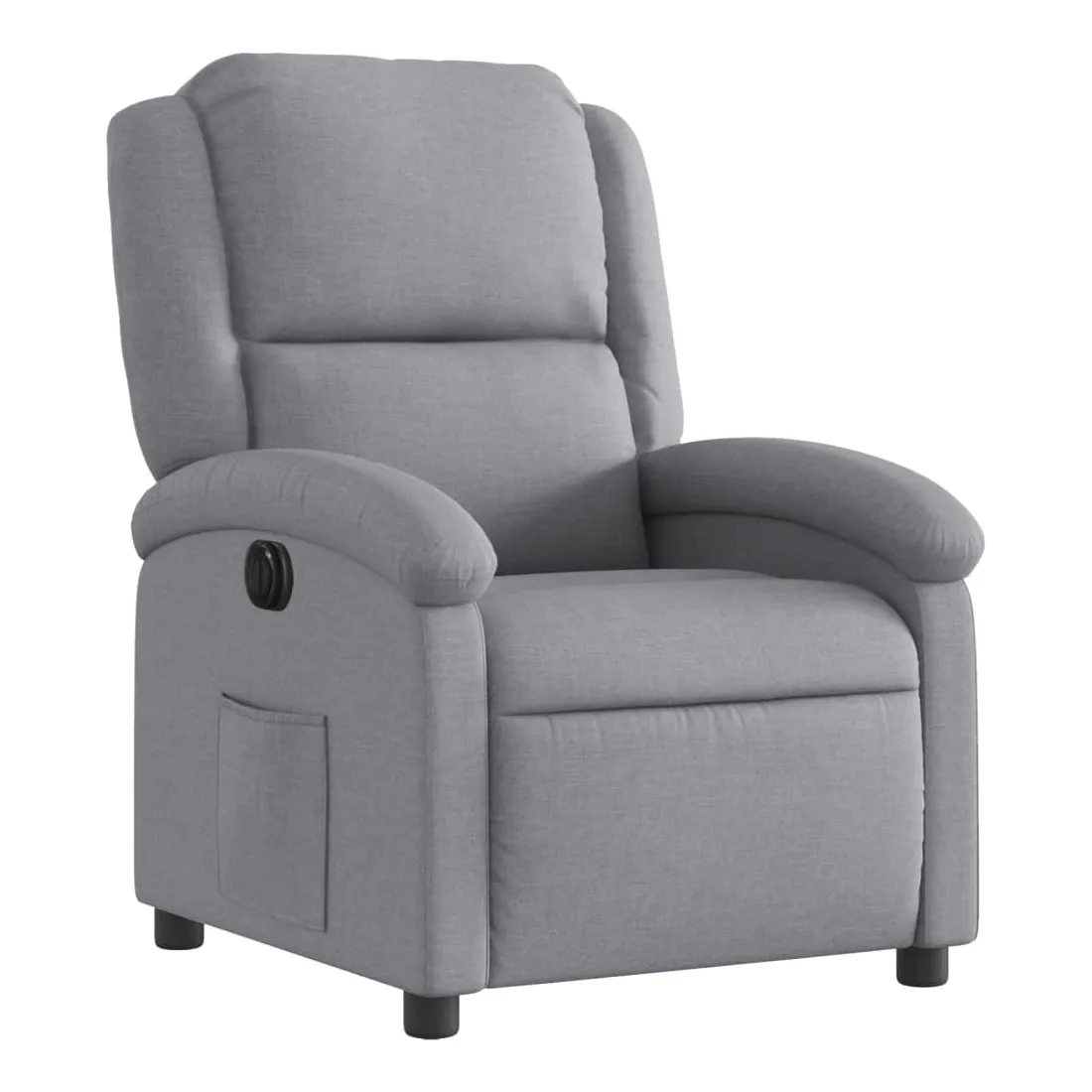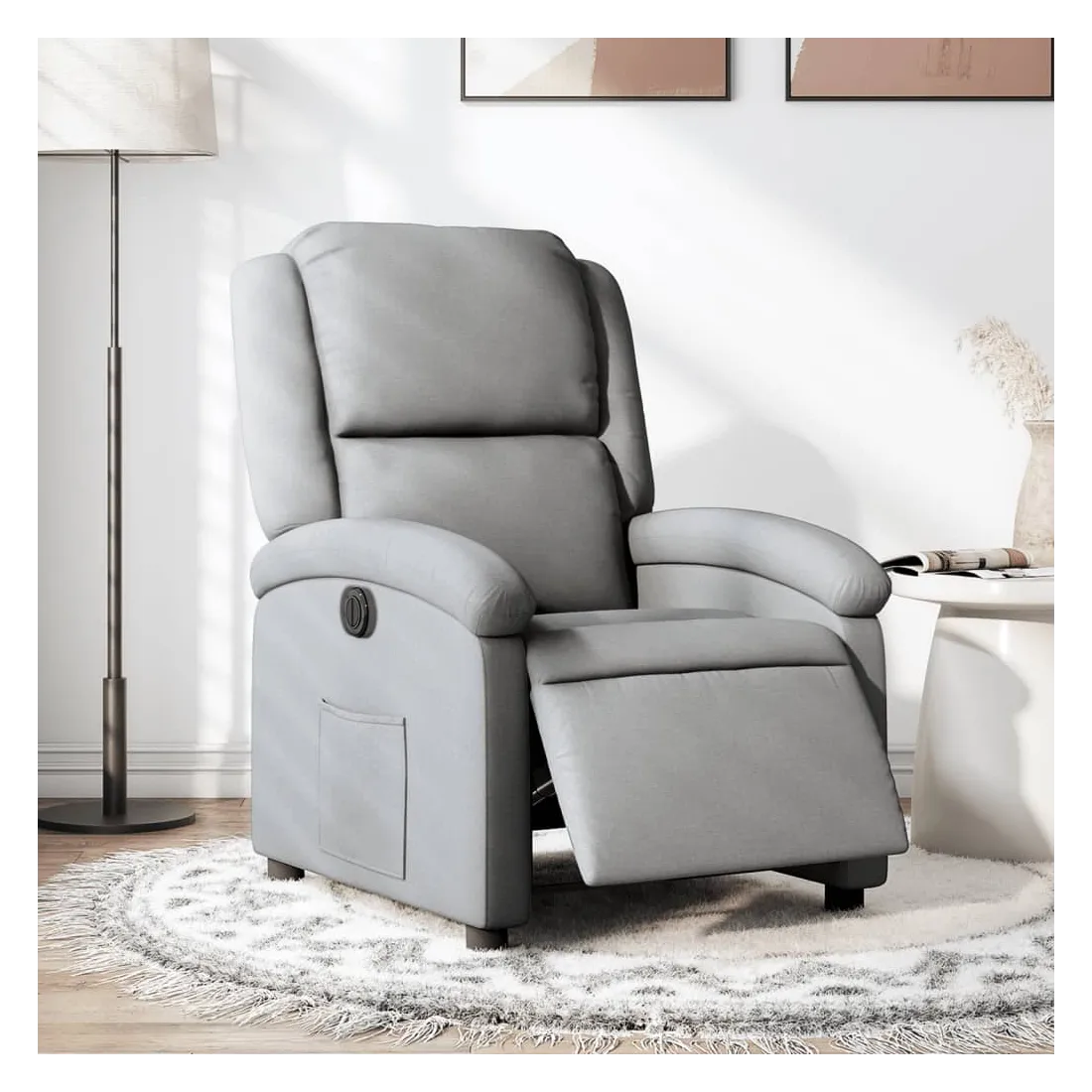 Asseyez-vous et détendez-vous dans ce fauteuil inclinable électrique très confortable ! Fonction d'inclinaison électrique : ce fauteuil inclinable est équipé d'un moteur électrique qui permet de régler automatiquement le repose-pied et le dossier dans n'importe quelle position, selon votre confort, en appuyant simplement sur le bouton situé sur le côté du fauteuil. Cette fonction permet une inclinaison maximale de 135 degrés. En outre, le dossier peut revenir automatiquement à sa position d'origine par une simple pression sur le bouton.Expérience d'assise confortable : le siège, le dossier et les larges accoudoirs bien rembourrés recouverts de tissu procurent une sensation confortable et chaleureuse, vous permettant de vous sentir enveloppé lorsque vous êtes assis. Le tissu présente un aspect simple et épuré et est respirant et durable.Poche latérale pratique : ce fauteuil est doté d'une poche latérale pour vous permettre de garder vos objets essentiels à portée de main.Cadre solide et stable : le cadre en bois et en métal offre une structure solide et une grande stabilité. Ce fauteuil inclinable est confortable et durable.