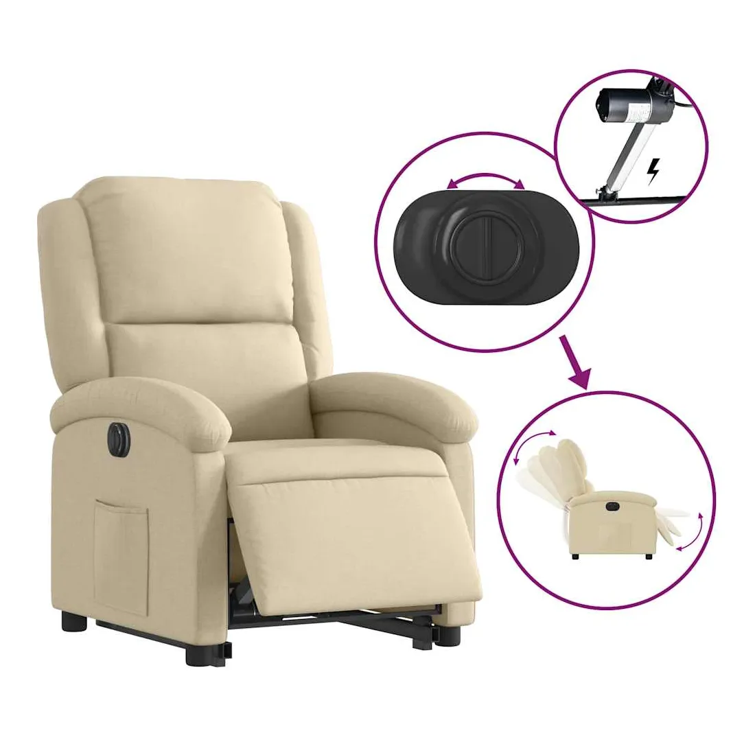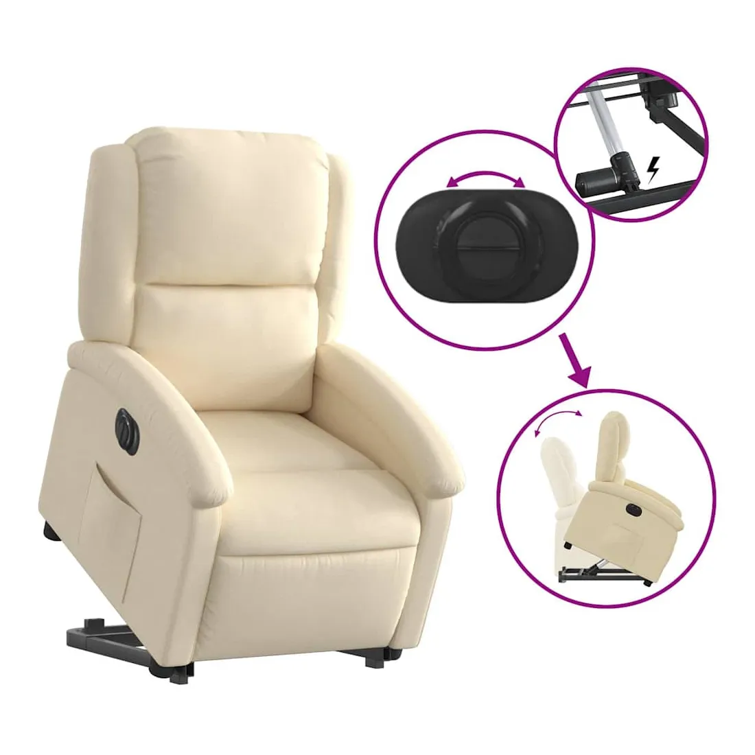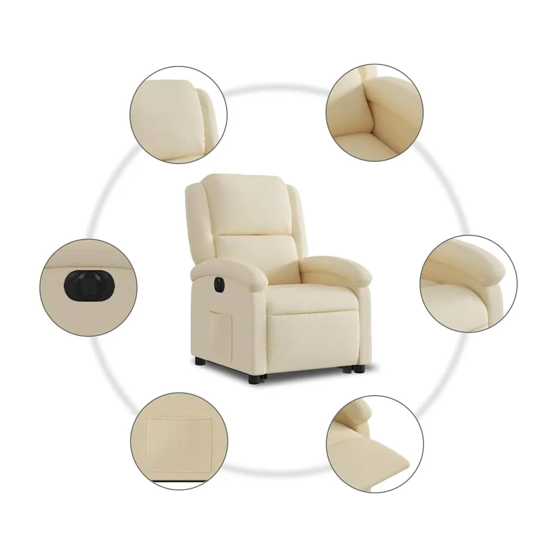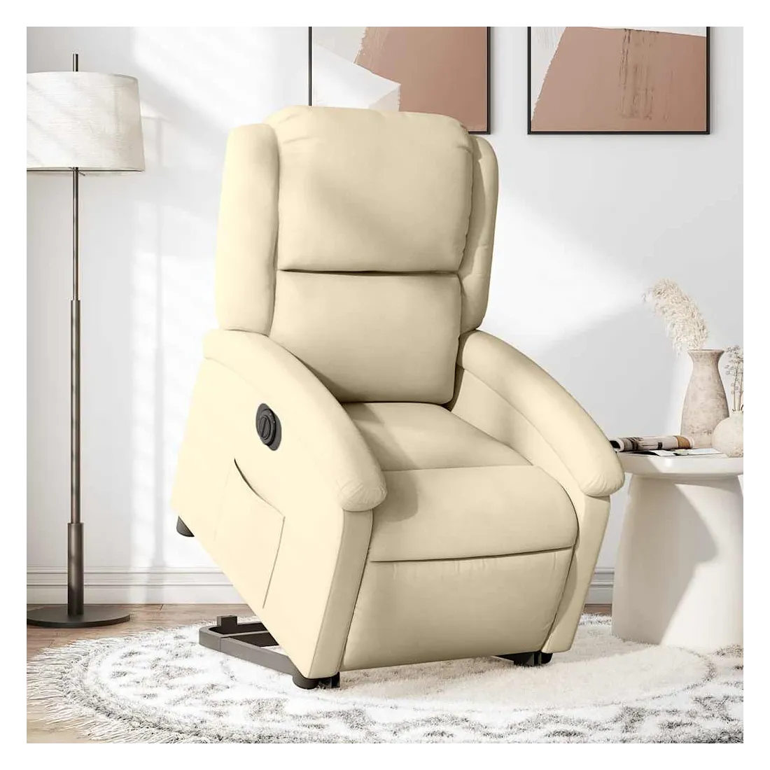 Asseyez-vous et détendez-vous dans ce fauteuil inclinable électrique très confortable ! Fonction de levage électrique : ce fauteuil inclinable pour personnes âgées est équipé d'un moteur électrique pour la fonction de levage. Grâce à la fonction qui pousse toute la chaise vers le haut, vous pouvez facilement vous tenir debout sans stresser votre dos et vos genoux en appuyant simplement sur le bouton.Fonction d'inclinaison électrique : ce fauteuil inclinable est également équipé d'un moteur électrique qui permet de régler automatiquement le repose-pied et le dossier dans n'importe quelle position, selon votre confort, en appuyant simplement sur le bouton situé sur le côté du fauteuil. Cette fonction permet une inclinaison maximale de 135 degrés. En outre, le dossier peut revenir automatiquement à sa position d'origine par une simple pression sur le bouton.Expérience d'assise confortable : le siège, le dossier et les larges accoudoirs bien rembourrés recouverts de tissu procurent une sensation confortable et chaleureuse, vous permettant de vous sentir enveloppé lorsque vous êtes assis. Le tissu présente un aspect simple et épuré et est respirant et durable.Poche latérale pratique : ce fauteuil est doté d'une poche latérale pour vous permettre de garder vos objets essentiels à portée de main.Cadre solide et stable : le cadre en bois et en métal offre une structure solide et une grande stabilité. Ce fauteuil inclinable est confortable et durable.