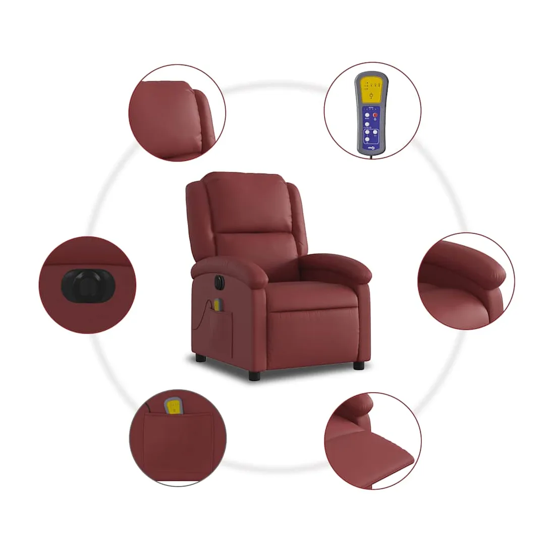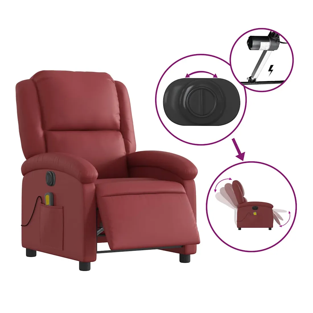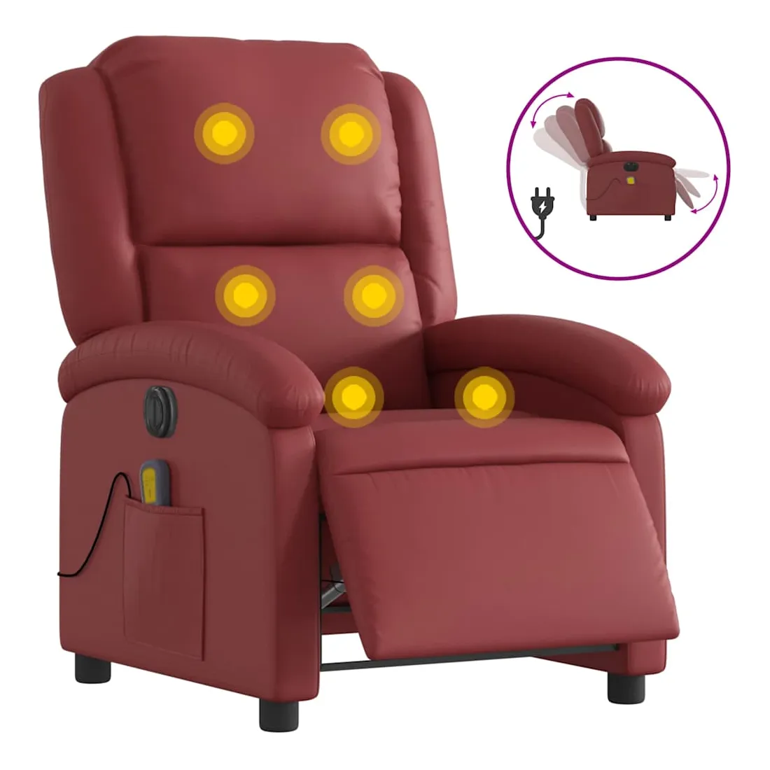 Asseyez-vous et détendez-vous dans ce fauteuil inclinable de massage électrique très confortable ! Fonction d'inclinaison électrique : ce fauteuil inclinable est équipé d'un moteur électrique qui permet de régler automatiquement le repose-pied et le dossier dans n'importe quelle position, selon votre confort, en appuyant simplement sur le bouton situé sur le côté du fauteuil. Cette fonction permet une inclinaison maximale de 135 degrés. En outre, le dossier peut revenir automatiquement à sa position d'origine par une simple pression sur le bouton.Fonction de vibration : les 6 points de massage vous permettent de faire l'expérience d'un massage mieux ciblé. De plus, la télécommande incluse vous permet de choisir différents programmes de massage. La fonction de massage est alimentée par le connecteur USB qui nécessite une source d'alimentation USB certifiée de 5 V (non fournie).Expérience de siège confortable : le siège, le dossier et les larges accoudoirs rembourrés épais recouverts de similicuir procurent une sensation confortable, vous faisant vous sentir enlacé lorsque vous êtes assis. Le similicuir est un matériau très résistant. Il est résistant aux taches, ce qui le rend facile à nettoyer avec un chiffon humide. La surface lisse donne également un aspect luxueux et la beauté du cuir véritable.Poche latérale pratique : ce fauteuil est doté d'une poche latérale pour ranger votre télécommande ou garder vos objets essentiels à portée de main.Cadre solide et stable : le cadre en bois et en métal offre une structure solide et une grande stabilité. Ce fauteuil inclinable est confortable et durable.