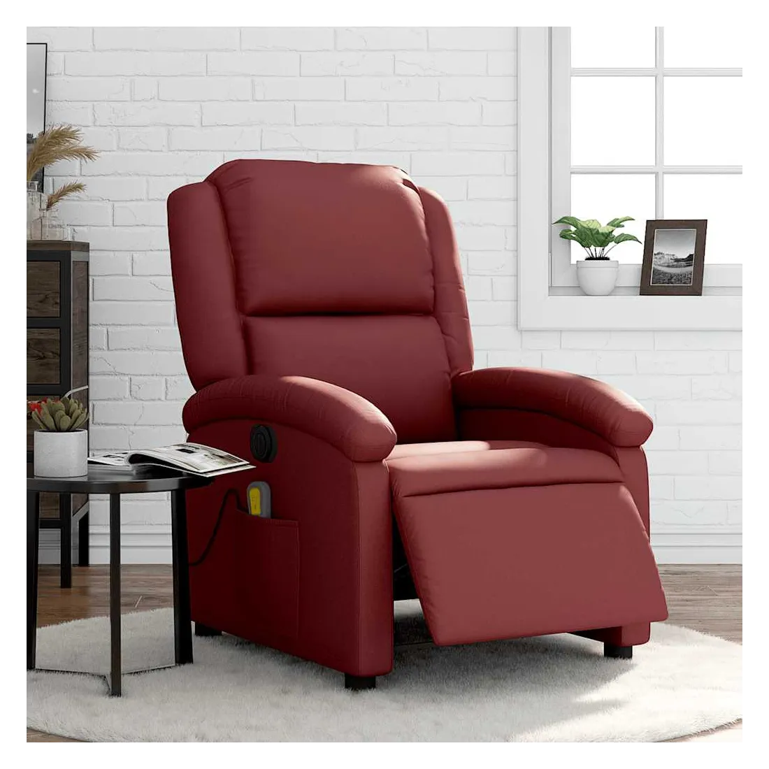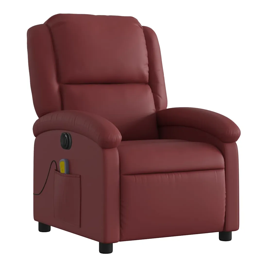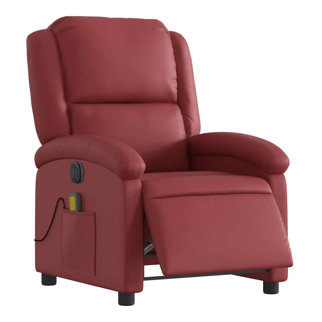 Asseyez-vous et détendez-vous dans ce fauteuil inclinable de massage électrique très confortable ! Fonction d'inclinaison électrique : ce fauteuil inclinable est équipé d'un moteur électrique qui permet de régler automatiquement le repose-pied et le dossier dans n'importe quelle position, selon votre confort, en appuyant simplement sur le bouton situé sur le côté du fauteuil. Cette fonction permet une inclinaison maximale de 135 degrés. En outre, le dossier peut revenir automatiquement à sa position d'origine par une simple pression sur le bouton.Fonction de vibration : les 6 points de massage vous permettent de faire l'expérience d'un massage mieux ciblé. De plus, la télécommande incluse vous permet de choisir différents programmes de massage. La fonction de massage est alimentée par le connecteur USB qui nécessite une source d'alimentation USB certifiée de 5 V (non fournie).Expérience de siège confortable : le siège, le dossier et les larges accoudoirs rembourrés épais recouverts de similicuir procurent une sensation confortable, vous faisant vous sentir enlacé lorsque vous êtes assis. Le similicuir est un matériau très résistant. Il est résistant aux taches, ce qui le rend facile à nettoyer avec un chiffon humide. La surface lisse donne également un aspect luxueux et la beauté du cuir véritable.Poche latérale pratique : ce fauteuil est doté d'une poche latérale pour ranger votre télécommande ou garder vos objets essentiels à portée de main.Cadre solide et stable : le cadre en bois et en métal offre une structure solide et une grande stabilité. Ce fauteuil inclinable est confortable et durable.